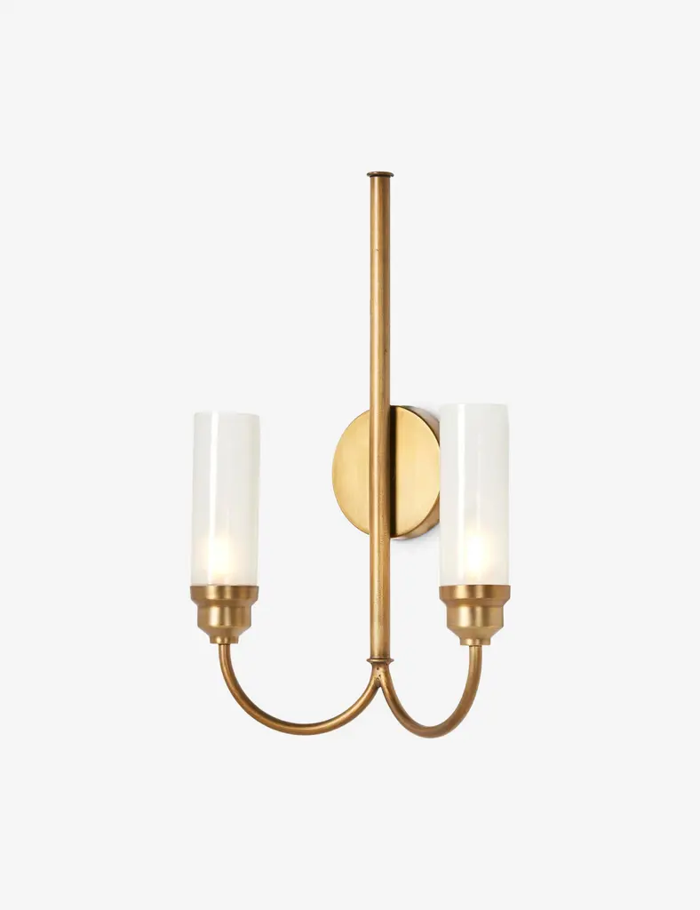 Borrowing from traditional design to create a modern statement, this sconce is a brilliant addition to your lighting design. Its dramatic, J-shaped framework pairs with a round wall plate and brass finish while light pours through a pair of frosted glass shades to bring warmth and ambiance to your entryway or living spacea standout sconce light set for elegance.