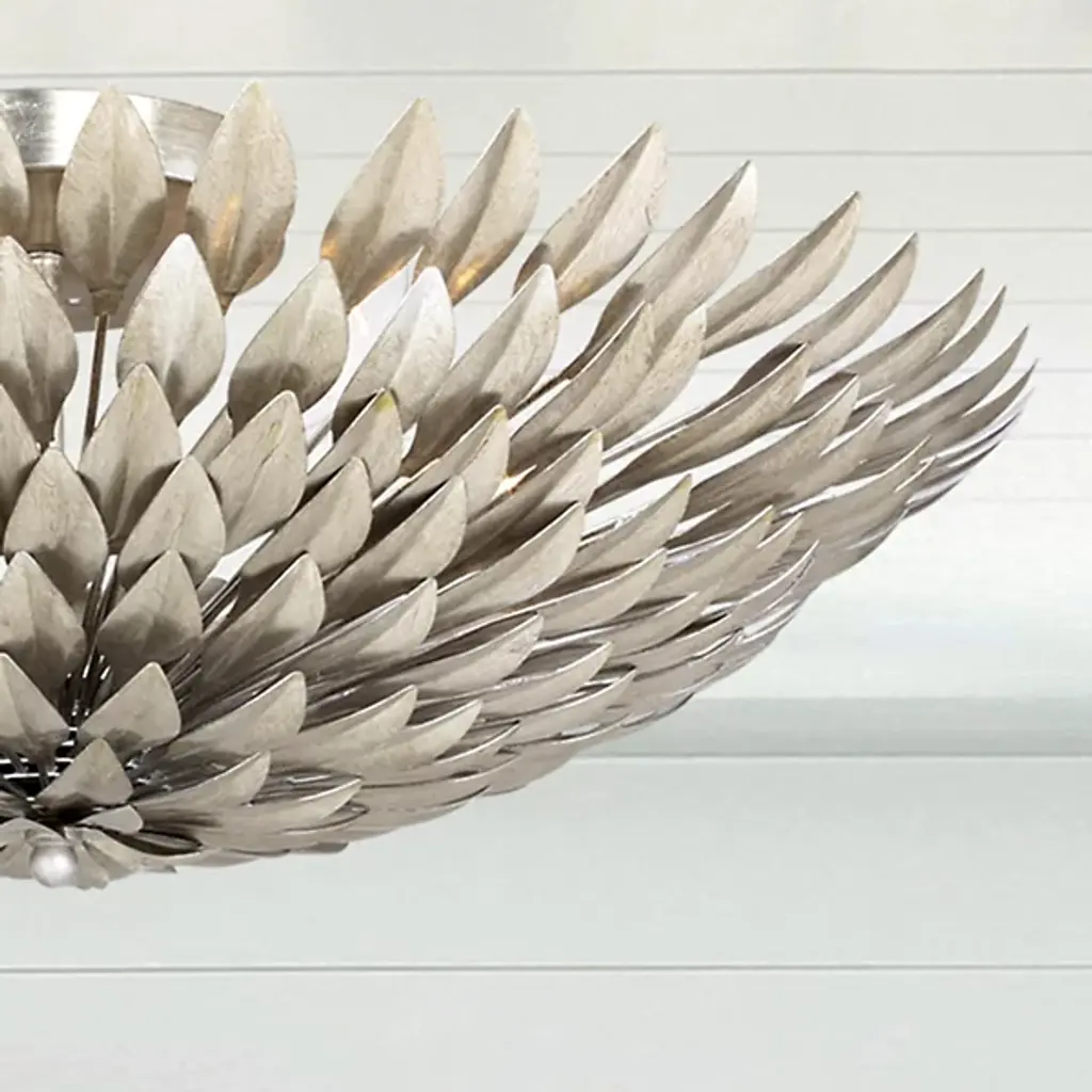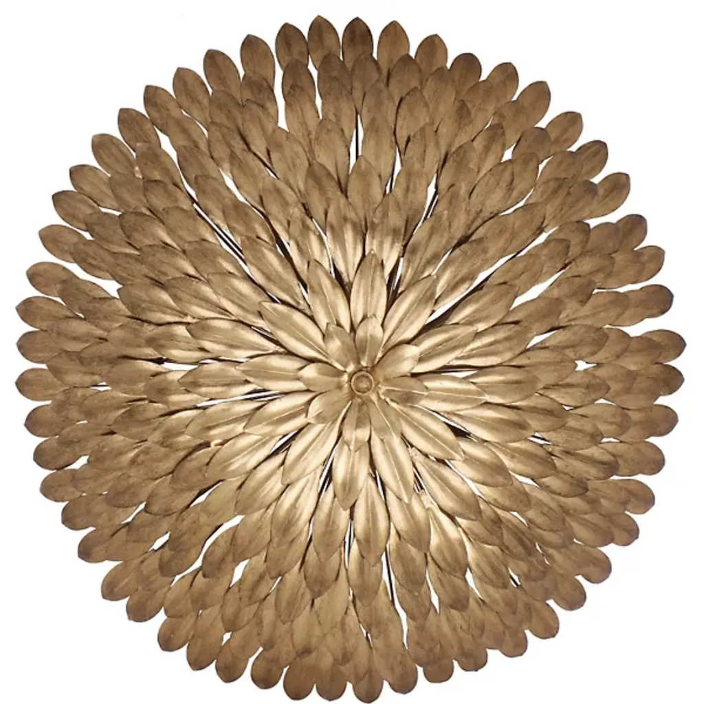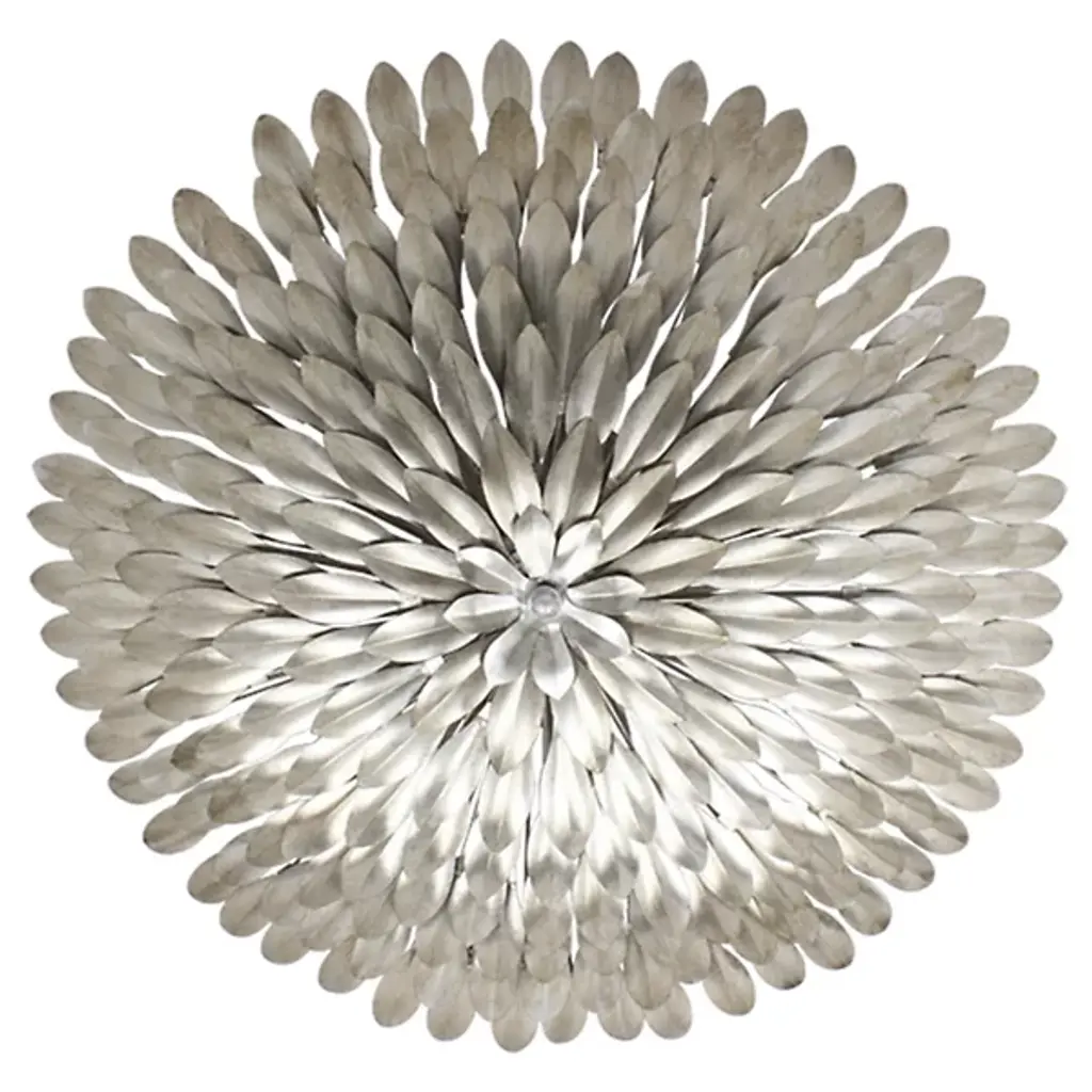 The Crystorama Broche Large Wall Sconce/Flushmount takes its inspiration from an actual flea market find in France. An assembly of hand painted Wrought Iron leaves combine to create a simple yet elegant form. The delicate leaves are completed with a lustrous metal foil application, this fixture is finished off with a decorative flower for a little visual interest.