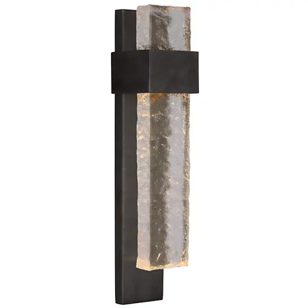 A contemporary presence is accentuated by an elegant organic note. The Brock LED Wall Sconce from Visual Comfort Signature, formerly known as Visual Comfort, relies on a slender rectangular wall plate to secure itself to its mounting surface, setting damp-listed and energy-efficient LED lamping inside a small horizontal bracket that rounds its upper end. This lamping is gentled by a thick bar of clear wavy glass that extends down along the wall plate, blunting bright glare into a pleasant, lambent glow that extends out across the fixture’s surroundings.