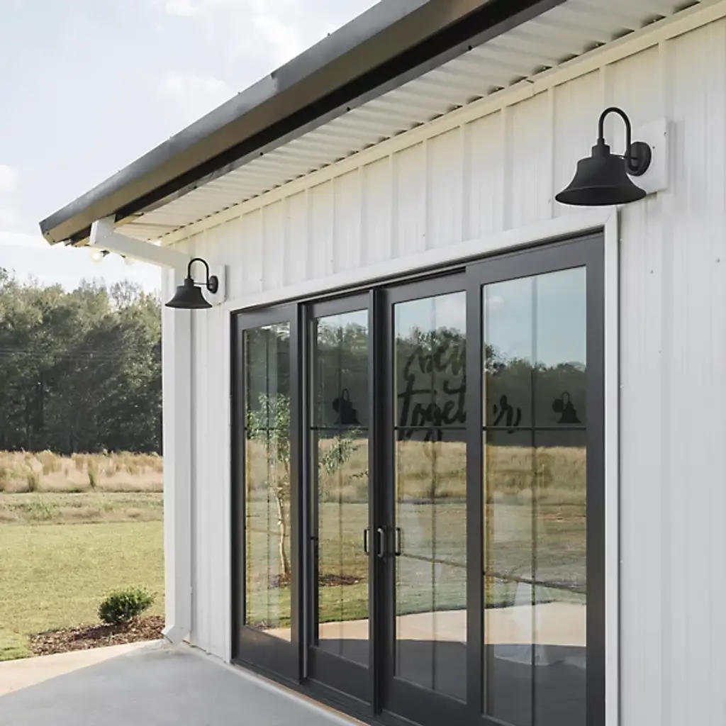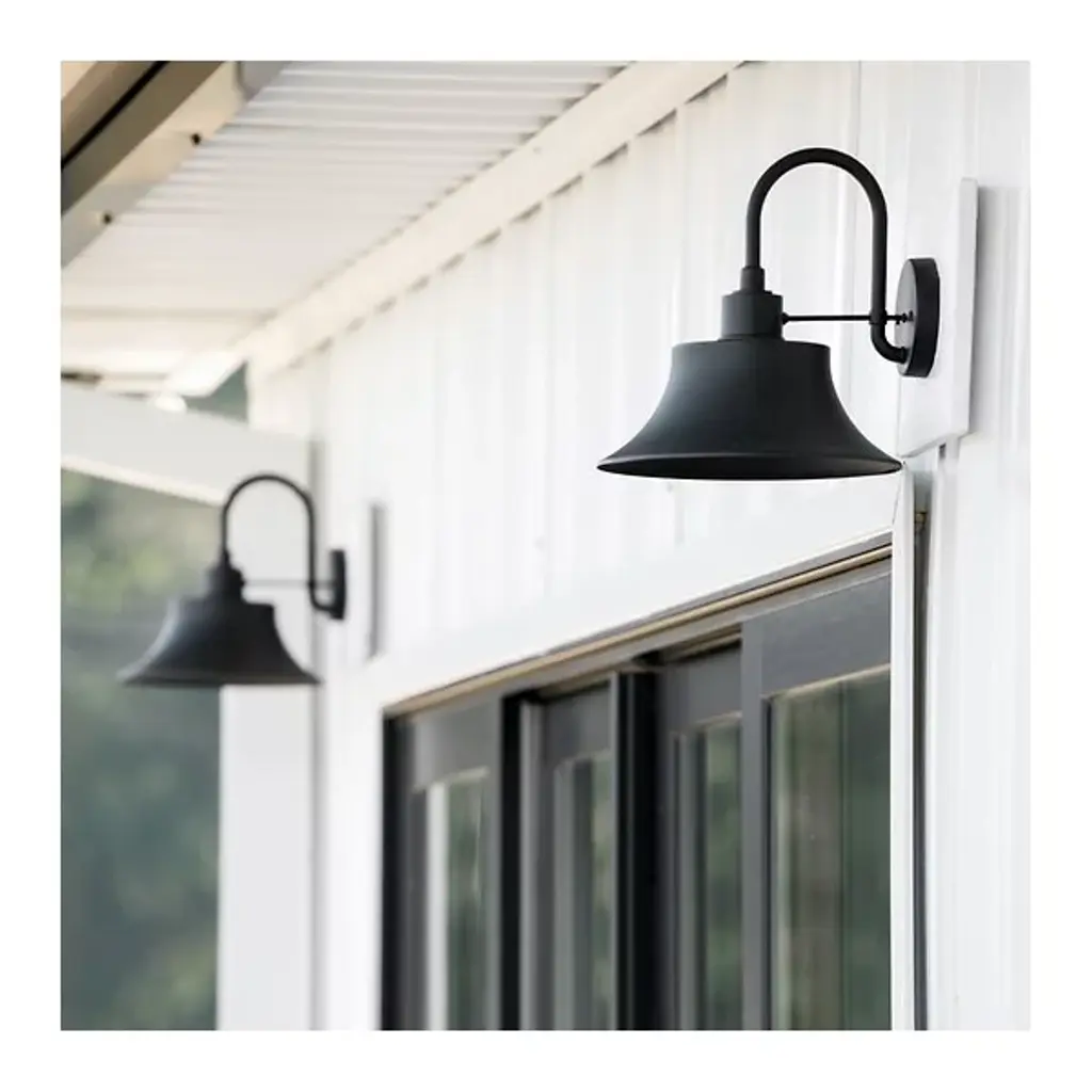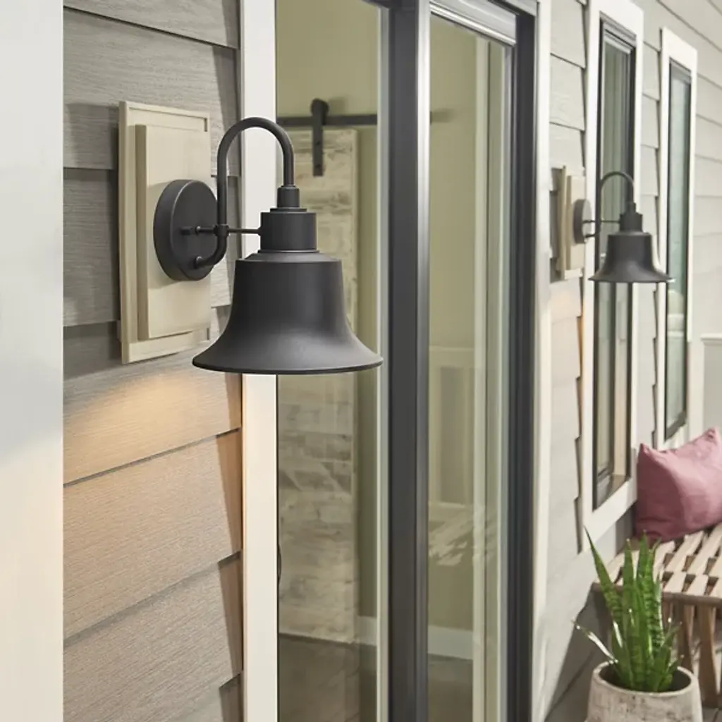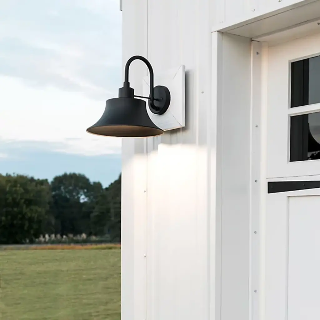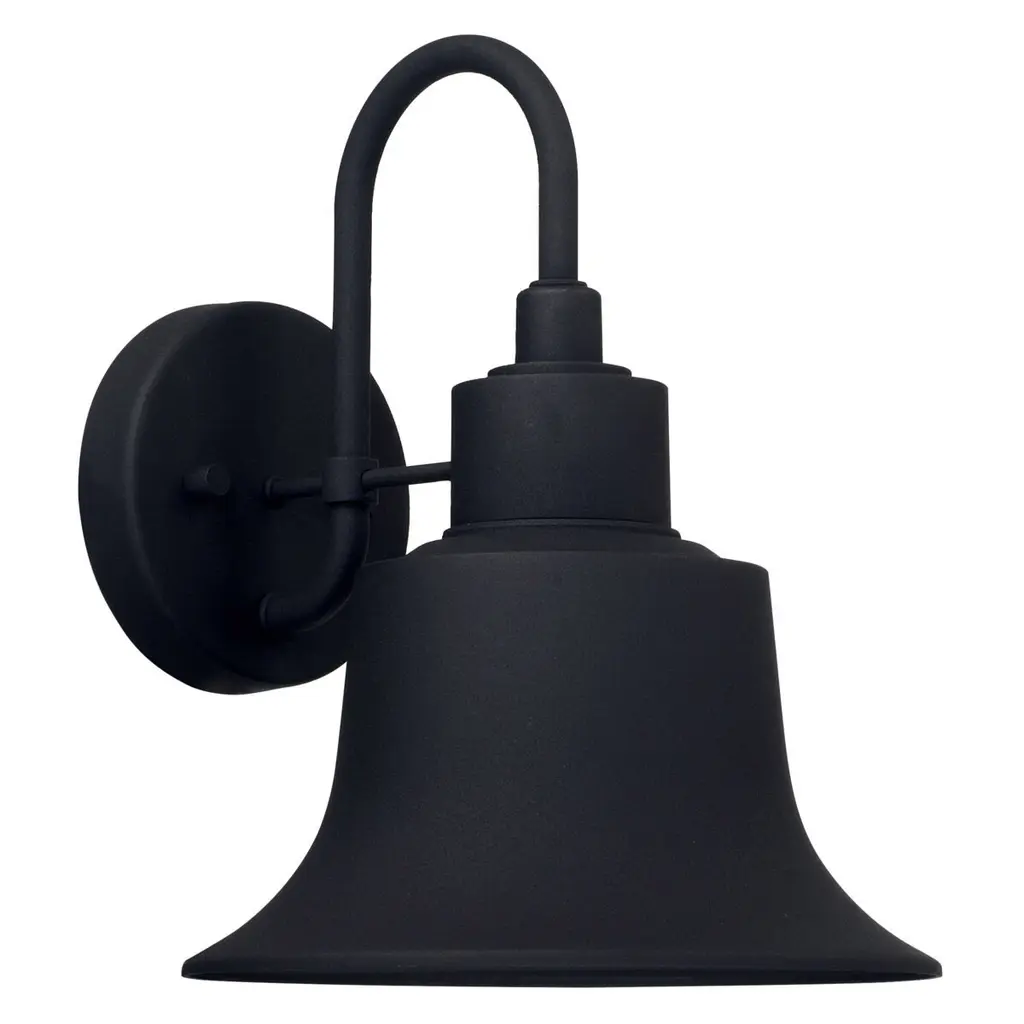 The Brock Outdoor Wall Sconce from Capital Lighting brings traditional charm that elevates outdoor spaces. A tall U-shaped curve elegantly bridges its neat circular backplate and faceted lamp holder with a gorgeous arch. From it, a metal bell shade flares out in gradual layers to produce an elegant contour. The design of the shade funnels the warm, glowing light in a downward direction while also helping to reduce unwanted glare.
