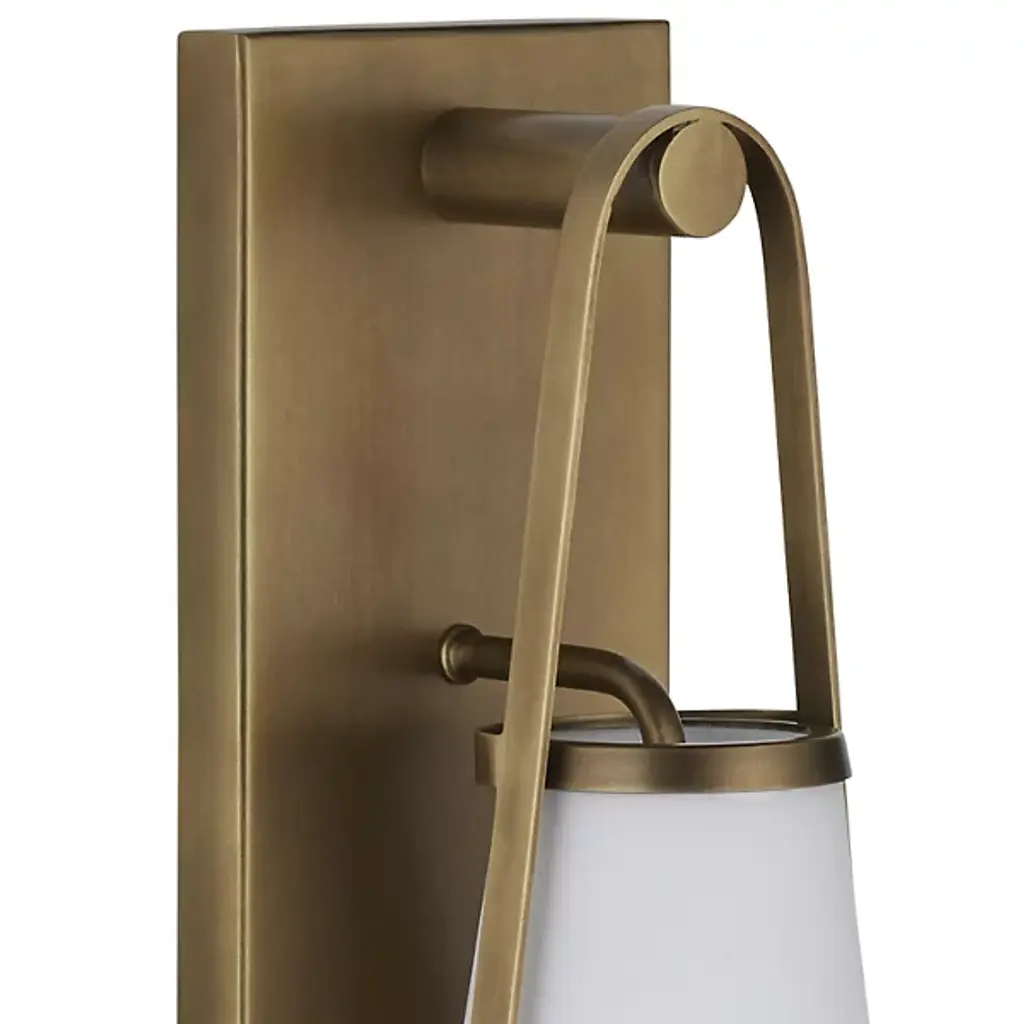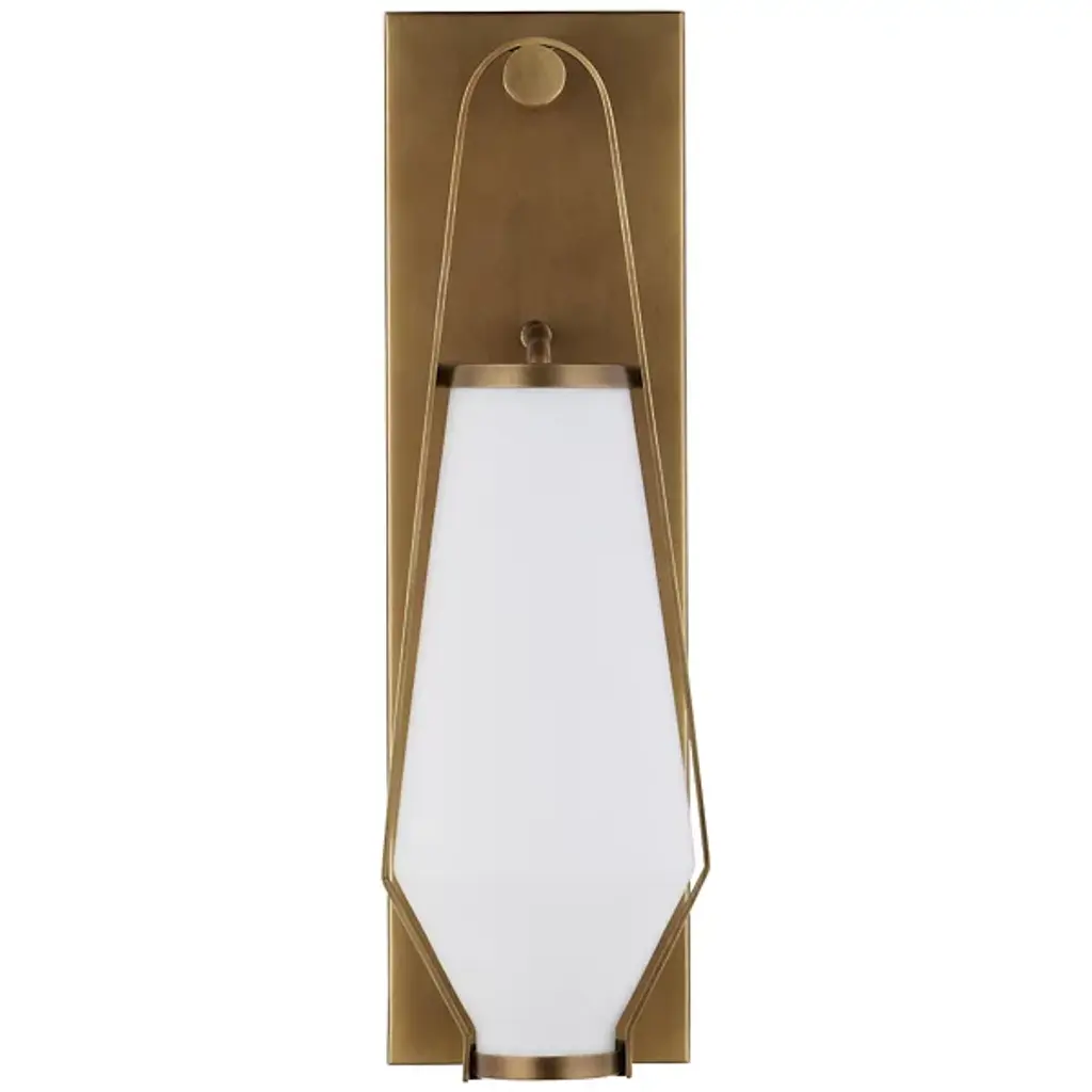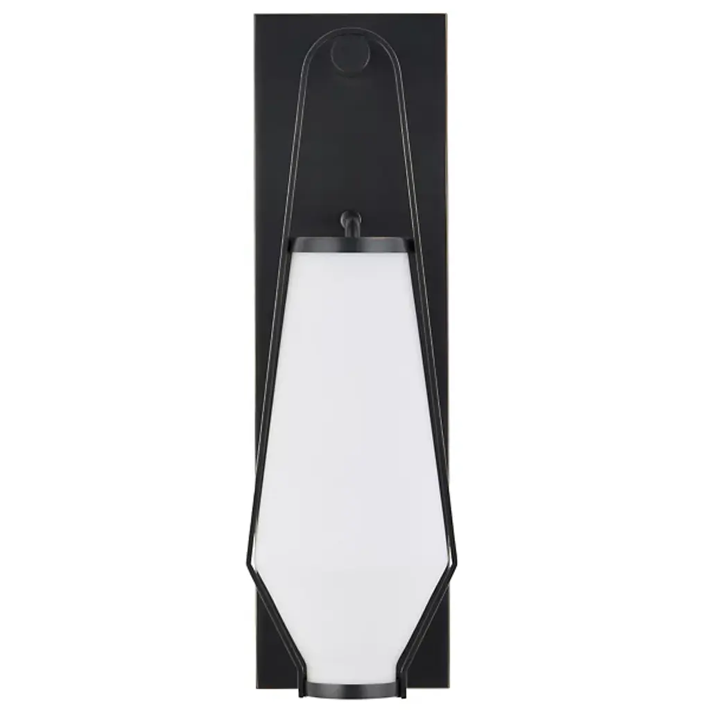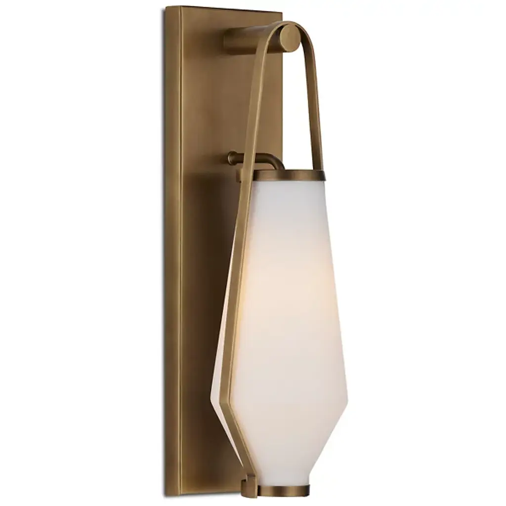 The Brompton Wall Sconce from Currey & Company uses a slim rectangular wall plate made from wrought iron to elevate a vintage lantern form. The design suspends its lamping via a slim, bracket-style suspension, with knob and handle accents finished to match, and cradling a damp-listed lamp inside a curving shade of opaque glass. This arrangement frames the glass and sheds a soft, luminous glow, combining transitional style with Mid-Century Modern elements, adding simple elegance and modernity to any wall.