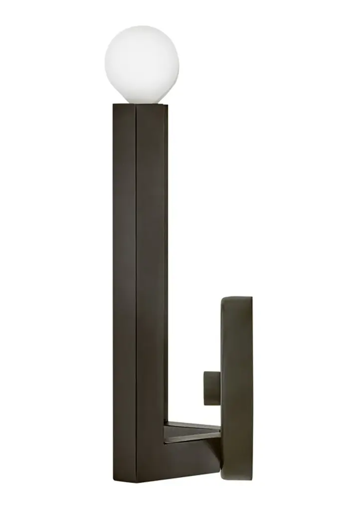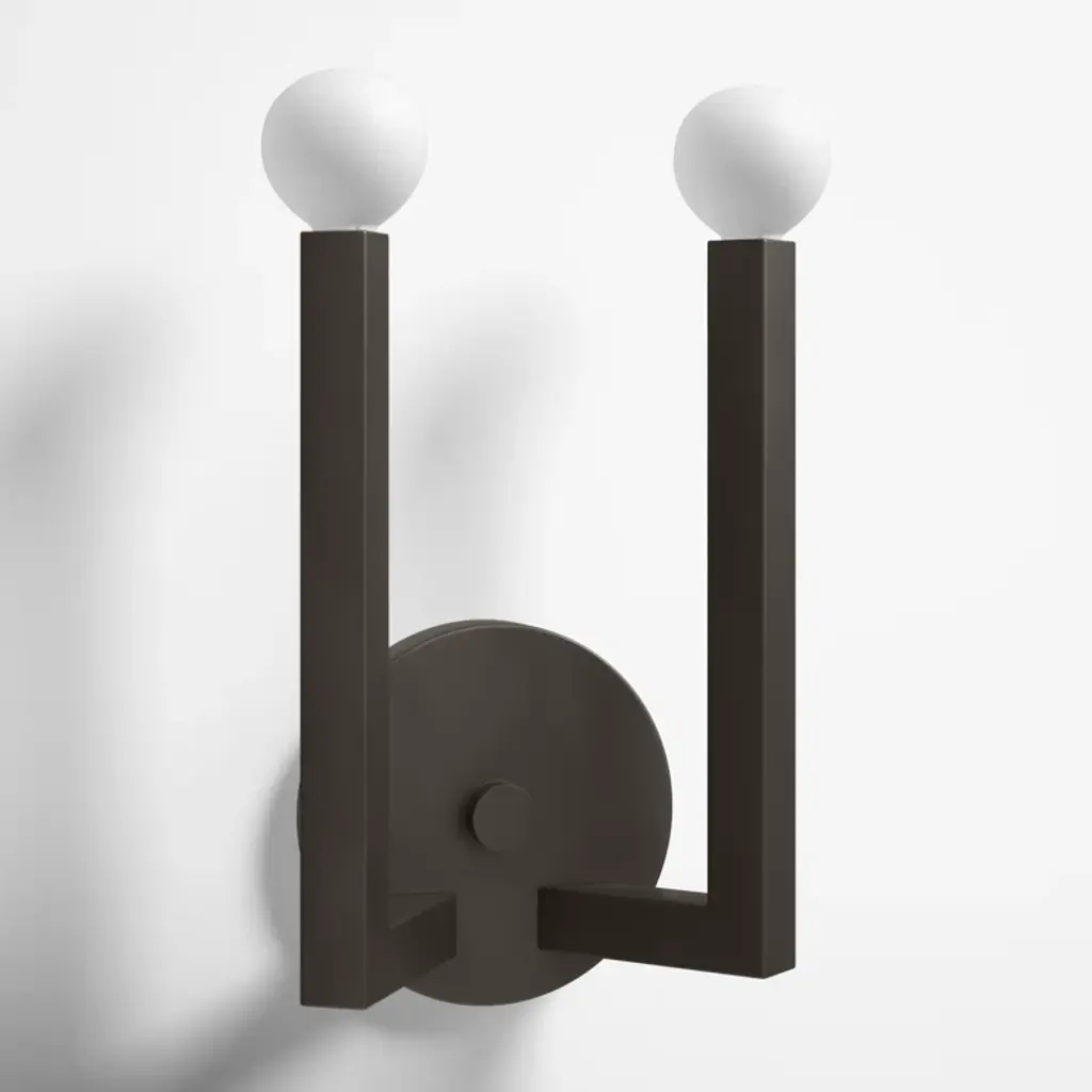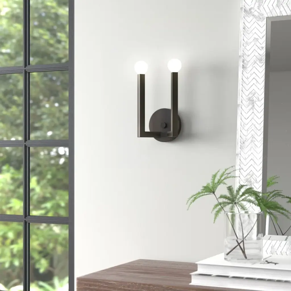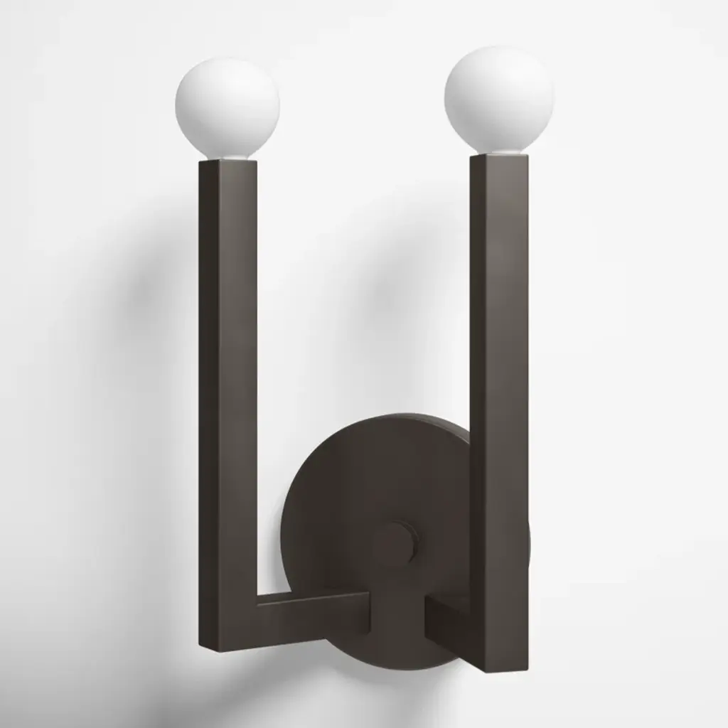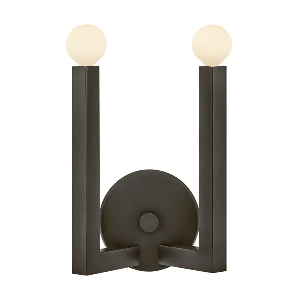 This Two-Light Indoor Wall Sconce pairs Minimalist elegance with an industrial edge, available in smoky Black Oxide or a warm, textured Heritage Brass finish. This light fixture features a pair of strong, L-Shaped arms that reach upwards from a round backplate at a unique angle. Illuminated by (2) 5w Candelabra LED bulbs (not included), round out the Mid-Century Modern with globe-style bulbs. Add depth to dining rooms, foyers, kitchens, bedrooms, or home offices.