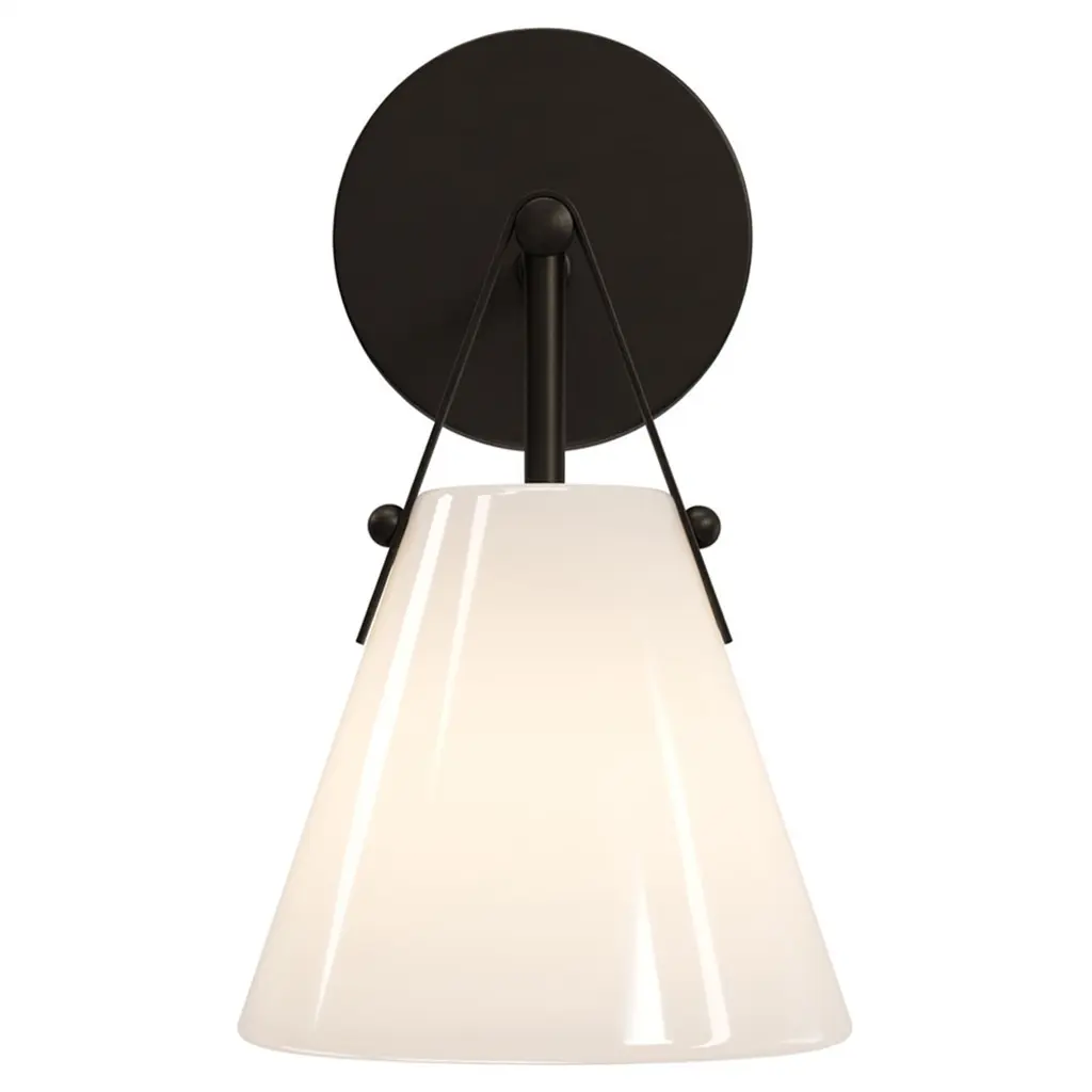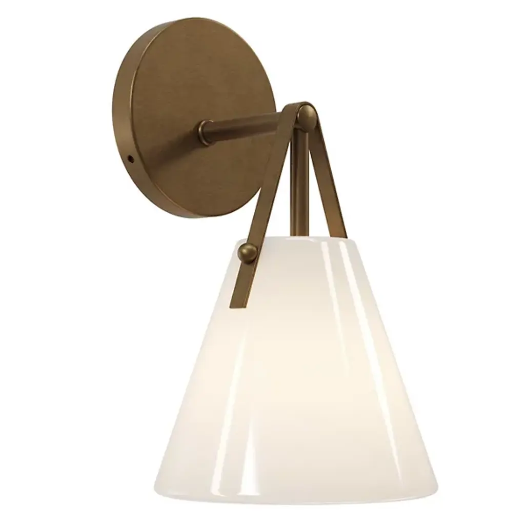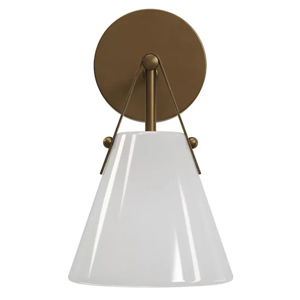 The Bronwen Bath Wall Sconce from Currey & Company draws inspiration from equestrian hardware through its strap detail. A metal band secures the flared glass shade to the circular mounting plate, subtly referencing classic tack elements. The glossy surface of the shade creates a soft glow when lit, while the metal provides visual contrast. With dimmable functionality, this wall sconce works across multiple design aesthetics, from modern farmhouse to transitional spaces. Perfect for bathrooms where both style and function matter, the piece delivers practical lighting while adding character through its unique hardware-inspired design.