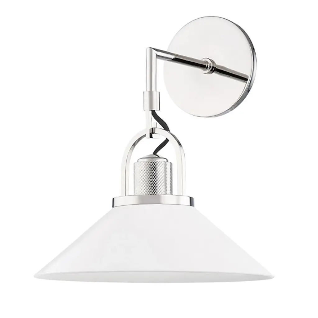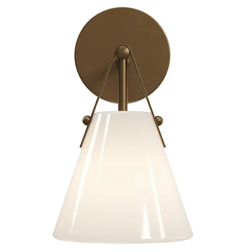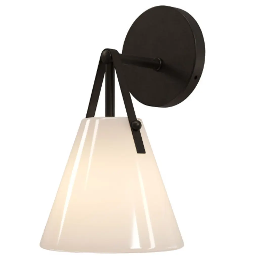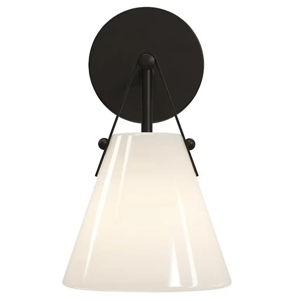 The Bronwen Bath Wall Sconce from Currey & Company draws inspiration from equestrian hardware through its strap detail. A metal band secures the flared glass shade to the circular mounting plate, subtly referencing classic tack elements. The glossy surface of the shade creates a soft glow when lit, while the metal provides visual contrast. With dimmable functionality, this wall sconce works across multiple design aesthetics, from modern farmhouse to transitional spaces. Perfect for bathrooms where both style and function matter, the piece delivers practical lighting while adding character through its unique hardware-inspired design.