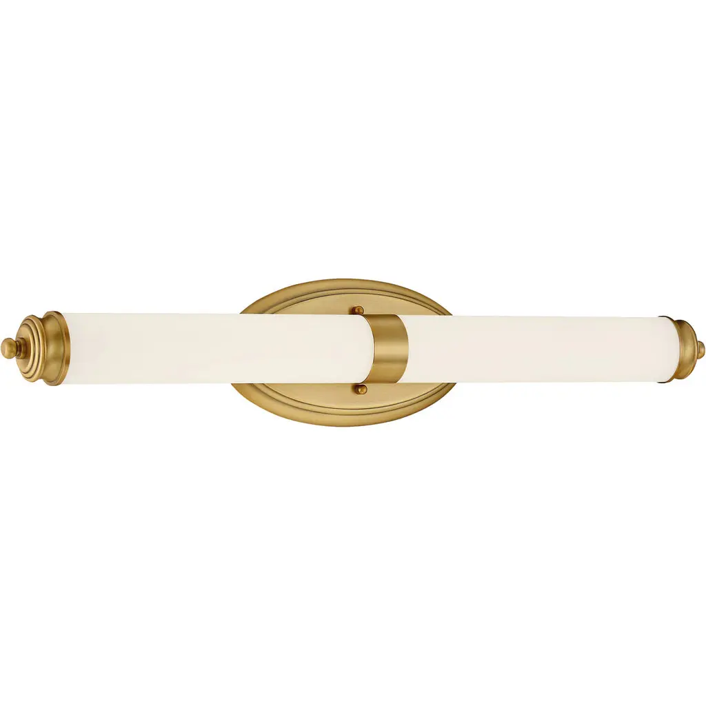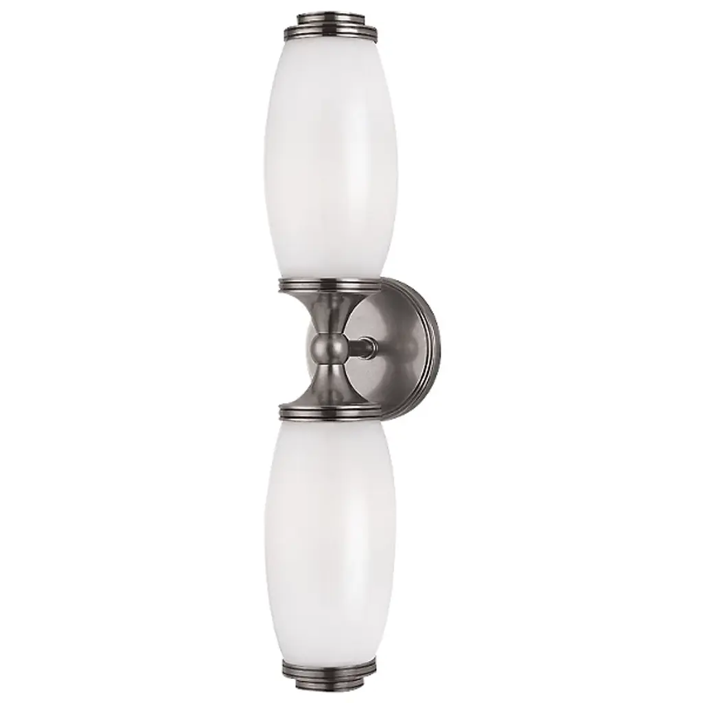 A handsome vintage look, the Hudson Valley Brook 2-Light Wall Sconce features two barrel-shaped, mouth-blown opalescent White glass shades. Stacked one atop the other and capped with stepped circular supports, the doubled shades create a striking profile. Complementing the caps, the round wall plate features the same cut beaded ring details for tailored symmetry.