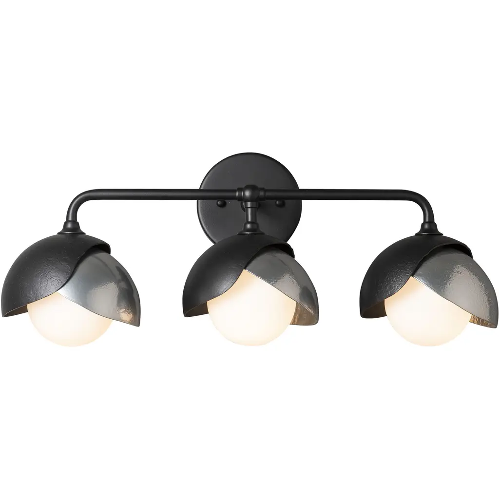 With an overarching curved arm, this Brooklyn wall mount features three 2-shaded glass globes. Shades are available in a two-tone option with a choice of accent color for a contrasting finish, if desired. Forged in 1800º fire, the shades are handcrafted and textured by Vermont makers. Available in Black, Oil Rubbed Bronze, Vintage Platinum, Soft Gold, Sterling and Modern Brass.