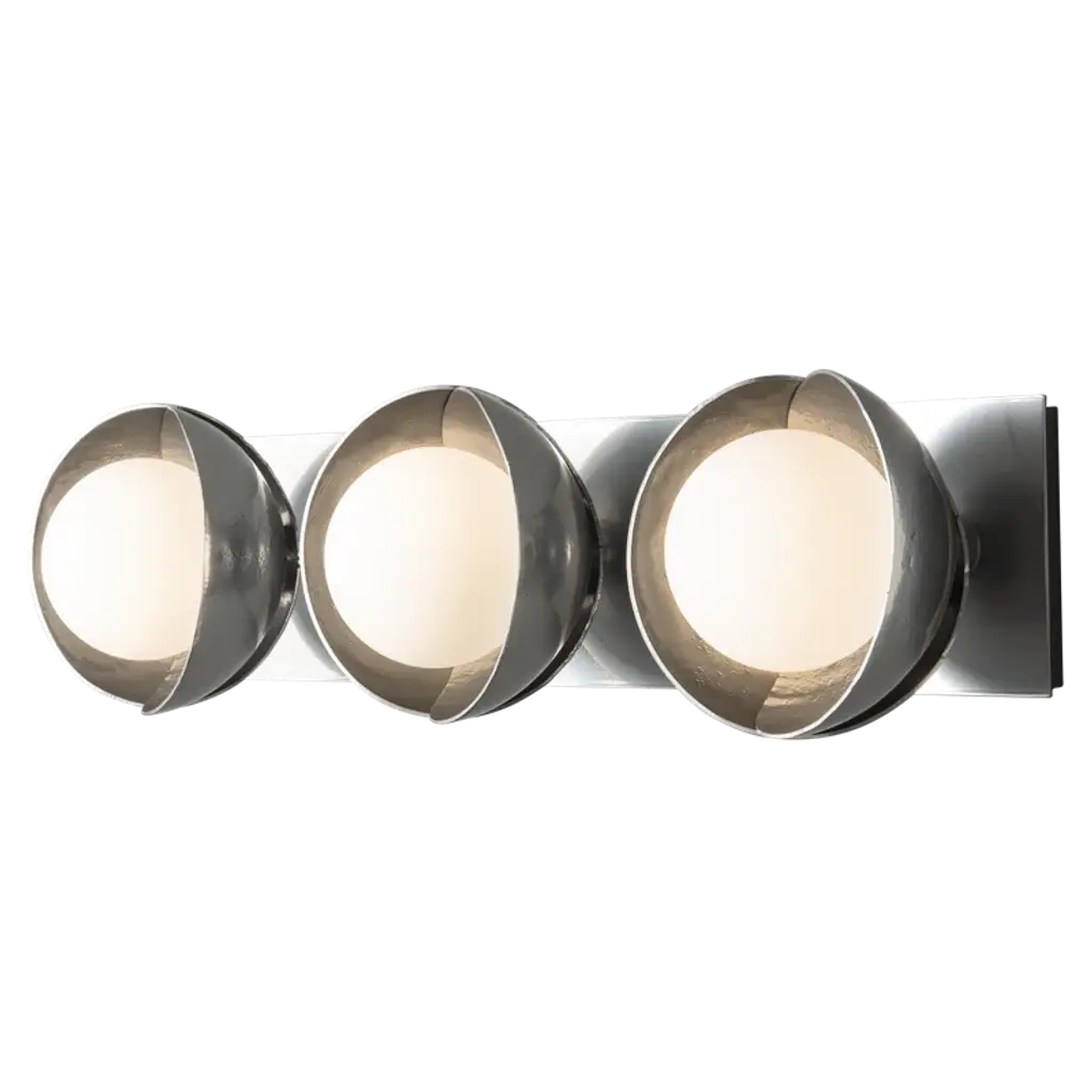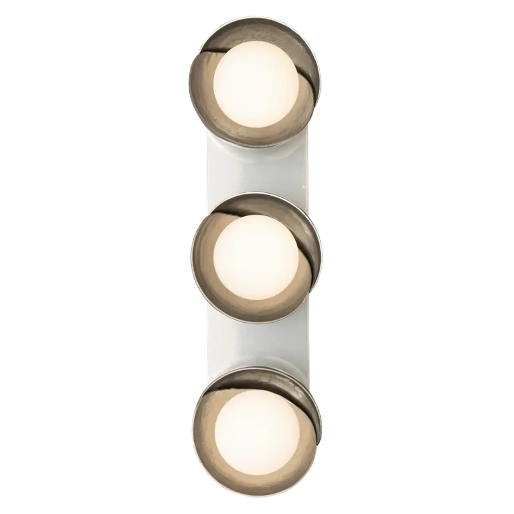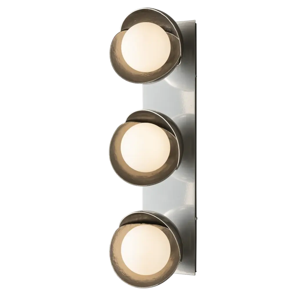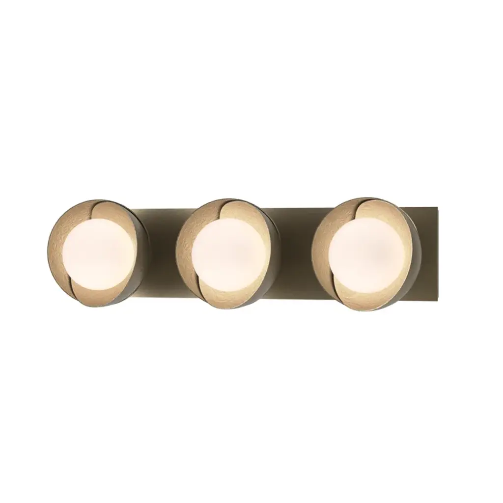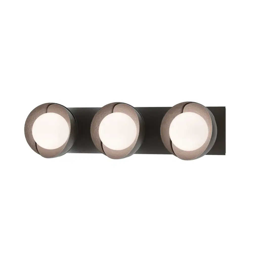 A linear wall mount that can be positioned either horizontally or vertically, this Brooklyn 3-light double shade is ideal above or on either side of a mirror in a powder room or bath. The shades are hand-forged and shaped by Vermont makers and can be adjusted for position. A two-tone option is offered for shade finishes, should contrasting colors be desired. All Hubbardton Forge products are hand-crafted to last one at a time in Vermont.