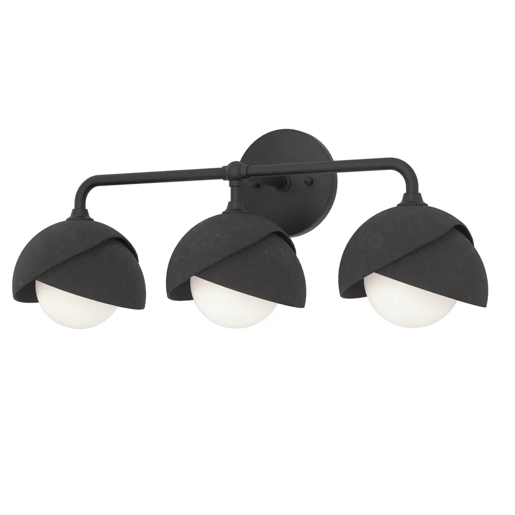 With an overarching curved arm, this Brooklyn wall mount features three 2-shaded glass globes. Shades are available in a two-tone option with a choice of accent color for a contrasting finish, if desired. Forged in 1800 fire, the shades are handcrafted and textured by Vermont makers. Available in Black, Oil Rubbed Bronze, Vintage Platinum, Soft Gold, Sterling and Modern Brass.Requires 3 x 60 watt G-9 G9 Incandescent bulb(s)(Not Included).All Hubbardton Forge products are hand-crafted to last one at a time in Vermont and backed by a Lifetime Limited Warranty.