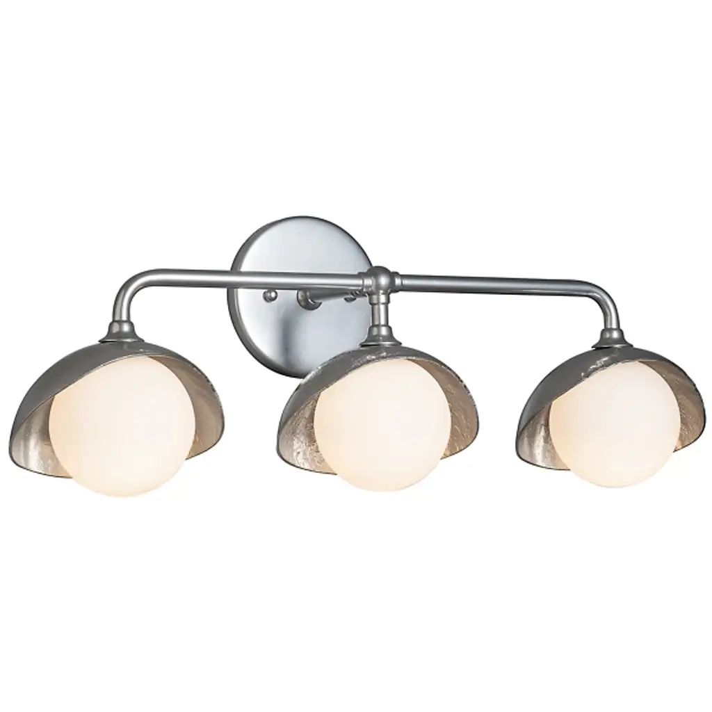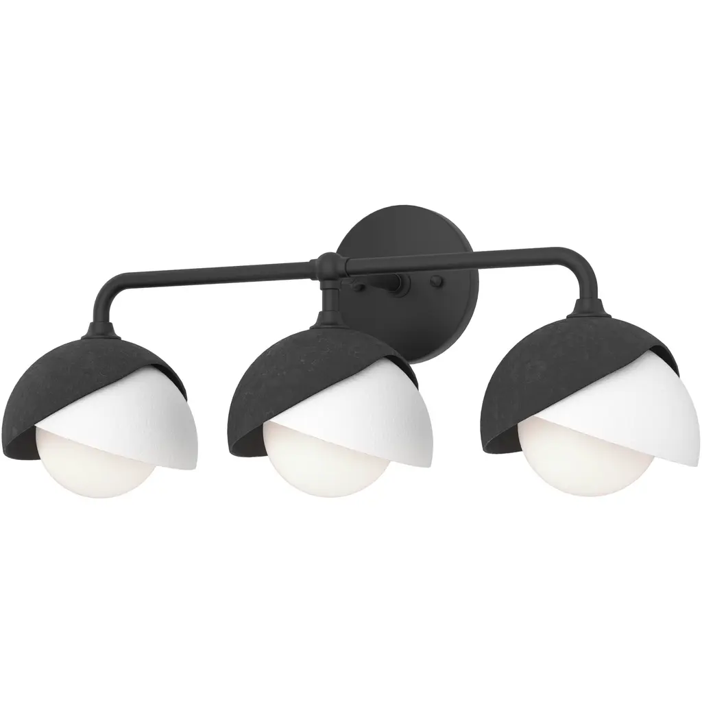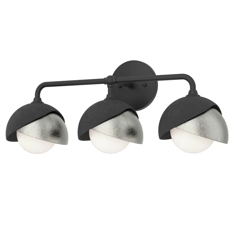 With an overarching curved arm, this Brooklyn wall mount features three 2-shaded glass globes. Shades are available in a two-tone option with a choice of accent color for a contrasting finish, if desired. Forged in 1800 fire, the shades are handcrafted and textured by Vermont makers. Available in Black, Oil Rubbed Bronze, Vintage Platinum, Soft Gold, Sterling and Modern Brass.Requires 3 x 60 watt G-9 G9 Incandescent bulb(s)(Not Included).All Hubbardton Forge products are hand-crafted to last one at a time in Vermont and backed by a Lifetime Limited Warranty.