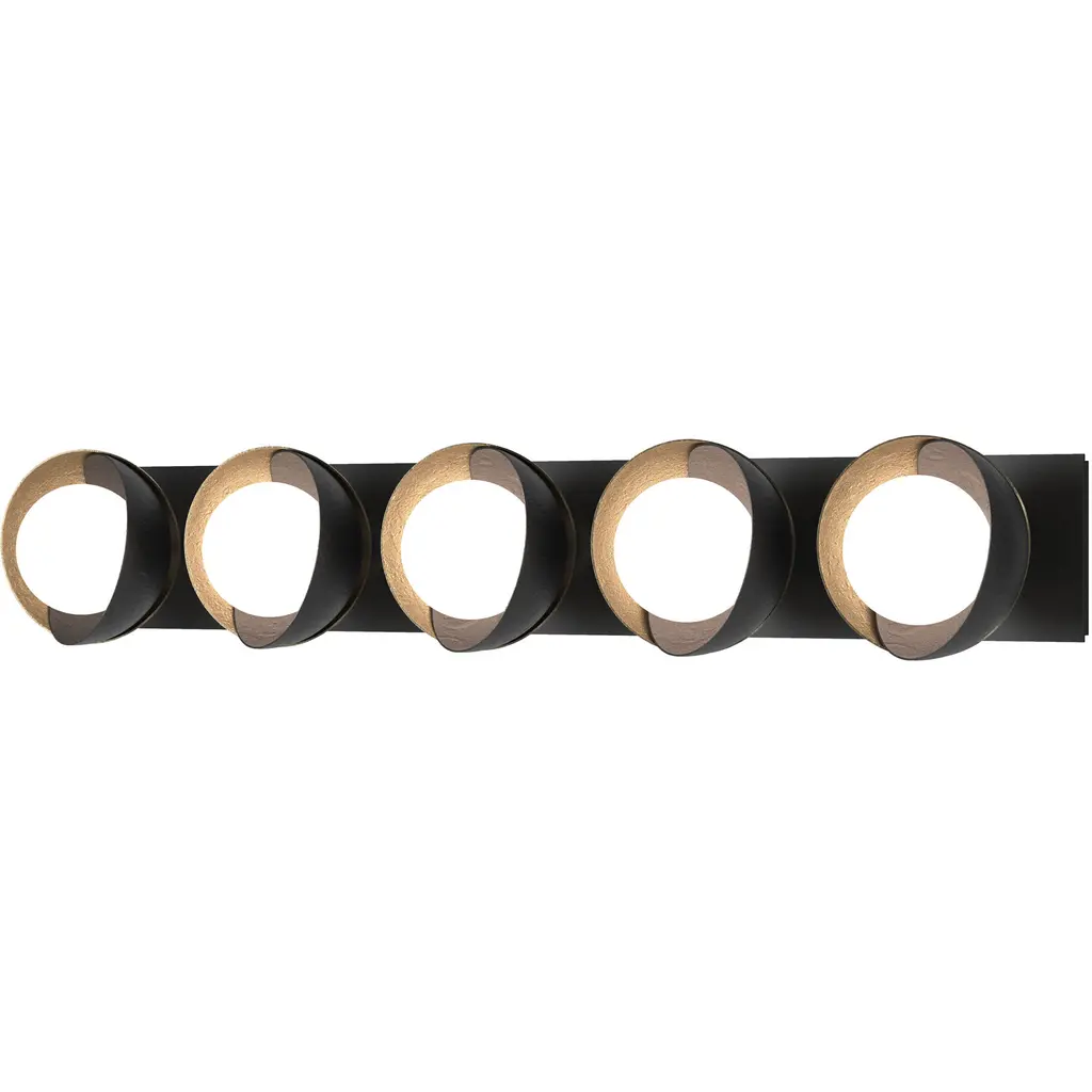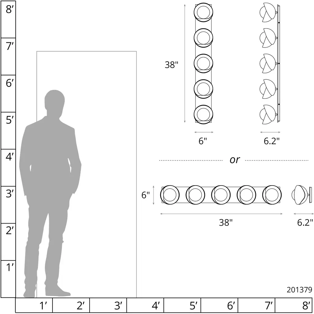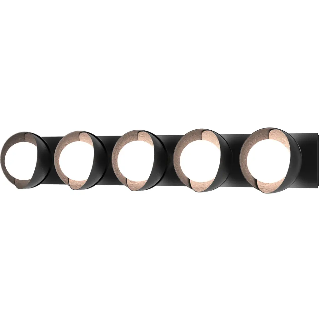 A large, linear wall sconce, the Brooklyn 5-Light Straight Double Shade Bath Sconce can be mounted vertically or horizontally to suit the bath design. Perfect for a large vanity setting, the metal shades can be adjusted to the desired positions. The five double shades are hand-forged and textured by Vermont artisans and are offered as a two-tone option, should contrasting colors be desired. Available in Black, Oil Rubbed Bronze, Vintage Platinum, Soft Gold, Sterling and Modern Brass finishes.