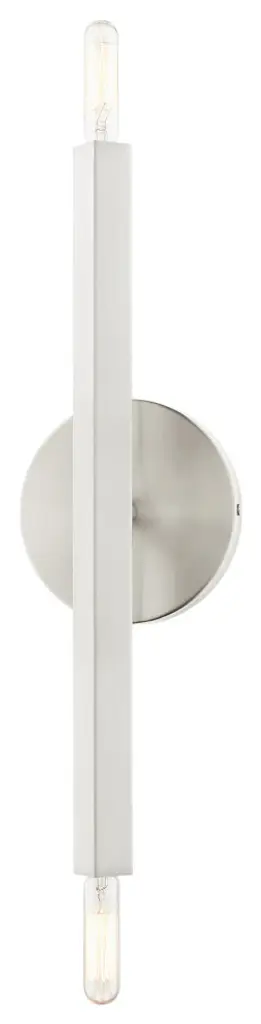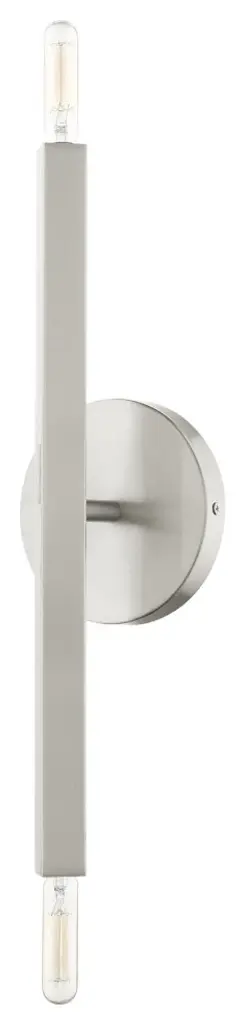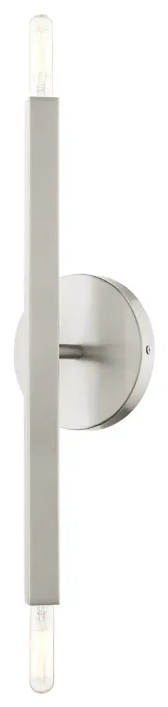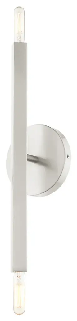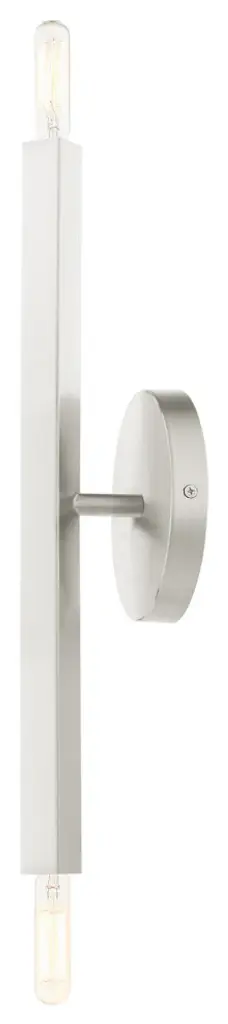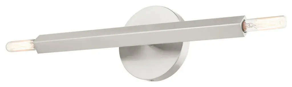 The Monaco collection inherits the multidirectional lines inspired by the Sputnik. The exposed bulbs glimmer at the end of each rectangular arm to create a touch of understated glamour for today�s modern spaces. The timeless design will add a sense of airiness and motion to any room. This double light sconce would look wonderful really anyplace, bathroom, living room, modern dining room, hallway or a bedroom. It is presented in a brushed nickel finish with a black chrome finish accent.Bulb Type: Candelabra BaseNumber of Bulbs: 2Bulbs Included?: NoUL Listed: ULBulb Wattage: 60Hardwire or Plug: Hardwire