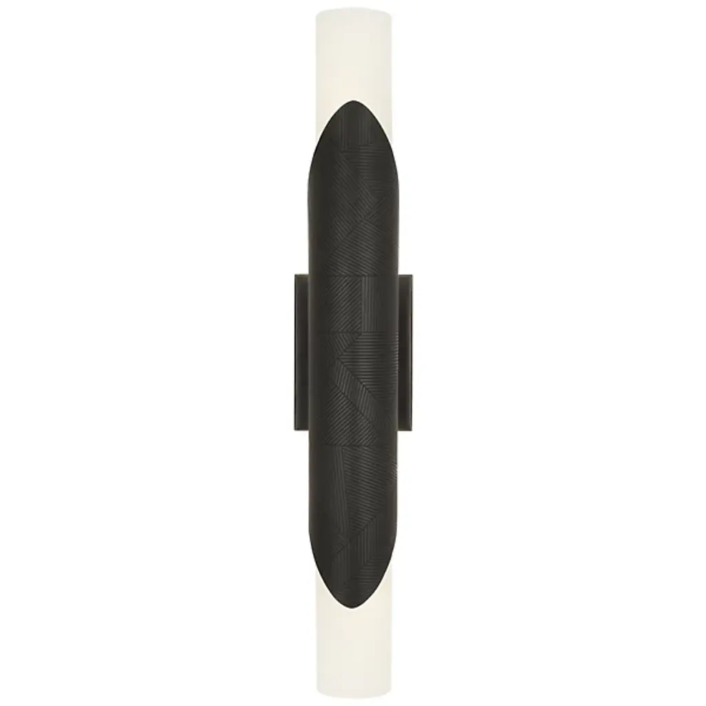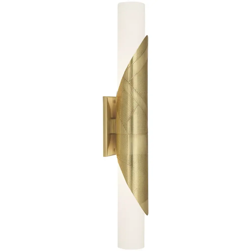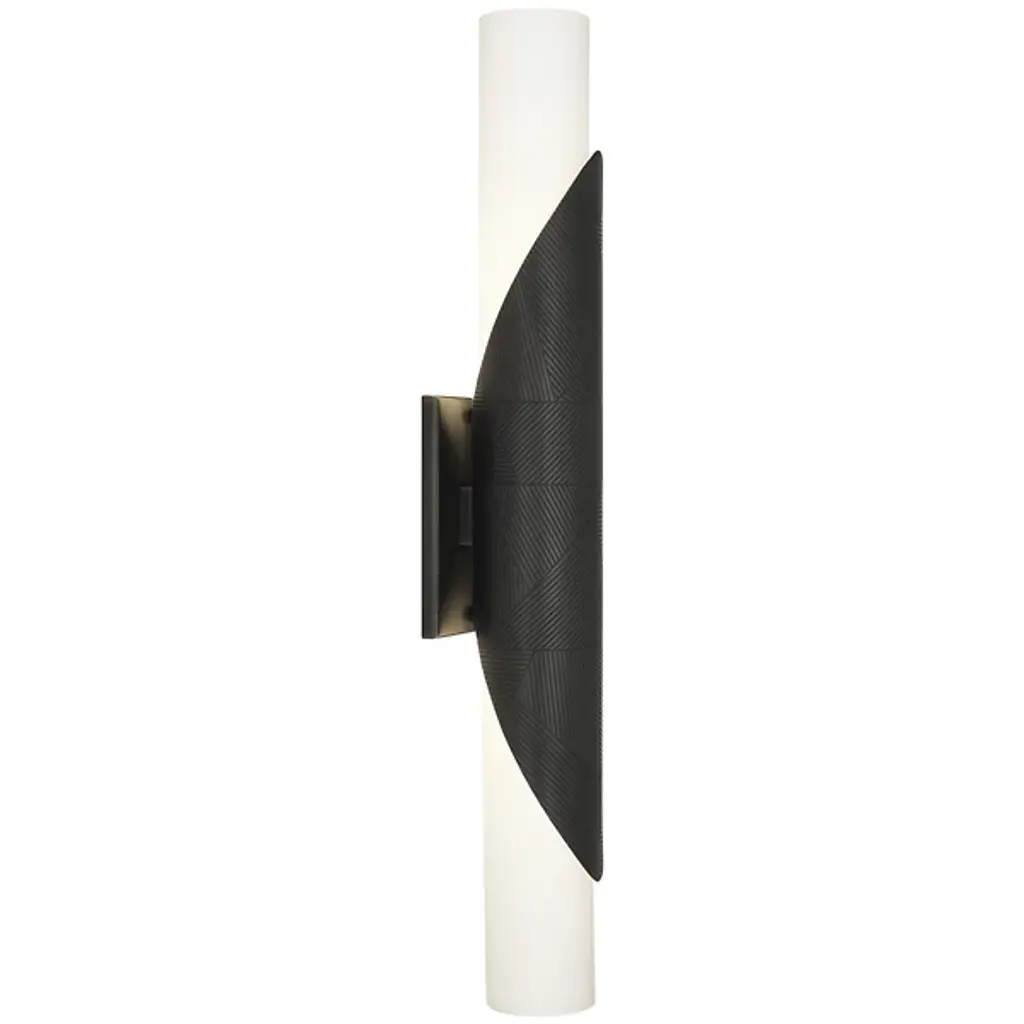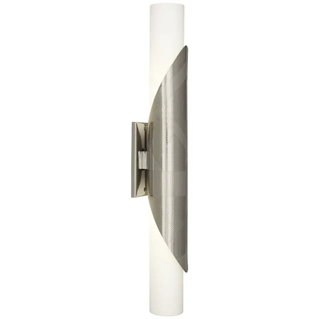 Featuring intricate detailing that requires a closer look to be truly appreciated, the Brut Double Wall Sconce by Robert Abbey is a simple, yet stylistic lighting option for a modern living space. As the thin metallic layer gently wraps around the body of the piece, a sleek cylinder of light extends from both ends, creating an uplight and a downlight that emanates a soft, warm, and welcoming glow to your room.
