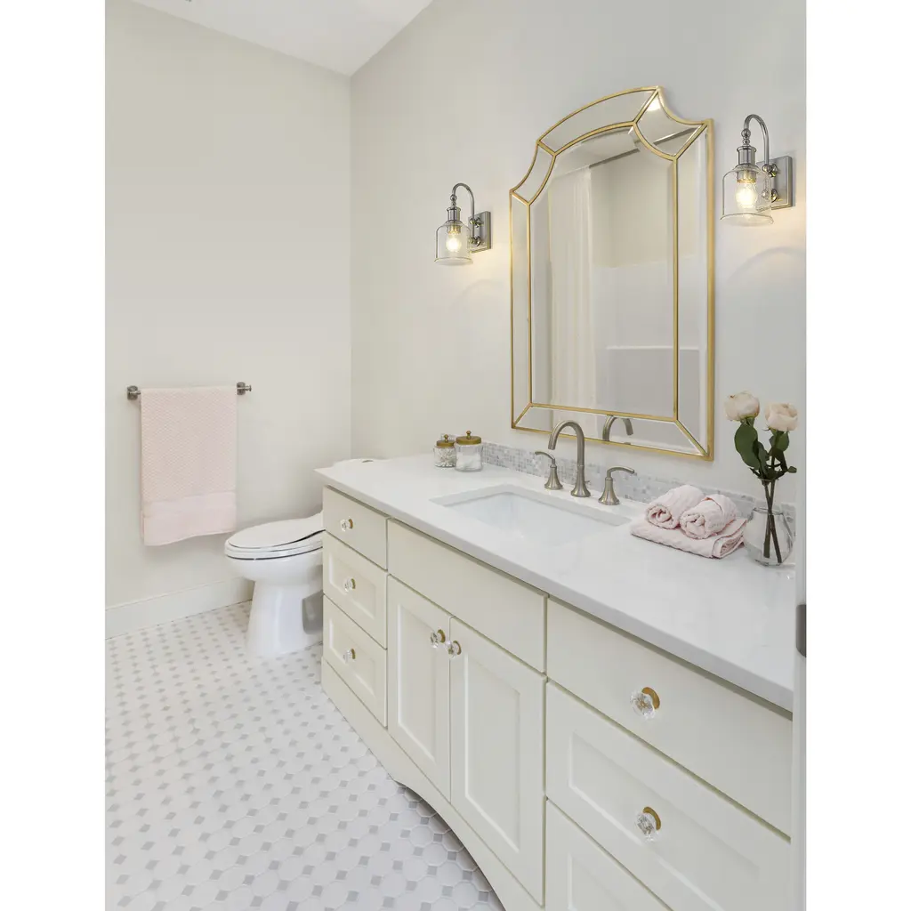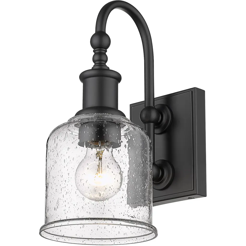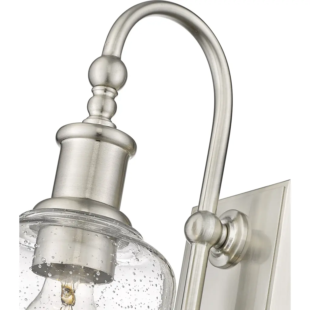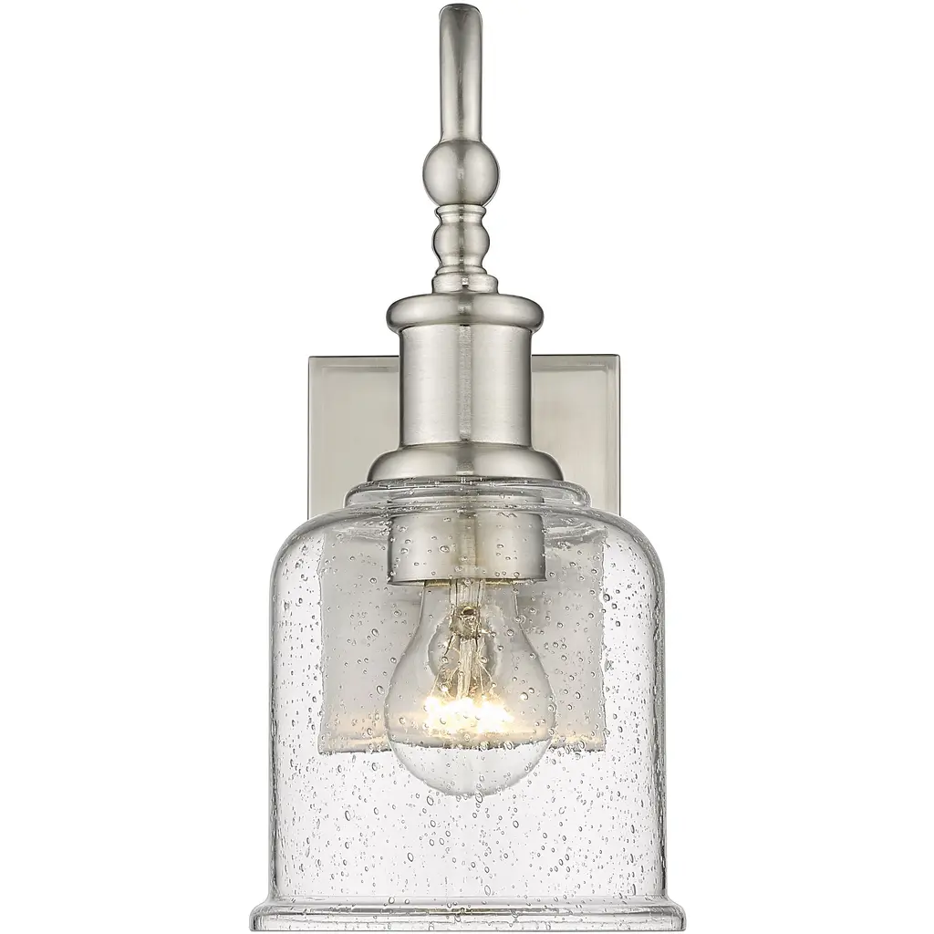 Soft nautical vibes bring a nostalgic romantic vibe to the Bryant one-light wall sconce. Create a themed visual with this tasteful fixture crafted of cool brushed nickel finish steel, blending beautifully with a romantic clear seedy glass shade. A curved arm and lipped shade generate extra charm that stylizes a custom bath space, dining area, or main living room.