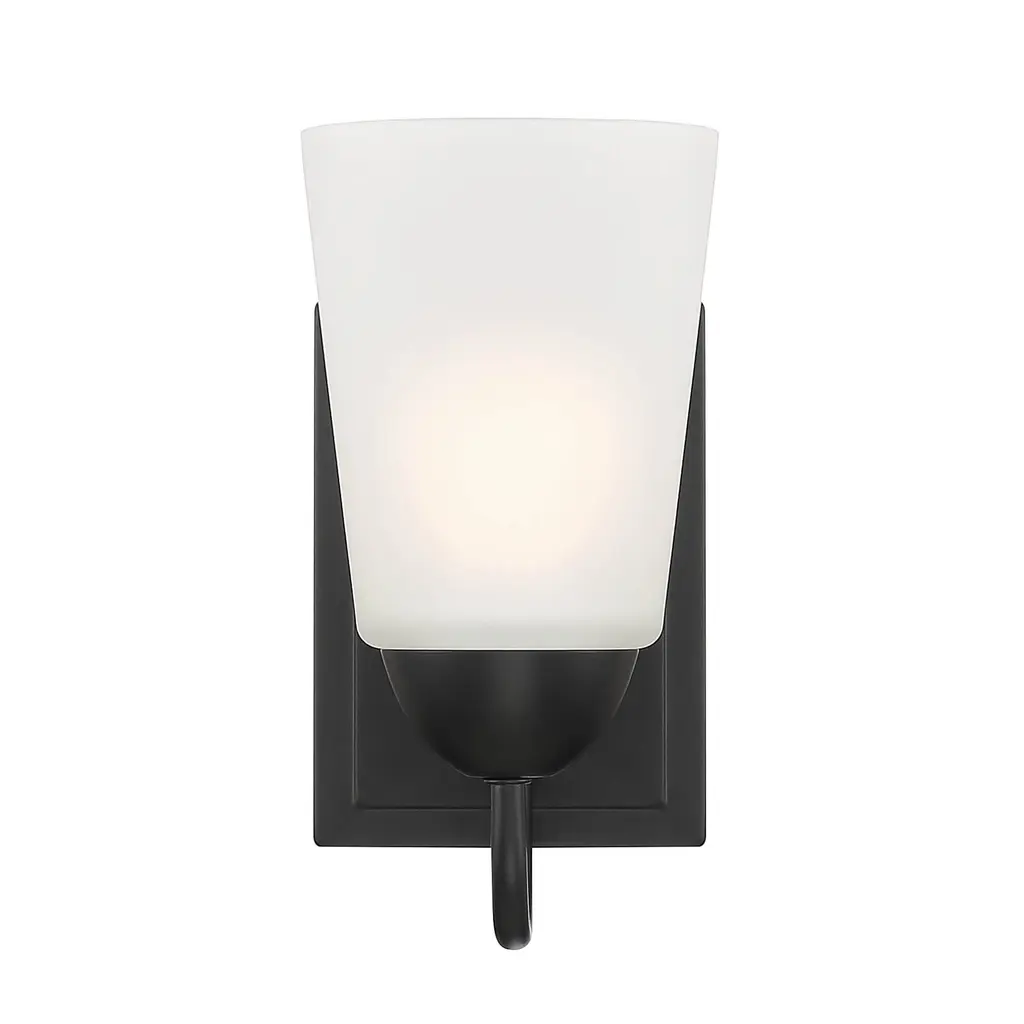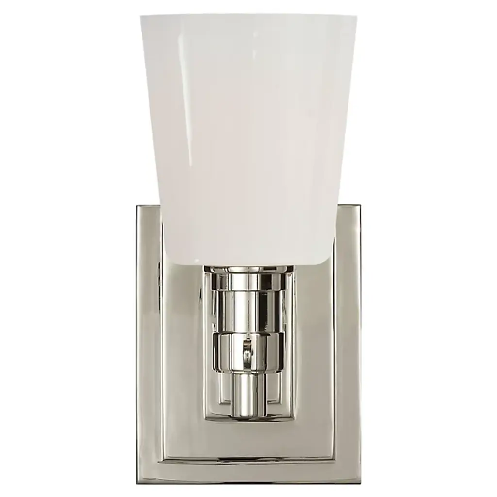 The Bryant Bath Wall Sconce by Visual Comfort Signature, formerly known as Visual Comfort, features a wall plate of concentric rectangles which leads to a detailed arm and stem that in turn supports a tapered, White glass shade. These features come together to bring design-minded style and even, ample lighting to your vanity. Dimmable with a standard incandescent dimmer (not included). Designed by Thomas O'Brien.