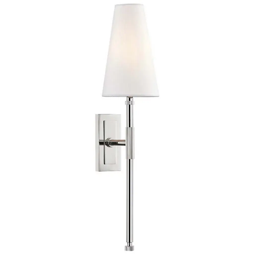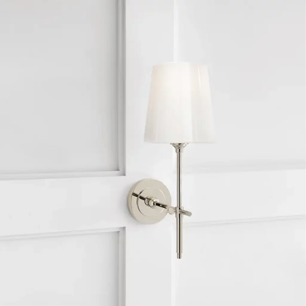 The Bryant Decorative Wall Sconce by Visual Comfort Signature, formerly known as Visual Comfort, features a tapered shade which expertly distributes ambient light to the room while also directing light toward any subject below. A detailed stem and a 4-inch wall plate of concentric circles round out the look for this fixture. Dimmable with an ELV dimmer (not included). Designed by Thomas O'Brien.
