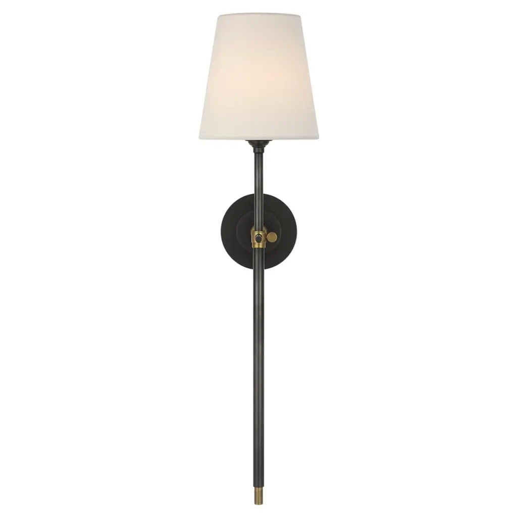 The Bryant Decorative Wall Sconce by Visual Comfort Signature, formerly known as Visual Comfort, features a tapered shade which expertly distributes ambient light to the room while also directing light toward any subject below. A detailed stem and a 4-inch wall plate of concentric circles round out the look for this fixture. Dimmable with an ELV dimmer (not included). Designed by Thomas O'Brien.