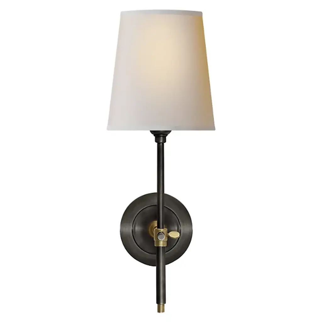 The Bryant Decorative Wall Sconce by Visual Comfort Signature, formerly known as Visual Comfort, features a tapered shade which expertly distributes ambient light to the room while also directing light toward any subject below. A detailed stem and a 4-inch wall plate of concentric circles round out the look for this fixture. Dimmable with an ELV dimmer (not included). Designed by Thomas O'Brien.