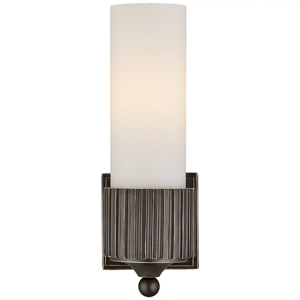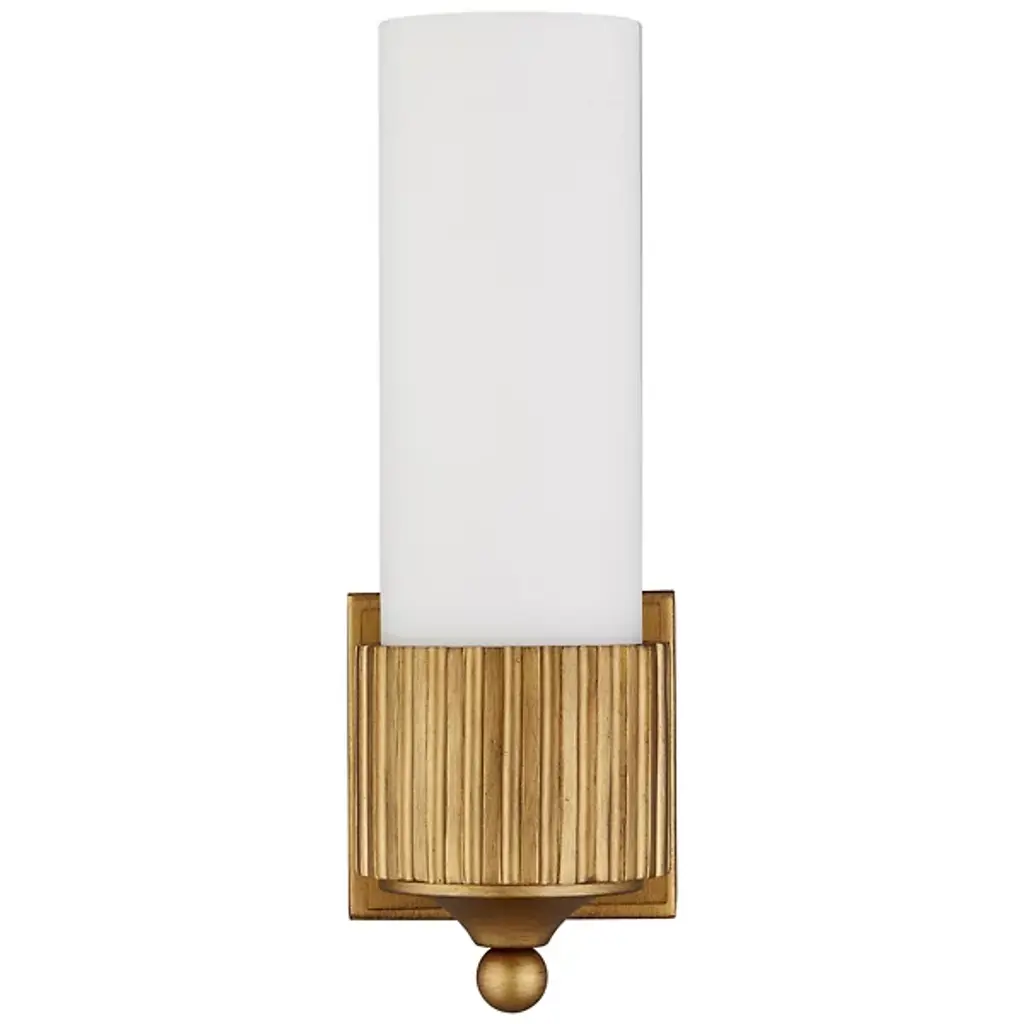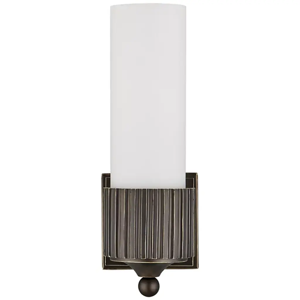 The Bryce Wall Sconce from Currey & Company adds transitional style to wall spaces with a direct design and sculptural appeal. This clean-lined fixture is versatile enough for various interiors, designed by Barry Goralnick and made from composite material with a frosted glass shade. Its round form is accented with an industrial gear motif and finished in metallic surfacing. The classically inspired finial at the bottom adds sophistication, while the frosted glass tube emits a warm and even glow, enhancing the design.