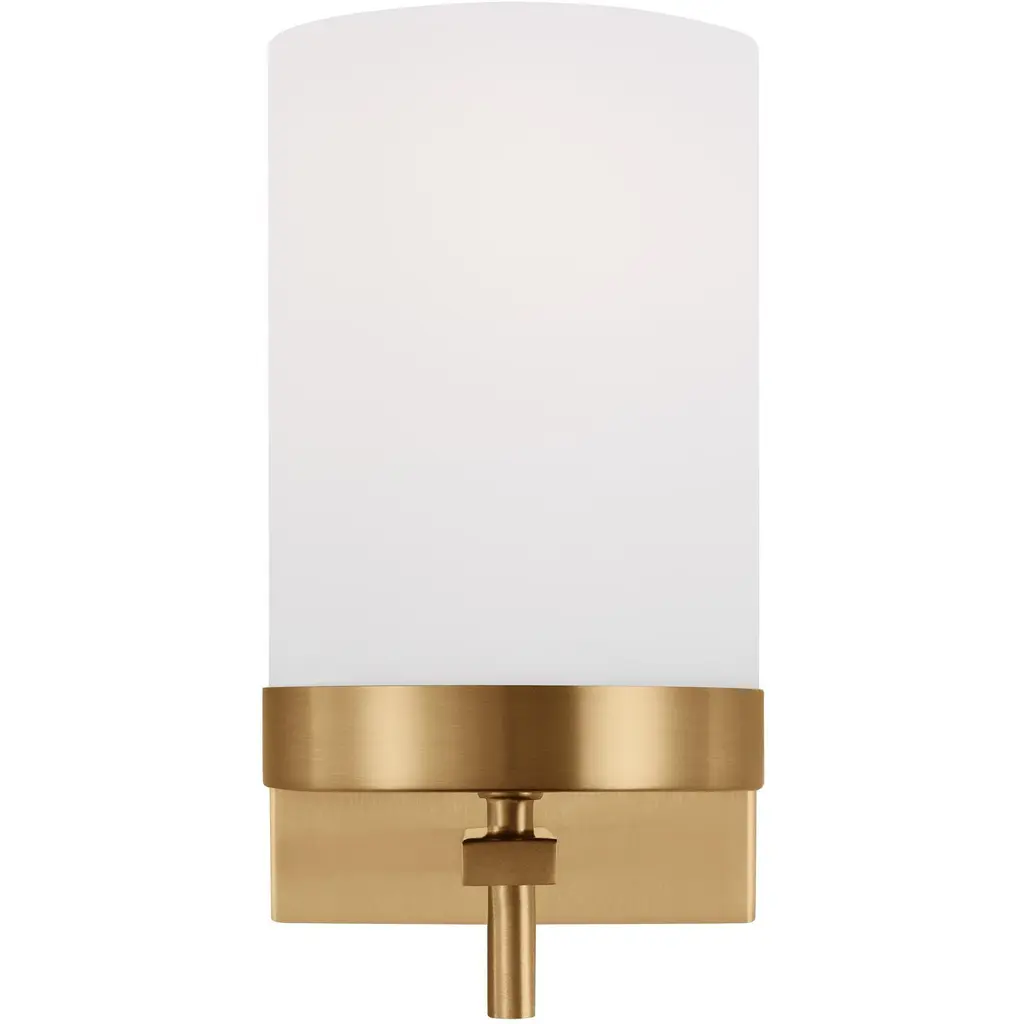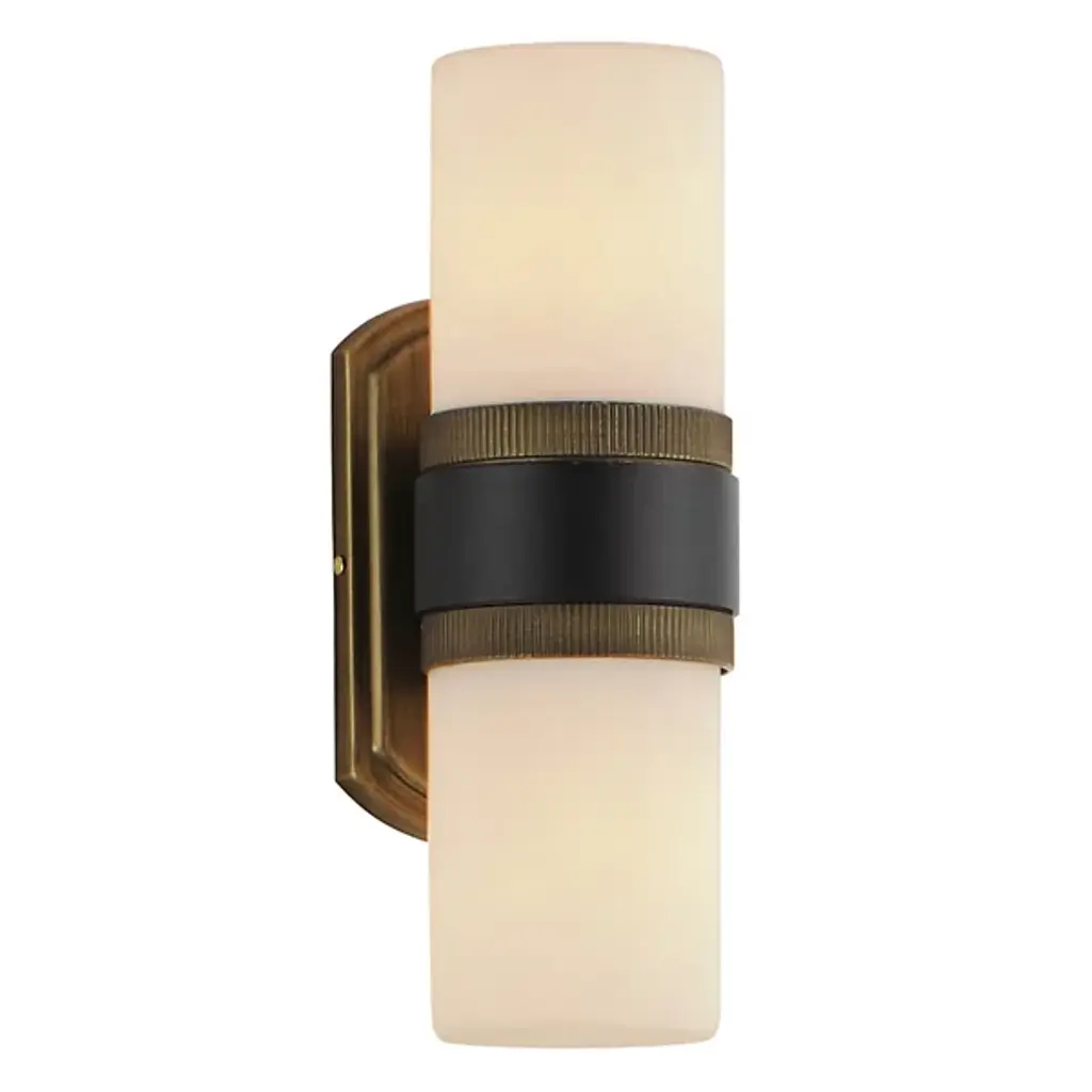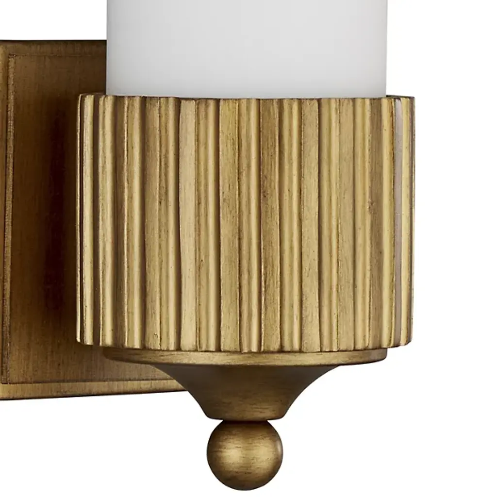 The Bryce Wall Sconce from Currey & Company adds transitional style to wall spaces with a direct design and sculptural appeal. This clean-lined fixture is versatile enough for various interiors, designed by Barry Goralnick and made from composite material with a frosted glass shade. Its round form is accented with an industrial gear motif and finished in metallic surfacing. The classically inspired finial at the bottom adds sophistication, while the frosted glass tube emits a warm and even glow, enhancing the design.