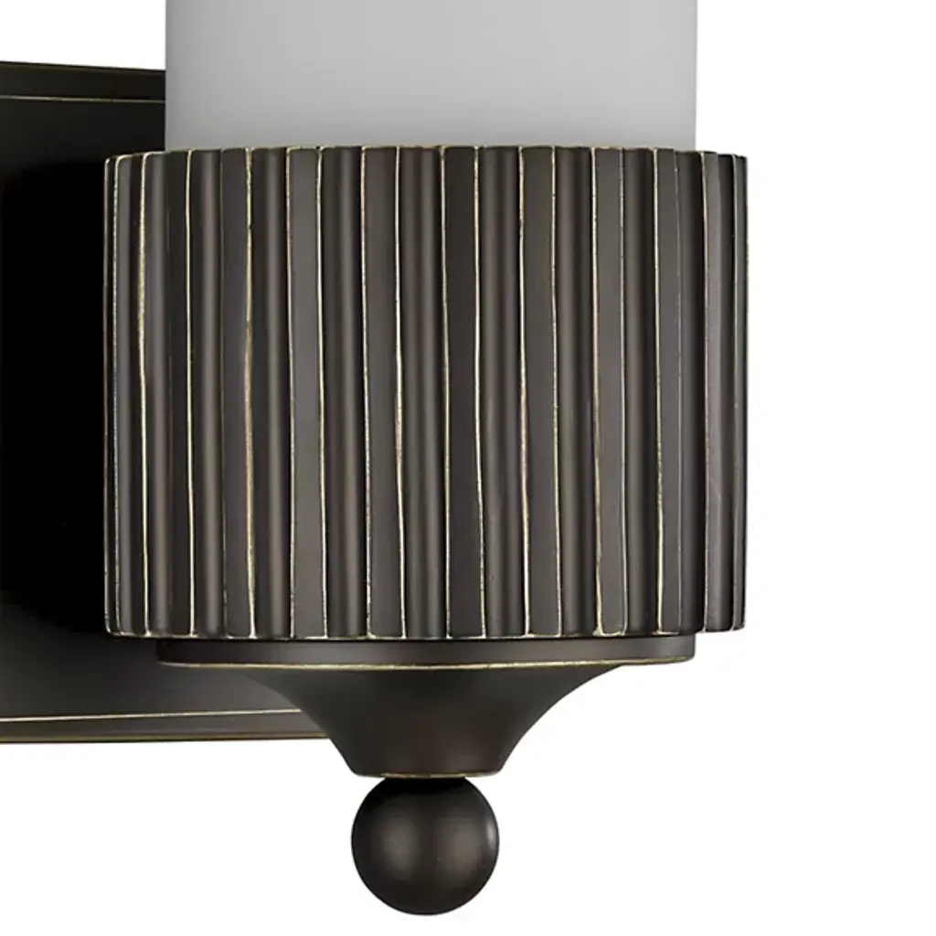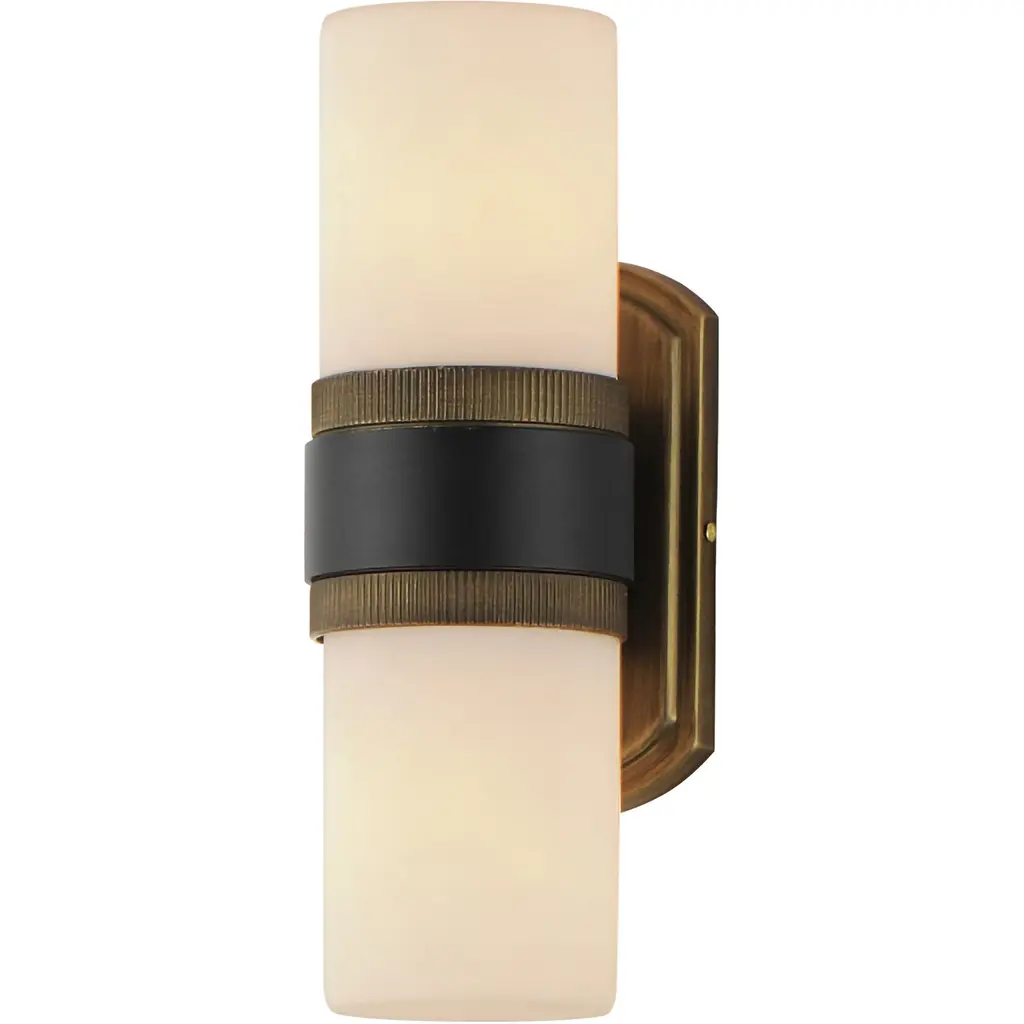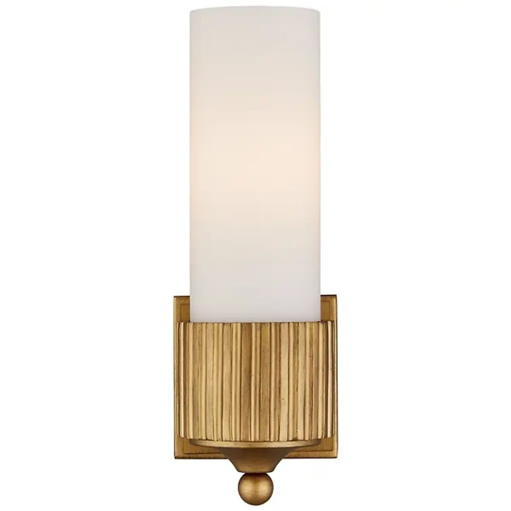 The Bryce Wall Sconce from Currey & Company adds transitional style to wall spaces with a direct design and sculptural appeal. This clean-lined fixture is versatile enough for various interiors, designed by Barry Goralnick and made from composite material with a frosted glass shade. Its round form is accented with an industrial gear motif and finished in metallic surfacing. The classically inspired finial at the bottom adds sophistication, while the frosted glass tube emits a warm and even glow, enhancing the design.