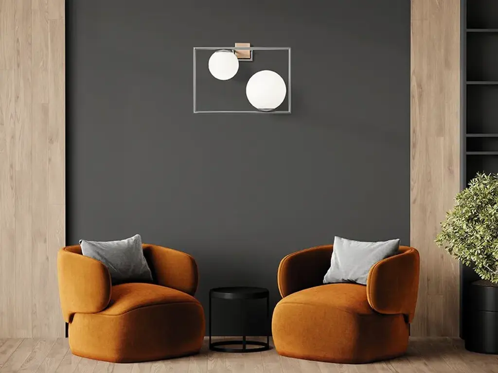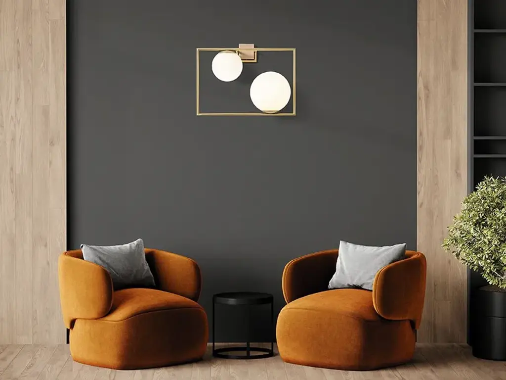 Wall lamp with metal frame (brushed gold or brushed steel finish, bronze detail) with 2 opaline-coloured blown glass spheres.Light source: E27, Power: 2x20WA frame with a view onto our dynamic lifestyles. Toughness and liveliness coexist, with the stiff and squared frame containing and supporting BUBLE, a series of opal glass bubbles, in multiple sizes and positions. The asymmetric lights articulate the space, with their proportions giving it balance, and the assembly making BUBLE fascinating and timeless.