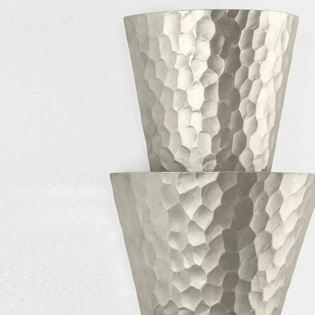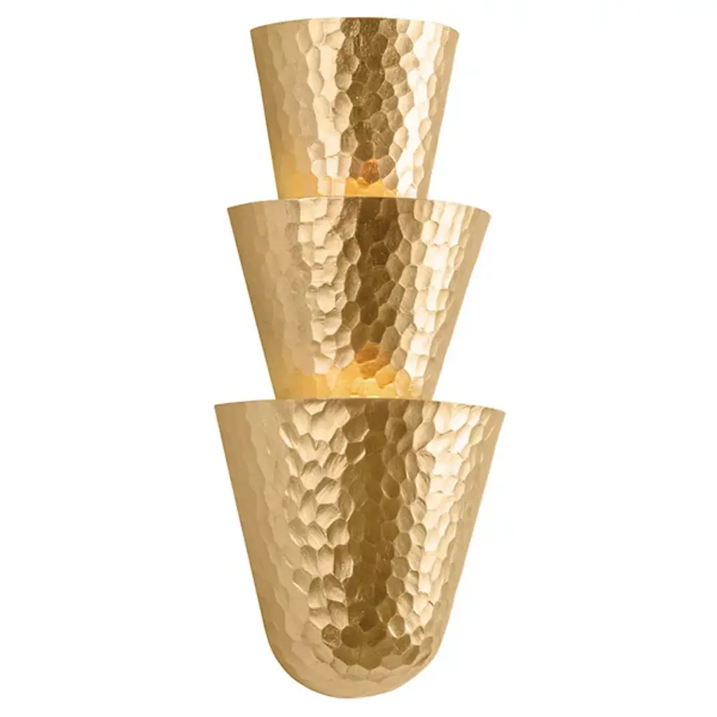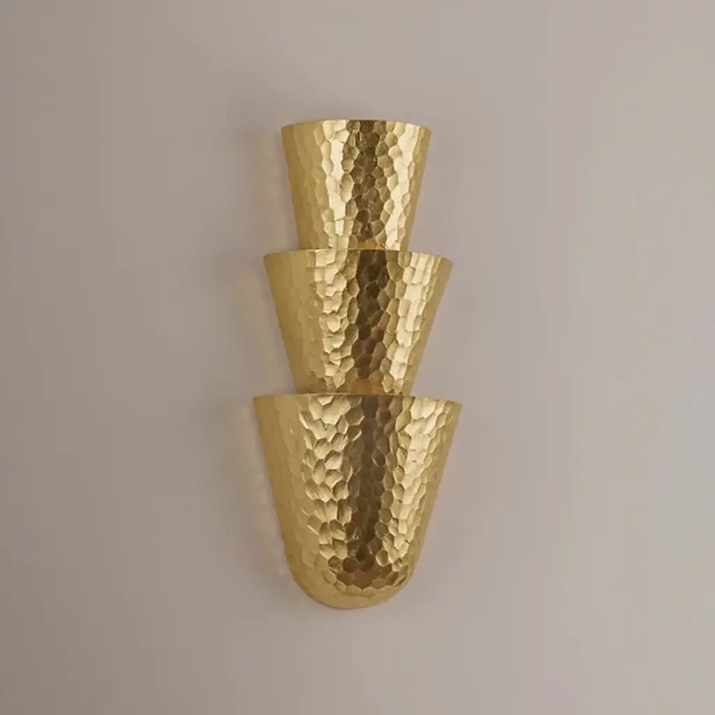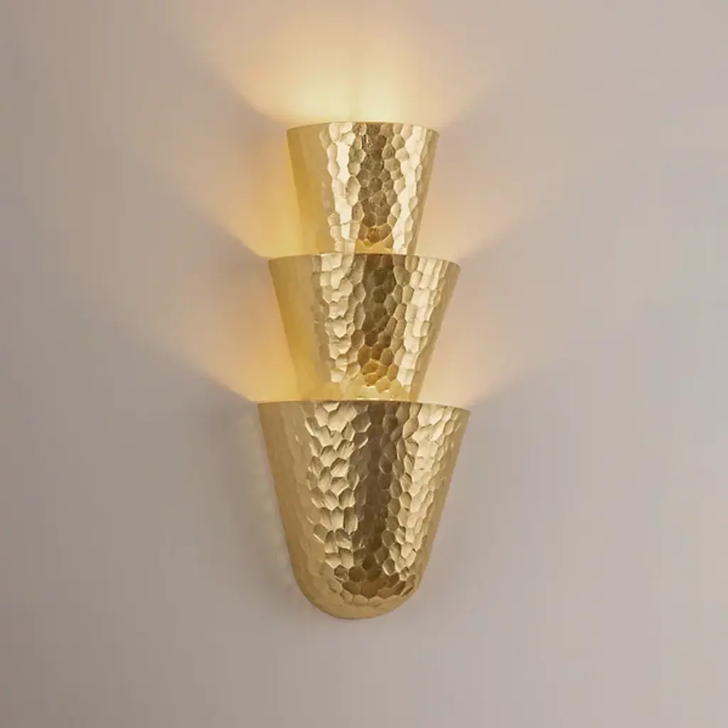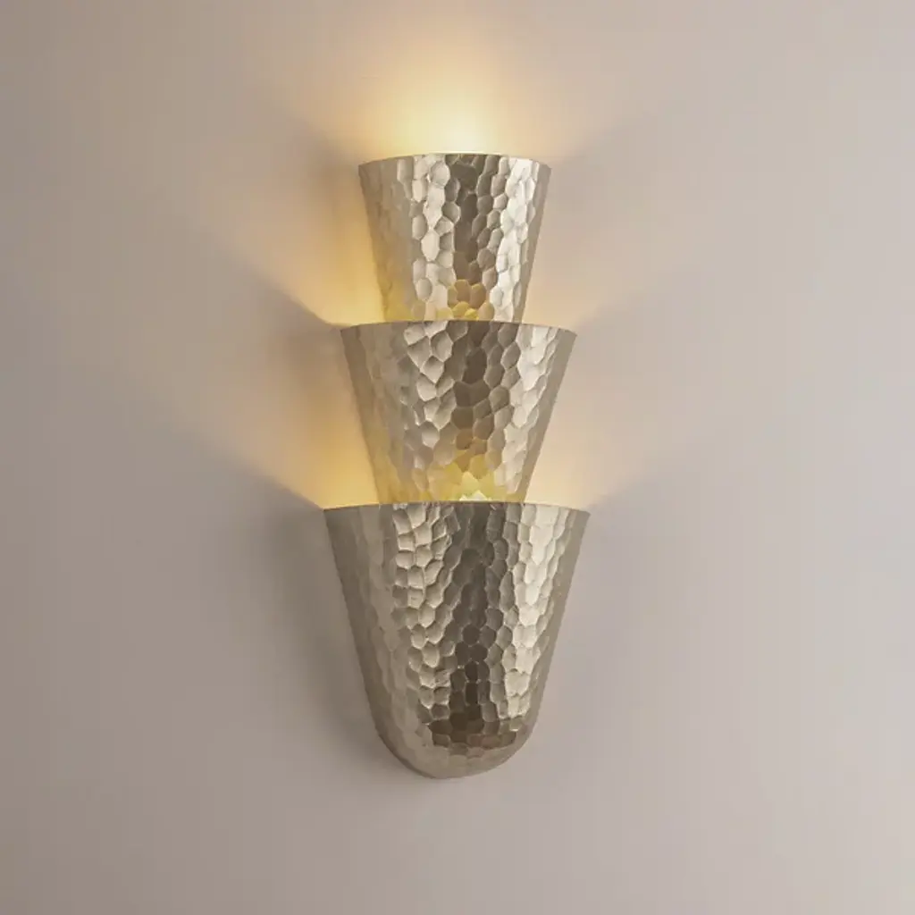 The Bucharest Wall Sconce from Corbett Lighting stacks three half-cone shapes into a compact yet impactful wall fixture. Each metallic cone catches and reflects light differently due to its hammered surface, creating varied light patterns on nearby walls. The smallest cone sits at the top while the largest anchors the bottom, establishing a pleasing rhythm that draws the eye downward. Light washes the wall behind rather than projecting forward, resulting in a soft ambient glow. This sconce takes up minimal wall space yet delivers dramatic lighting effects that turn plain surfaces into dynamic canvases.