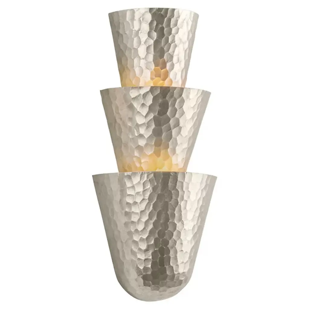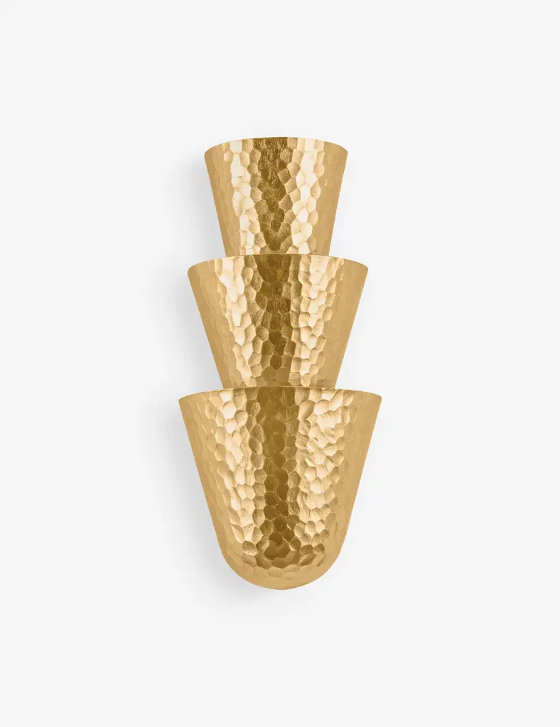 The petite scale of the Bucharest sconce does nothing to diminish its impact. The artful, rhythmic design features a stack of three conical half-shades that create a dramatic, ambient wash of light on the wall. The shapes are complemented by the exquisite finish options of Hammered Vintage Gold Leaf or Warm Silver Leaf, adding texture that highlights the masterful craftsmanship of this unique sconce.
