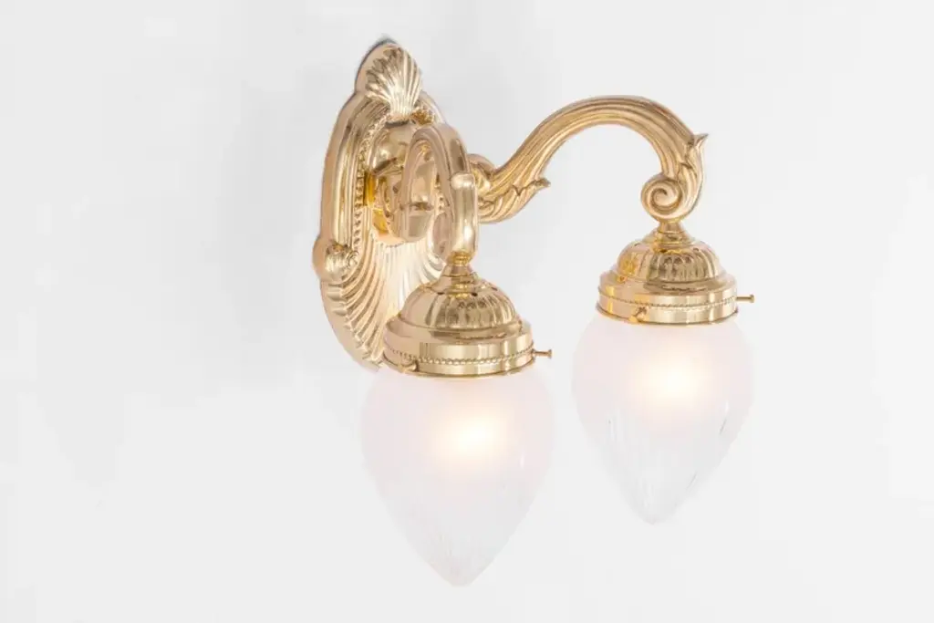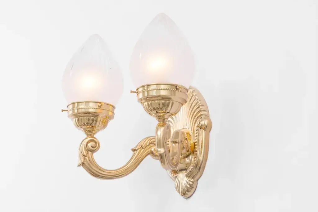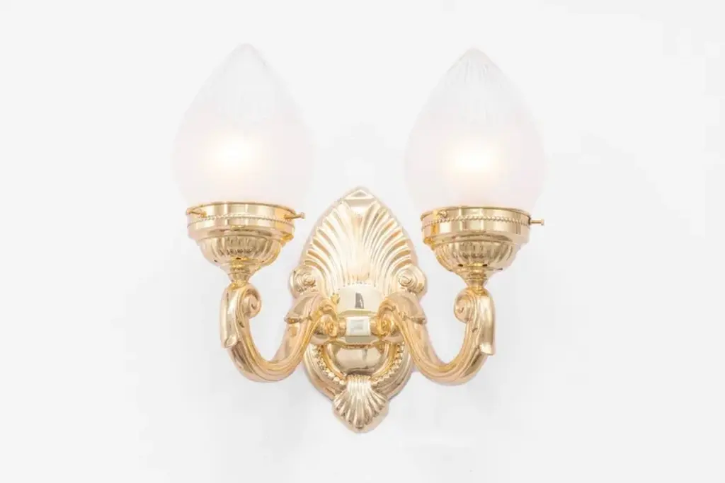 Budapest III is a wall lamp made of brass available in different finishes.Finishes: Antique, Shiny brass, Matt brass, Shiny nickel, Matt nickelCapacity : 2x75 W E27Classical, less opulent neo-baroque wall light with delicate leaf decor and slender back plate. The backplate and the arm have been re-chiselled meticulously in every little detail. The lamp was inspired by the original from the end of 1800s. Either with antique finish or gold, the wall light is a highly elegant deco of your bedroom, diningroom or hall. Should you like it even more extravagant, ask for nickel finish. The backplate and the arms are manufactured with greatest care . The lamp can be fitted with conical or round sandblasted glasses which are carved Murano way in four variations. Every Budapest wall light has a chandelier companion with either three orfive arms, and it is 100 % Hungarian product. We produce it from pure brass in shiny, antique and nickel finishes, and its arms can be turned up and down as well. Its sockets are porcelain ones, so they can be fitted with traditional, energy saving and LED bulbs. Take some time to have a really close look at the lamp: it is, just like every lamp of ours, crafted with great care, just like a piece of jewellery. Our well-known trademark is proportionality, which took years to design and refine. In order to manufacture the lamp 14 to 16 work stages are required, depending on the finish. Handicraft technology is time consuming (some work stages take hours), it requires wide knowledge and expertise.Budapest is a collection of table, wall and suspension lamps made of brass or nickel. A collection suitable for lighting a magnificent church or a representative hall.