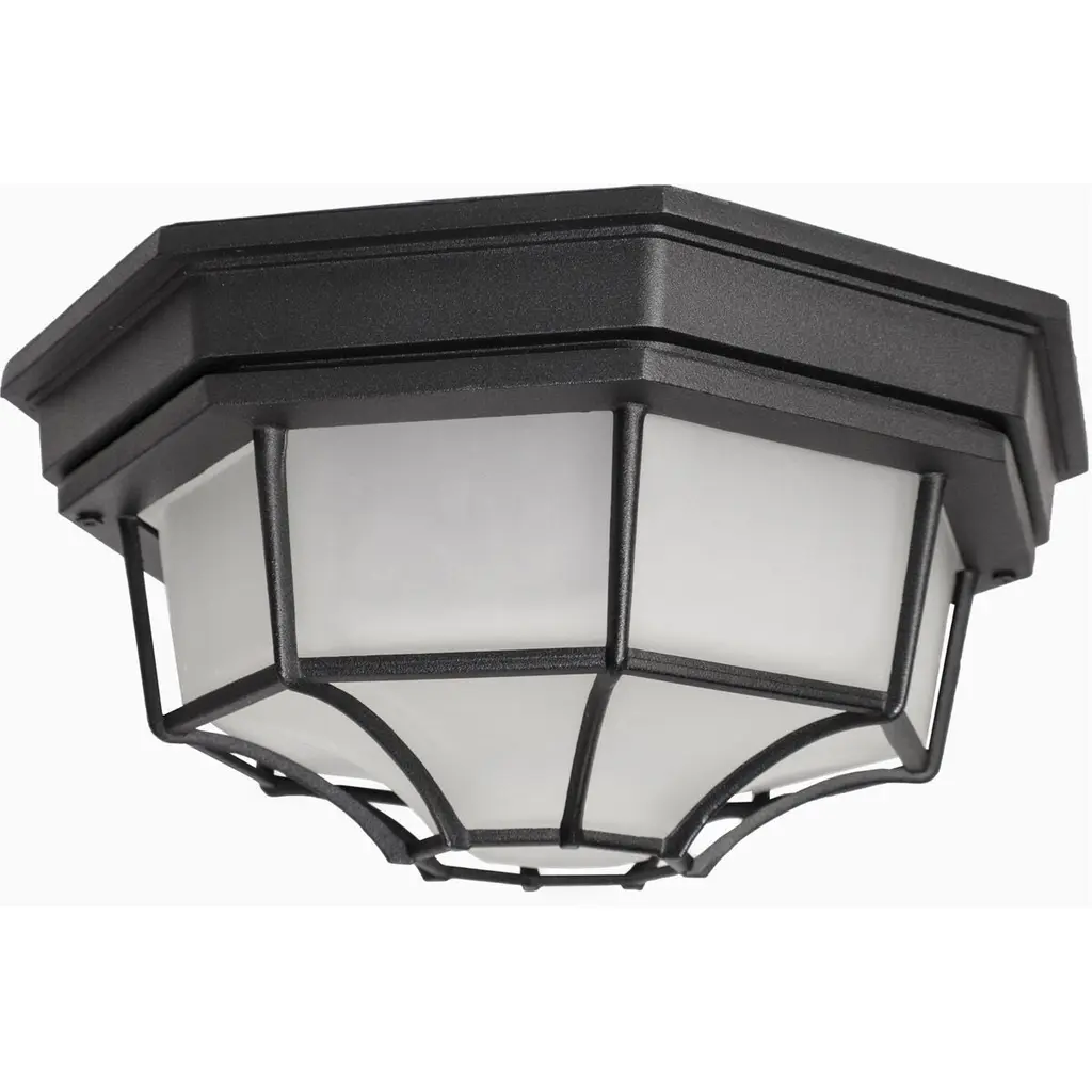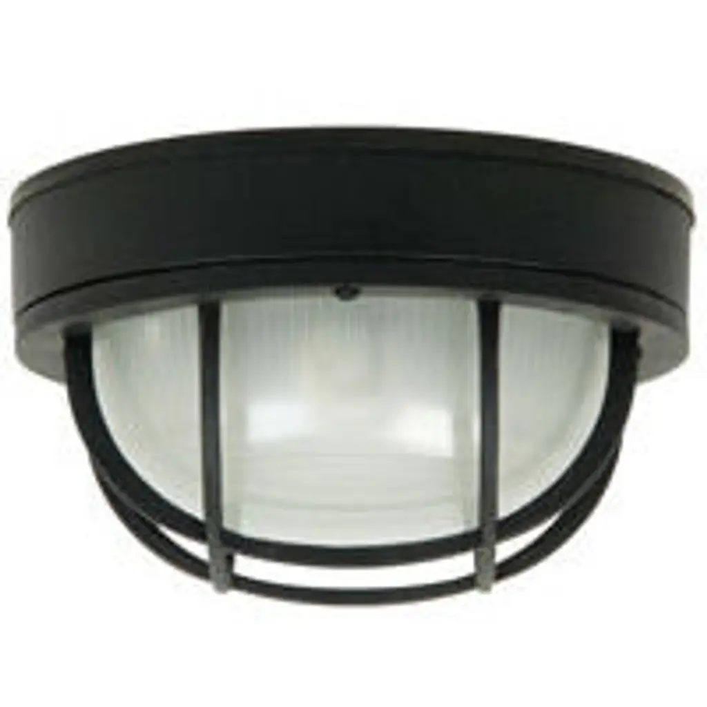 One-Light 9-1/2" LED Wall or Ceiling Bulkhead. General purpose LED luminaire comprised of a die-cast aluminum frame and polycarbonate diffuser with cage design. Fixtures are impact resistant and can be mounted on wall or ceiling. Replaceable LED module. Black finish.
