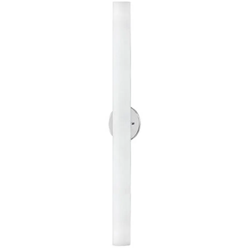 Single LED wall sconce with cylinder shaped white opal glass. Metal details in brushed nickel or chrome finish, and is equipped with our powerful 120V AC LED technology.