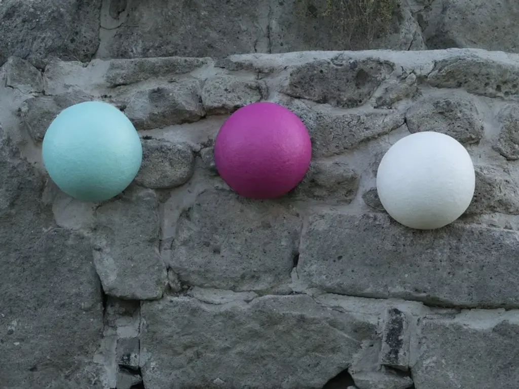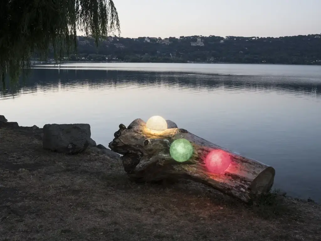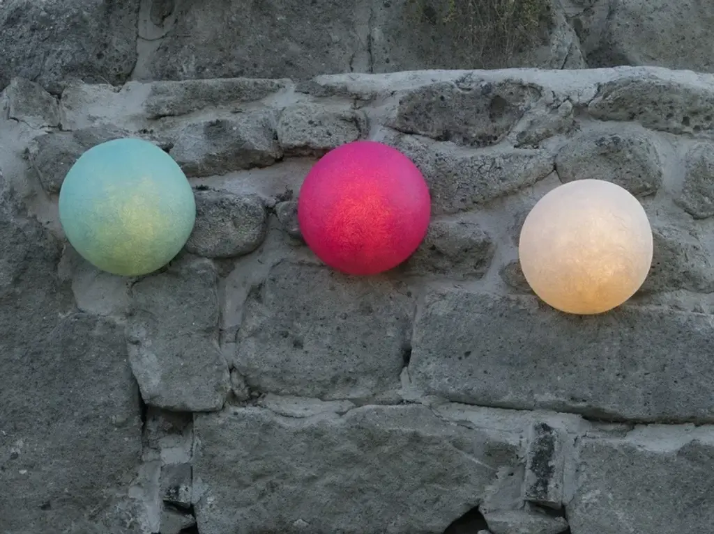 Button outMaterials: nebulite, lapreneColor: white, red, orange, turquoise, magenta, blue.The Out Collection is designed to create outdoors a dreamlike and romantic atmosphere, ideal for aperitifs, dinners, or to relax or under the sun or a starry sky. The collection is inspired by the moon and its infinite mysteries, reproducing the luminescent and irregular surface of the celestial body in all its shades and texture, through the Nebulite material (a specially treated mix of resin and fibers).