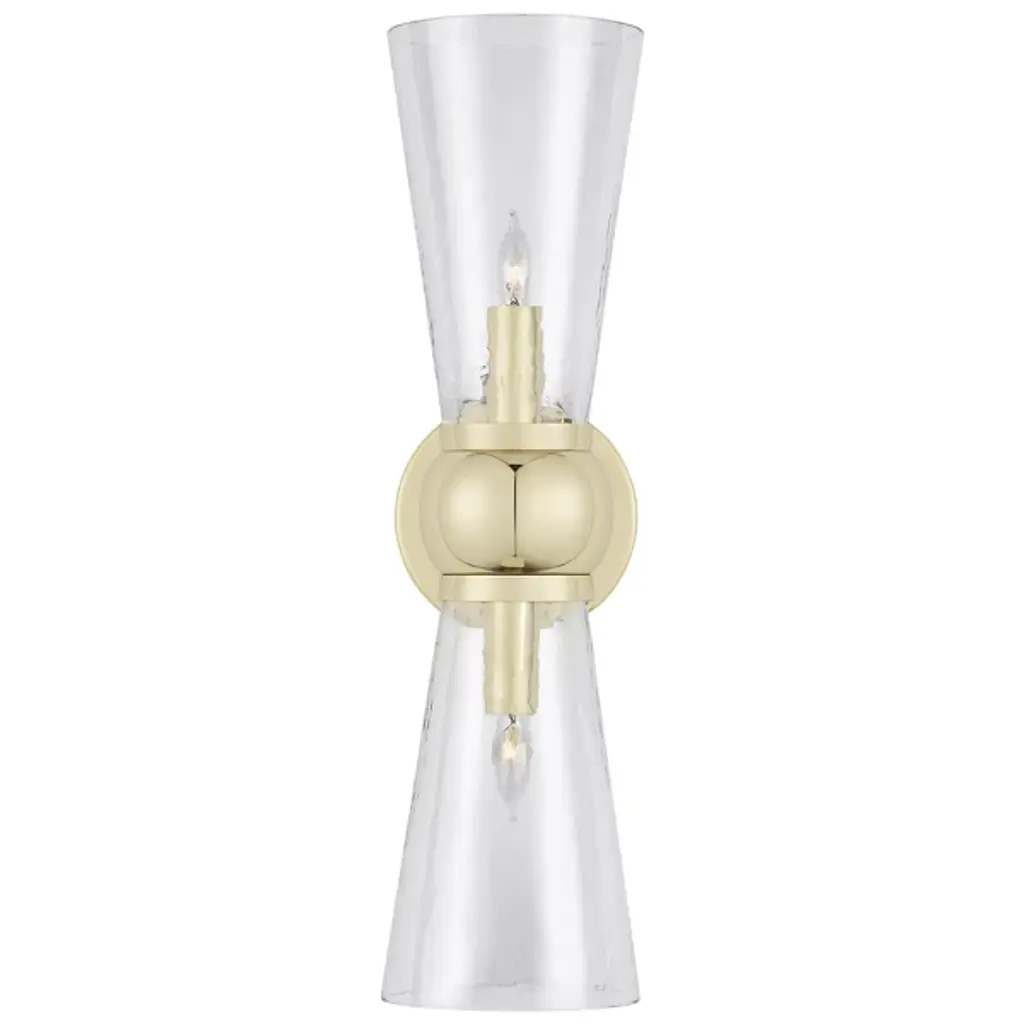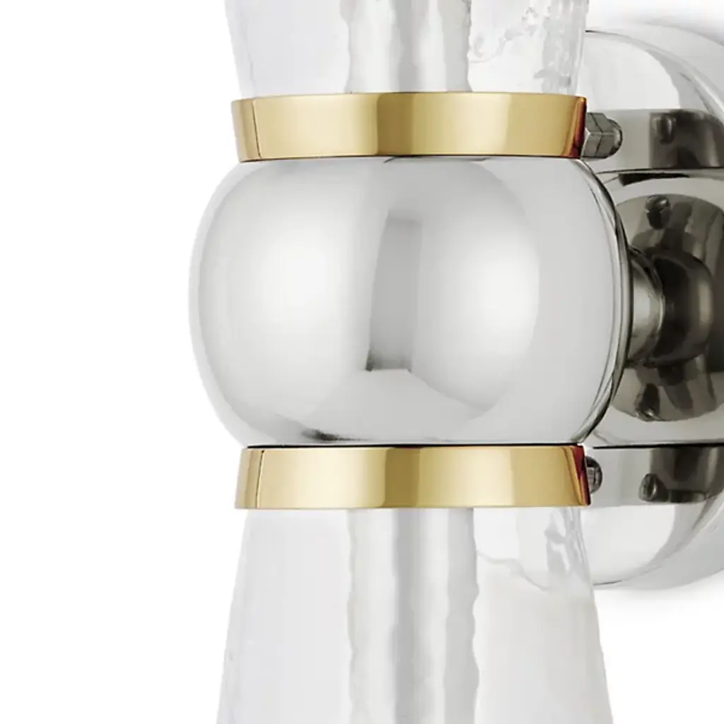 The Byford Bath Wall Sconce from Currey & Company pairs conical glass diffusers with precise metalwork. The hammered glass cones spread light evenly across bathroom spaces while adding subtle texture to the illumination. A spherical brass connector joins the two cones, creating a balanced composition around the central mounting plate. This lighting solution suits both vanity areas and powder rooms, offering practical brightness with polished details. The combination of materials delivers both function and refinement to bathroom lighting needs.
