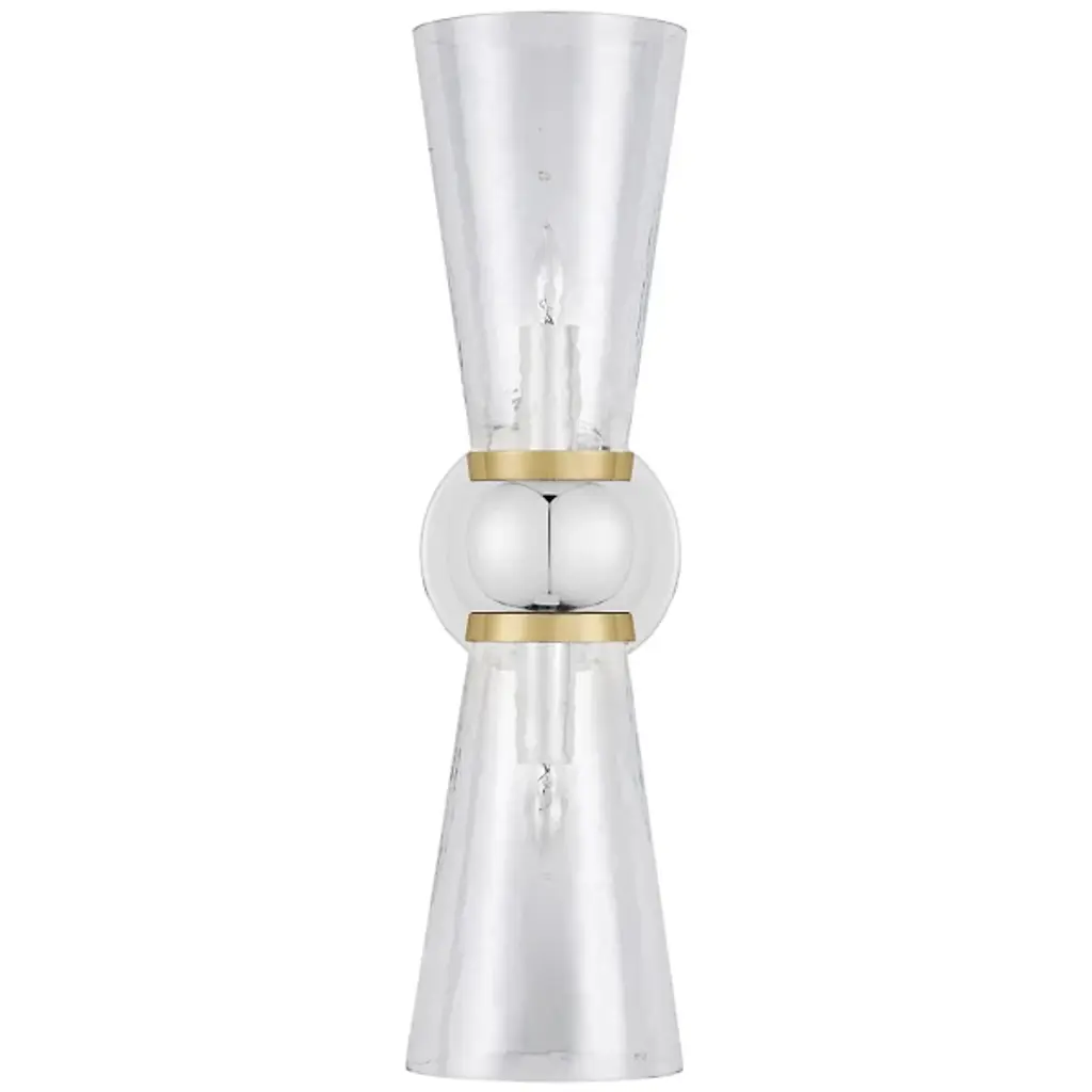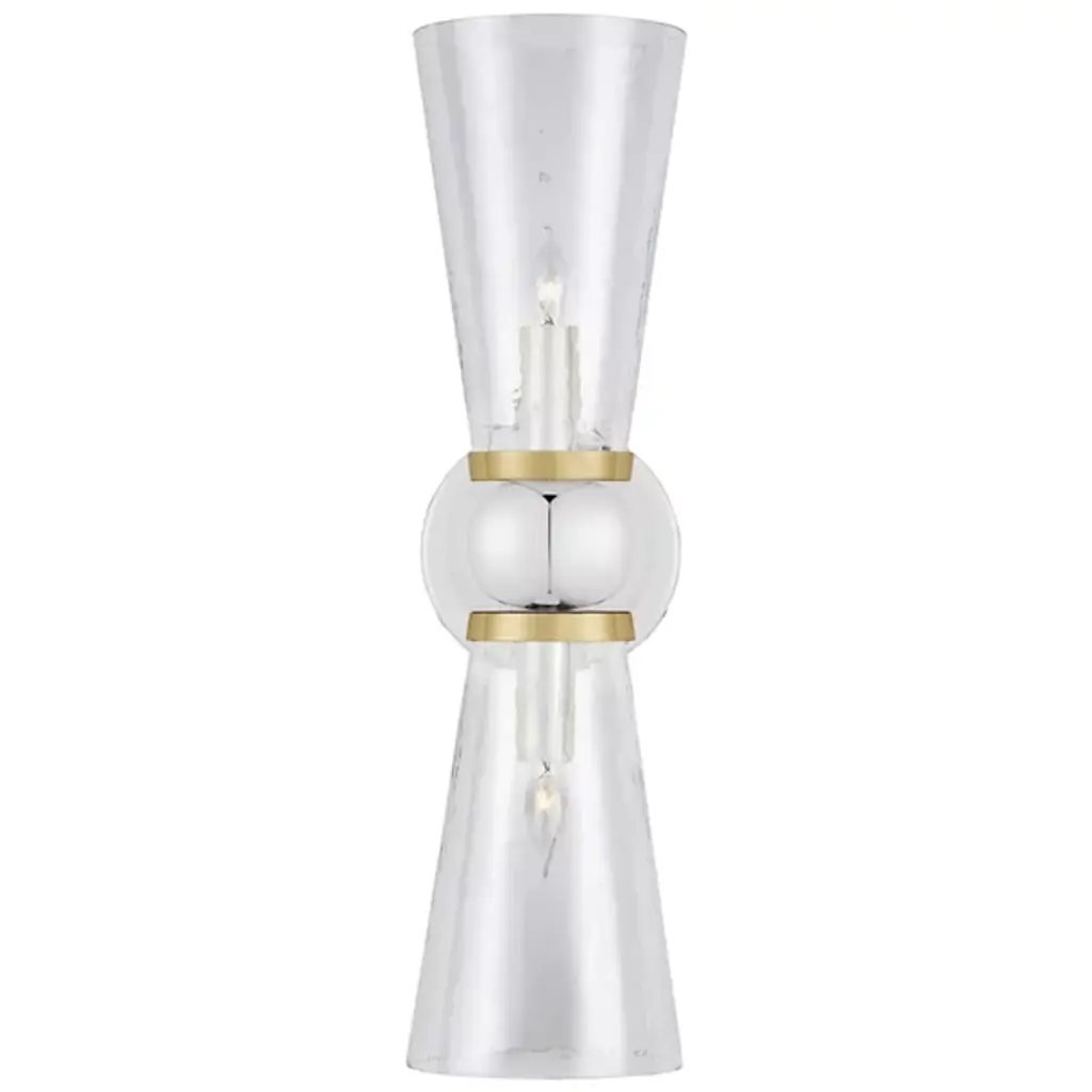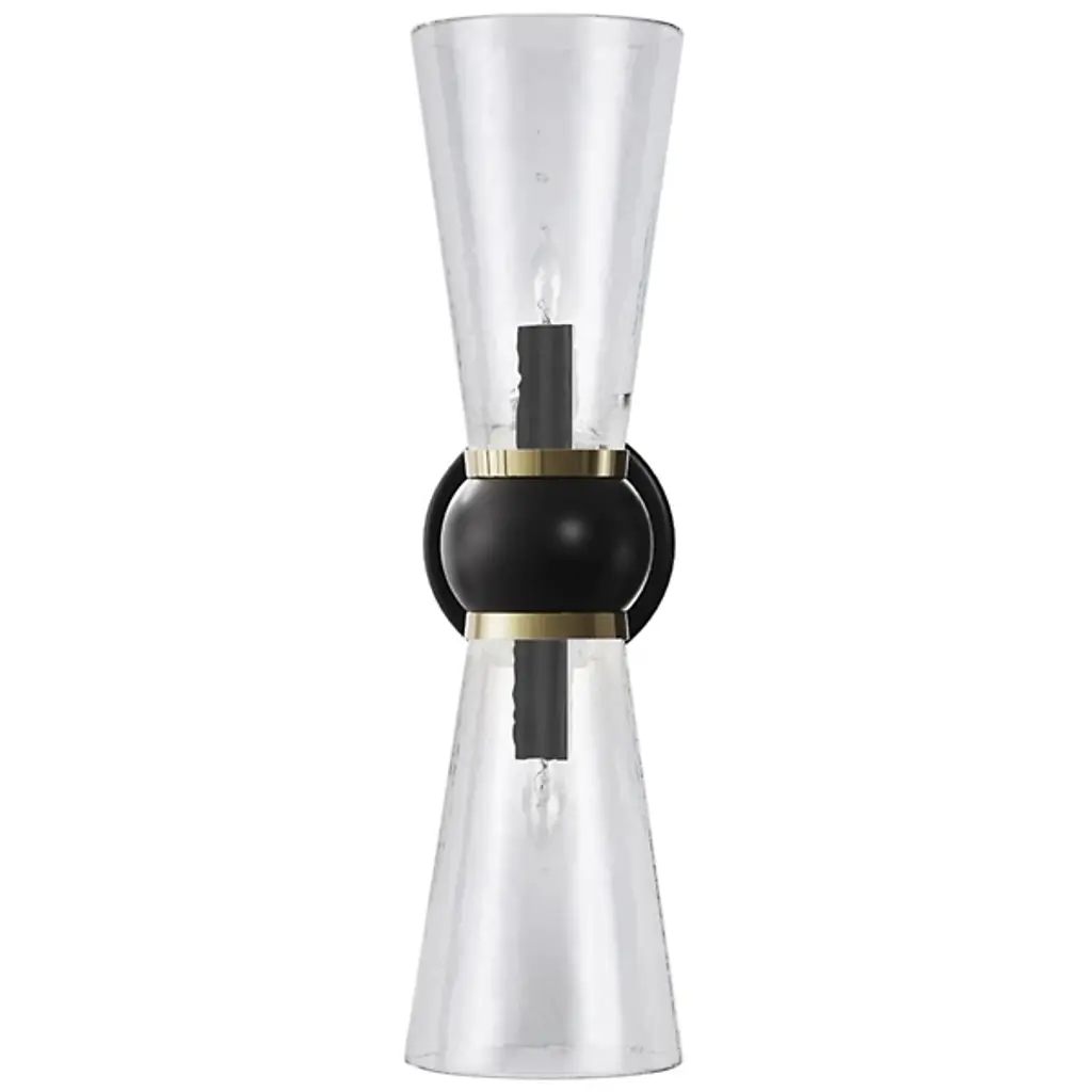 The Byford Bath Wall Sconce from Currey & Company pairs conical glass diffusers with precise metalwork. The hammered glass cones spread light evenly across bathroom spaces while adding subtle texture to the illumination. A spherical brass connector joins the two cones, creating a balanced composition around the central mounting plate. This lighting solution suits both vanity areas and powder rooms, offering practical brightness with polished details. The combination of materials delivers both function and refinement to bathroom lighting needs.