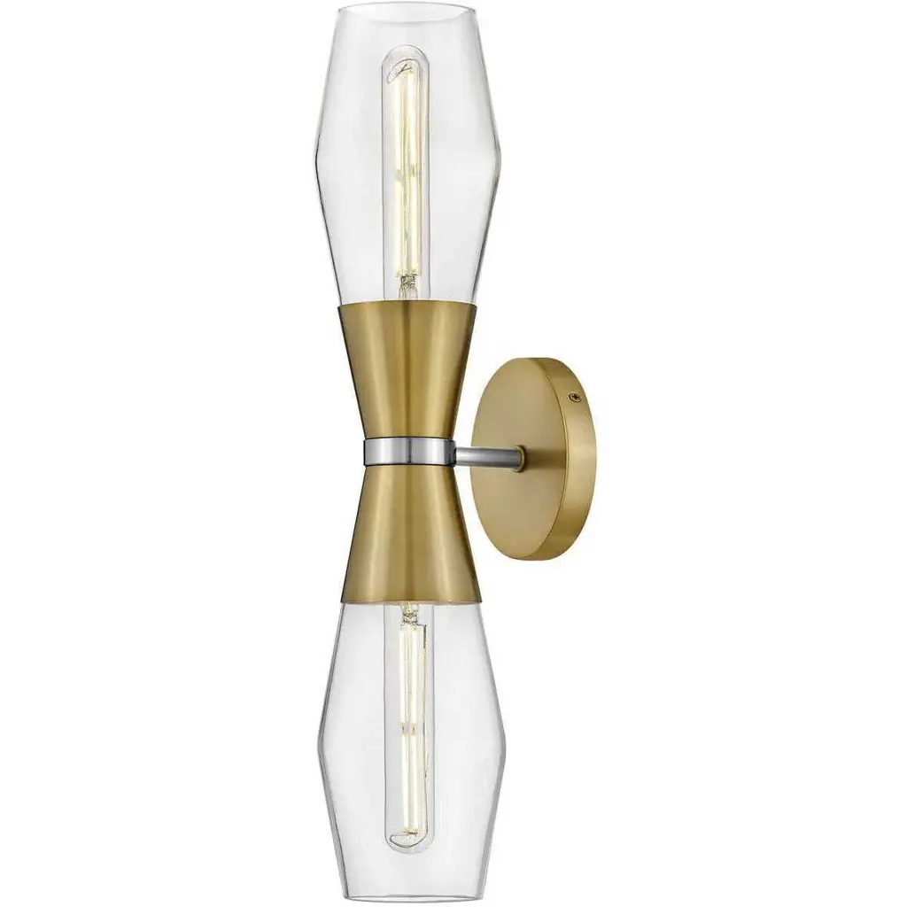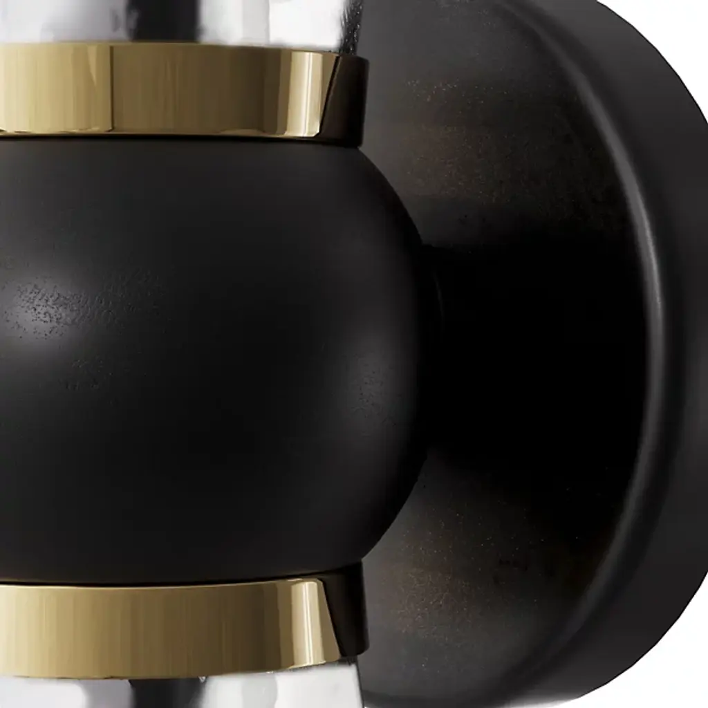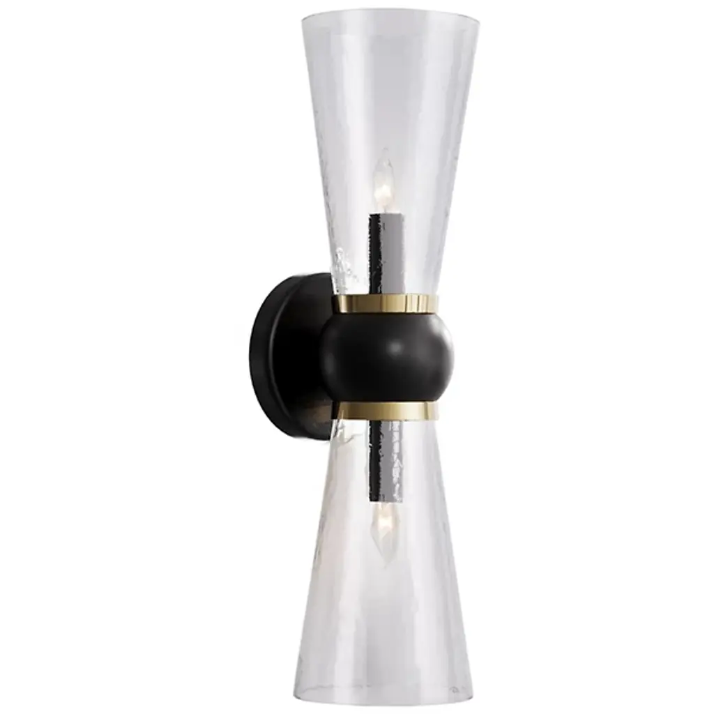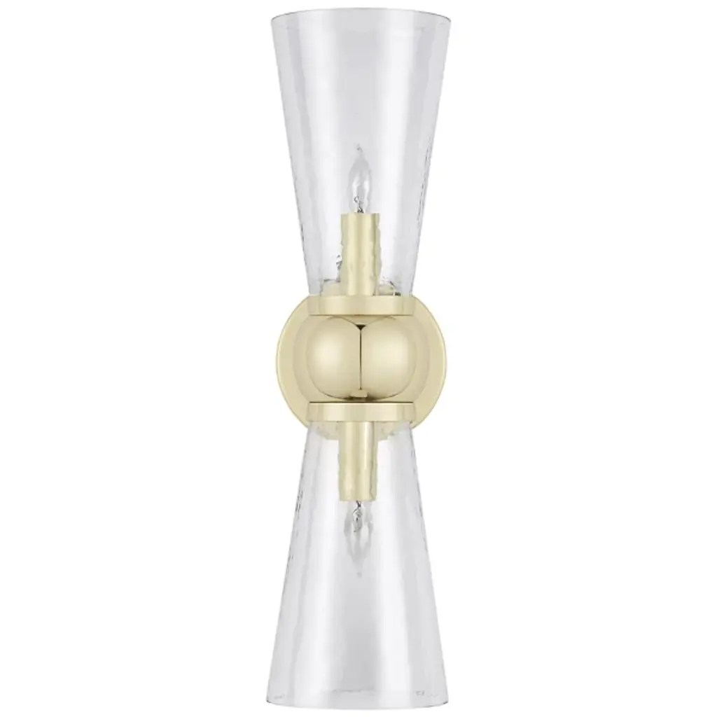 The Byford Bath Wall Sconce from Currey & Company pairs conical glass diffusers with precise metalwork. The hammered glass cones spread light evenly across bathroom spaces while adding subtle texture to the illumination. A spherical brass connector joins the two cones, creating a balanced composition around the central mounting plate. This lighting solution suits both vanity areas and powder rooms, offering practical brightness with polished details. The combination of materials delivers both function and refinement to bathroom lighting needs.
