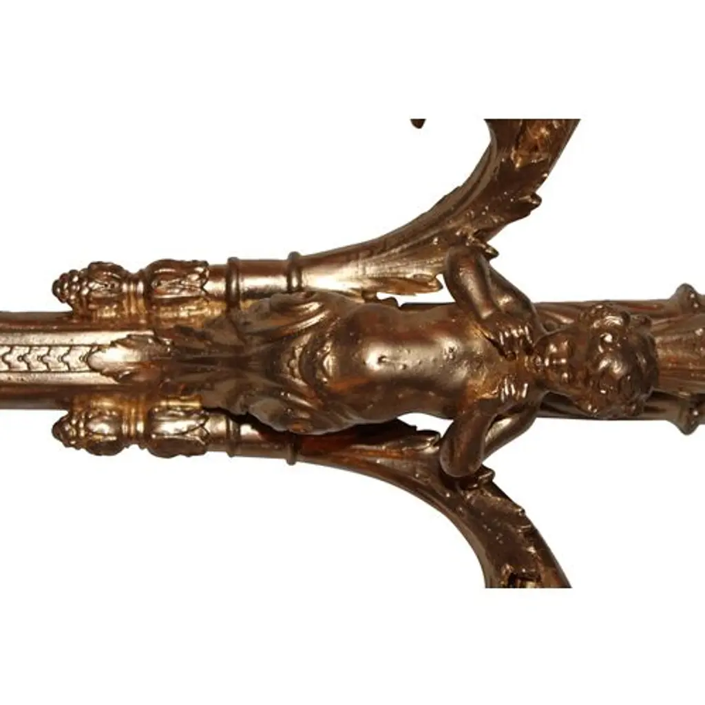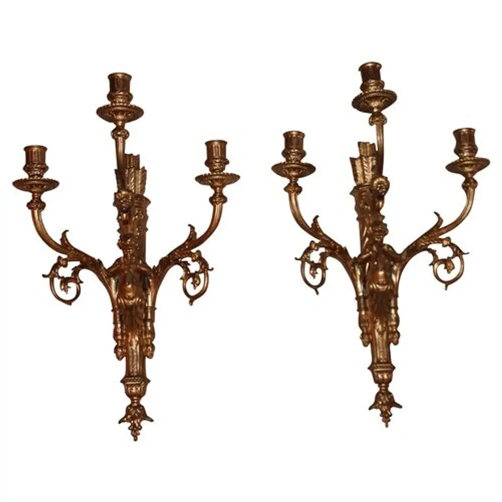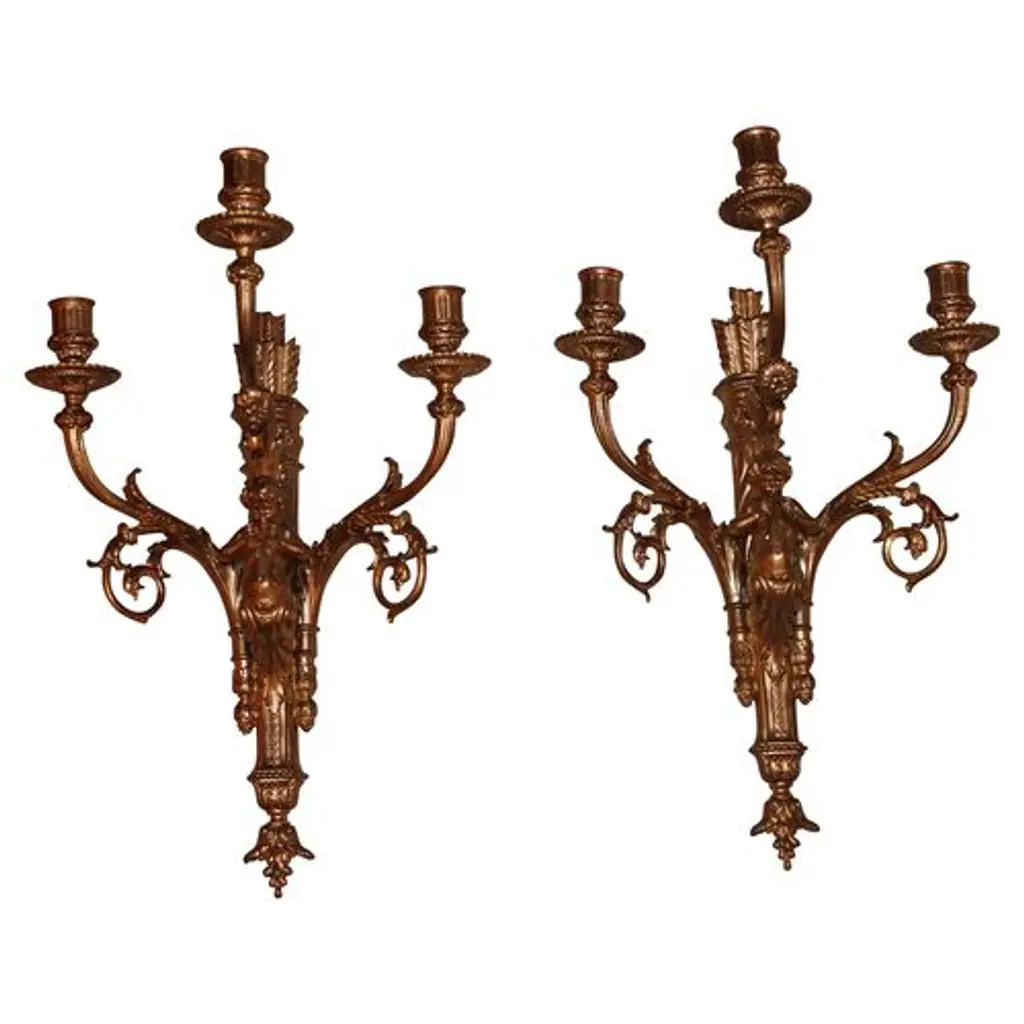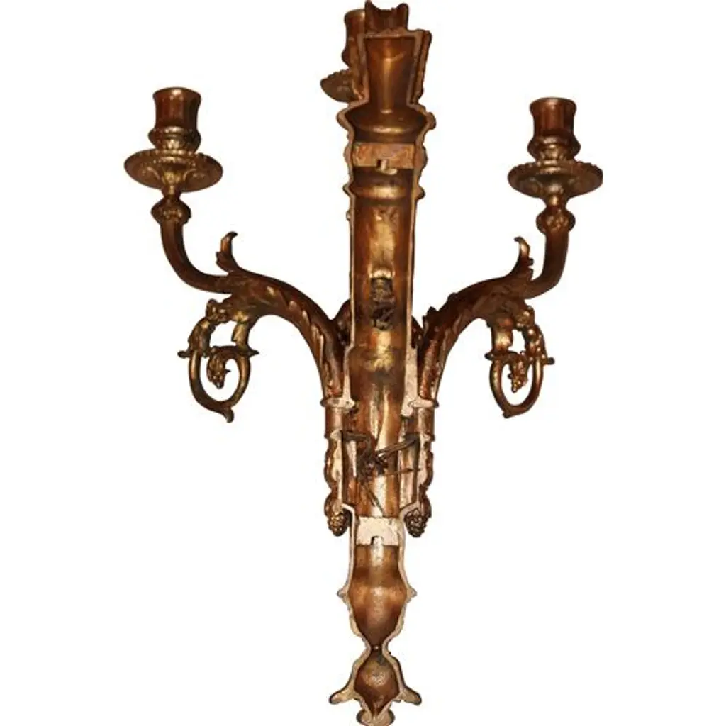 Pair of early-19th-century gilt-metal sconces with a cherub motif. Not electrified, but have been in the past and retain remnants of cloth wire.