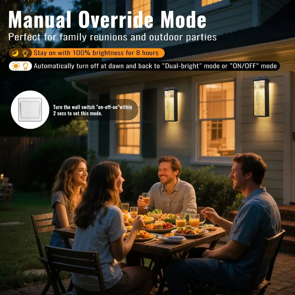 Give your outdoor space a modern charm with the LED Wall Sconce. It highlights a thick tempered glass panel with a waterfall texture that is securely placed at the front and back of this rich black frame. Capturing the light within each crevasse, the integrated LED creates a 3D effect as the light grazes against the surface. With a photocell sensor, the light fixture will auto-on at dusk and auto-off at dawn, bringing safety and convenience to outdoor spaces.