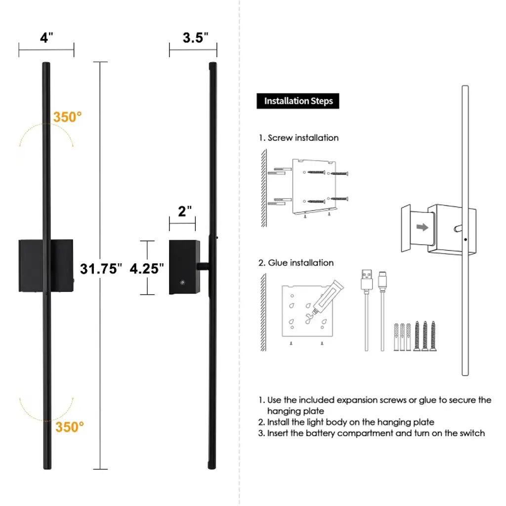 Upgrade your home lighting with this sleek modern rechargeable LED wall lamp, designed for both style and convenience. Featuring a minimalist metal design with an ultra-slim light bar, this wall-mounted lamp delivers customizable lighting with a 350° rotatable design, dimmable brightness, and 3CCT adjustable color temperature. Equipped with both touch and remote control, you can easily adjust the settings to suit your needs. Its built-in rechargeable battery and Type-C charging port ensure cordless operation, making it perfect for hallways, bedrooms, living rooms, staircases, or even reading nooks.