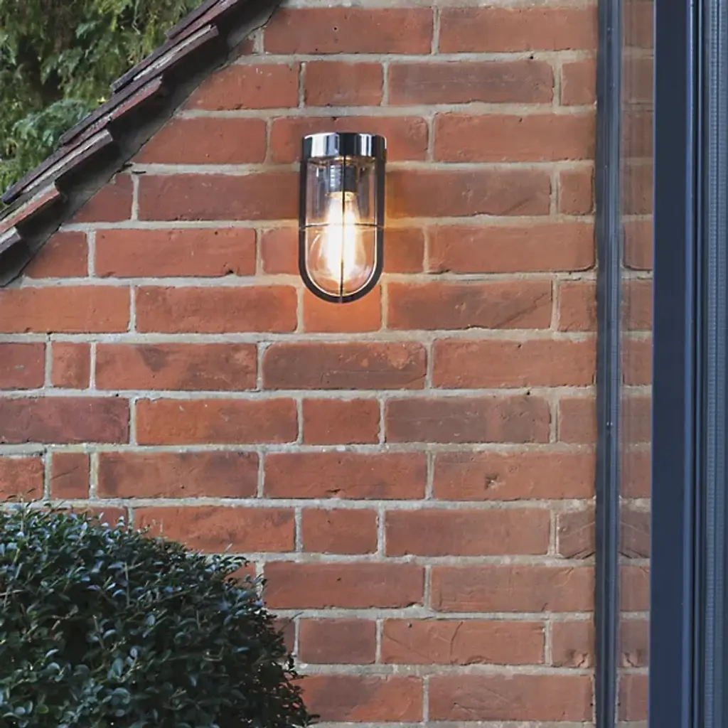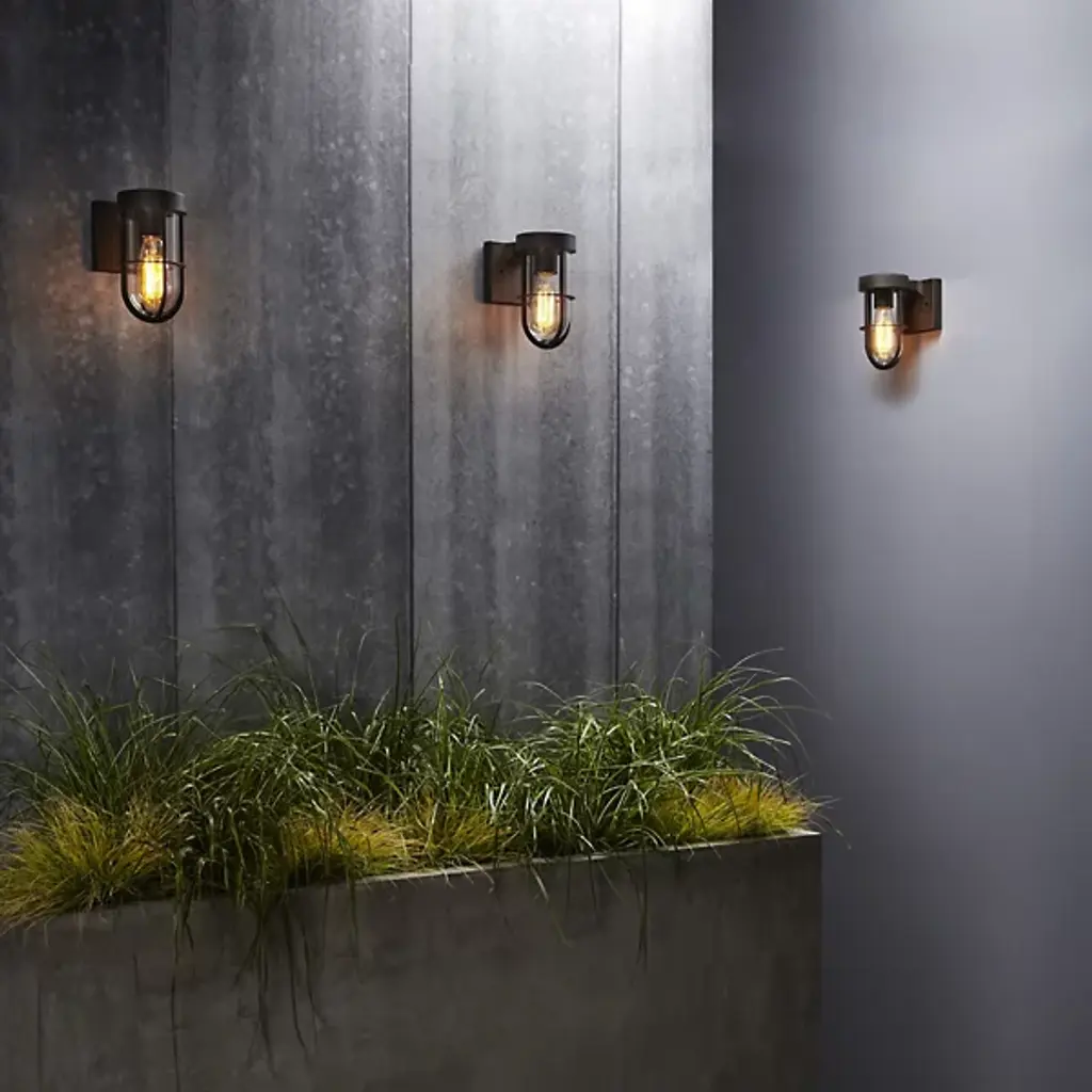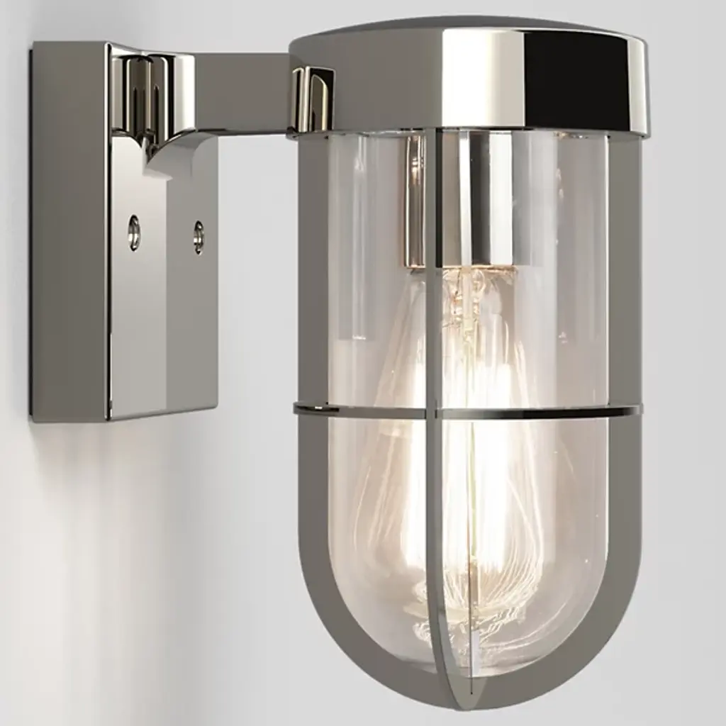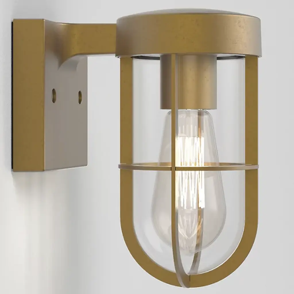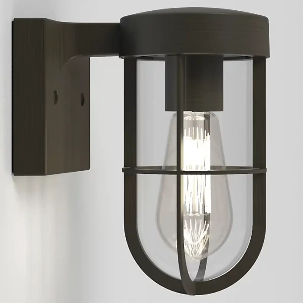 Offer a warm and welcoming beacon of light with the Cabin Outdoor Wall Sconce by Astro Lighting. This fixture is supported by a square backplate and a robust arm that holds a cylindrical shade. Clear glass enfolds an exposed incandescent bulb and socket while a series of slim metal bars surround the glass, curving over its rounded end to lend a geometric element and subtle coastal flair. Weather-resistant and complementary to a variety of exteriors, this piece brings modern style and functional light in any outdoor space.