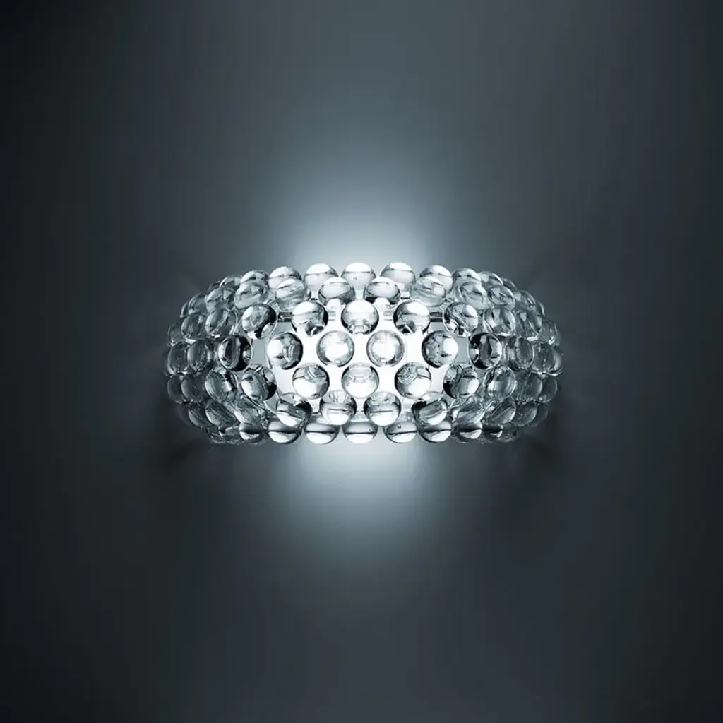 Rich, bright and sophisticated, the Caboche lamp is a mosaic of refraction, a perfect fusion of different personalities in one form, coming together to create the body and light effect of the lamp. When it is turned on, the light diffuses from inside the spheres like lots of bright crystals, lighting the surrounding environment. Caboche wall lamp is a jewel of creativity and technology, available in two sizes and Clear version. The lamp is the perfect protagonist for homes or public areas, uniting visual impact with lightness, decorative value and functionality. Features