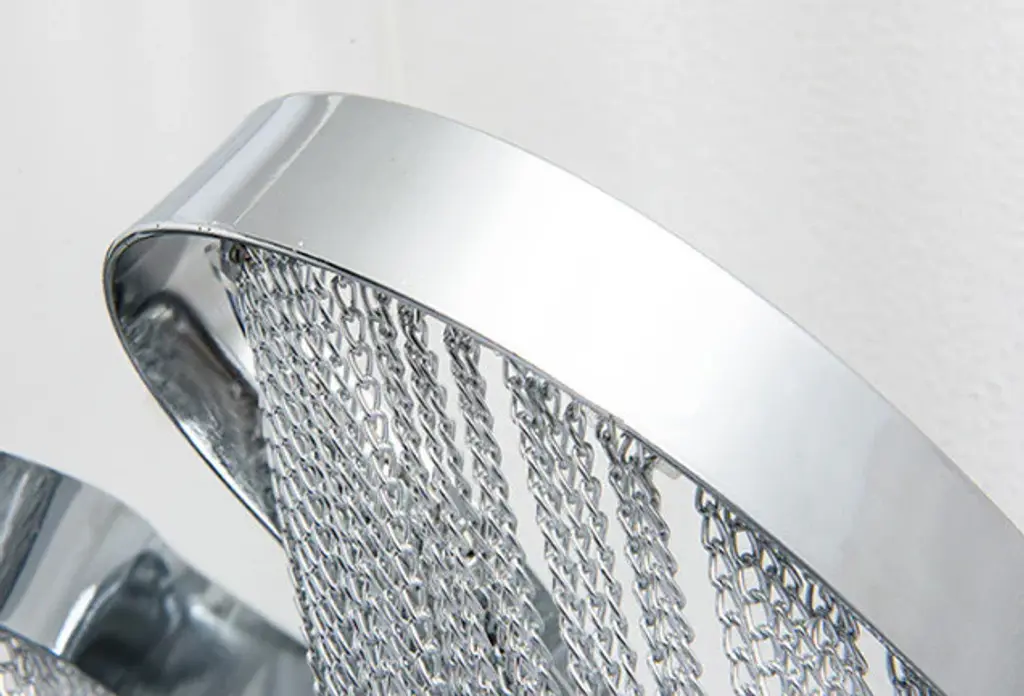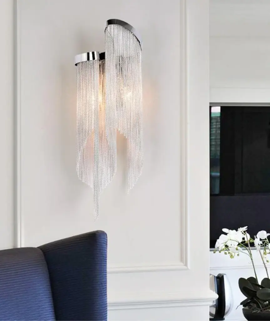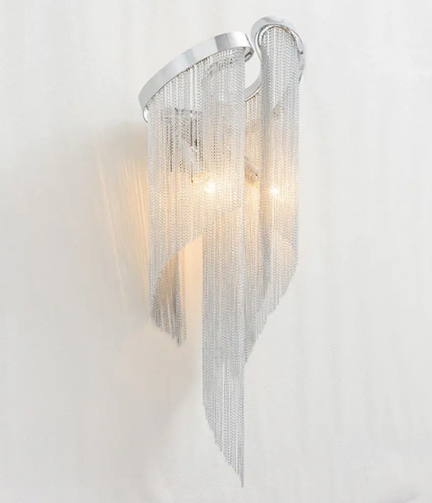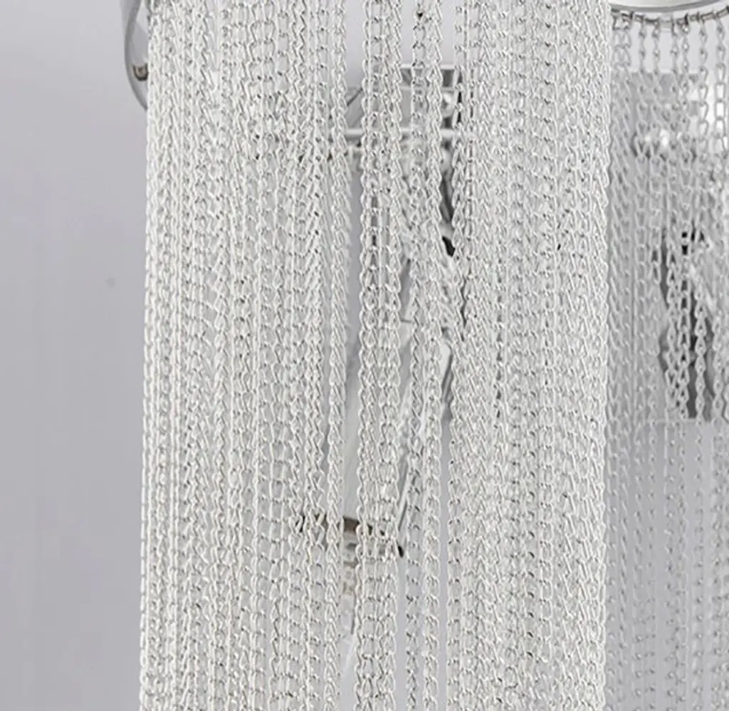 Made with high-quality electroplated stainless steel & aluminum materials, this unusual collection has received lots of compliments from our customers. Cadena Metal Chain Tassel Wall Sconce will create a beautiful showpiece for any interior.Material: Aluminum, Stainless SteelLight Source: 5W LED Bulbs (Included)Number Of Lights: 2 Height: 20"Width: 9,3"Voltage: 110-240VWarranty: 2 YearsApplication: Living Room, Dining Room, Bedroom, Hotel, Bar etc.