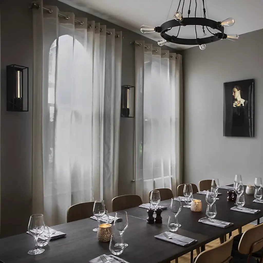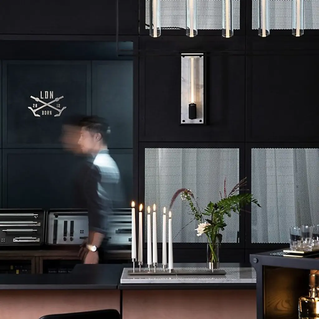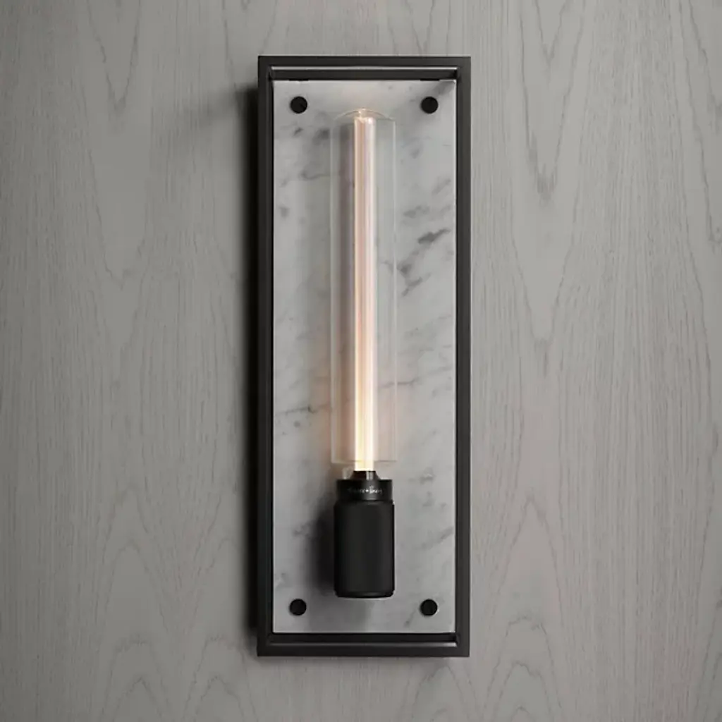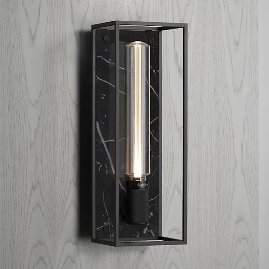 Present a measured retro appeal to indoor walls with the luxurious, expressive lines of the Caged Large Wall Sconce from Buster + Punch. Stepping out from a rectangular wall mount, it adds a backing plate enriched with naturally-veined marble, polished to a smooth sheen. A single cylinder-shaped socket extends from the base of the wall plate, tastefully knurled and embossed with a Buster + Punch signature. A rectangular prism in textured steel extends around the lamping, keeping the marble and socket construction on full display, ideal for a signature Buster bulb that spreads even ambiance around it.