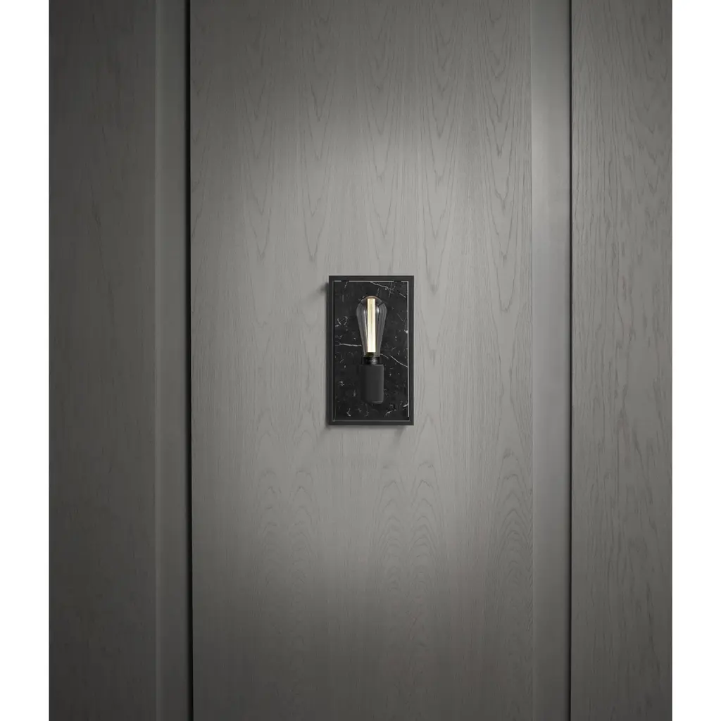 A wall light made from a matt black metal cage and comes with a polished black marble back panel.