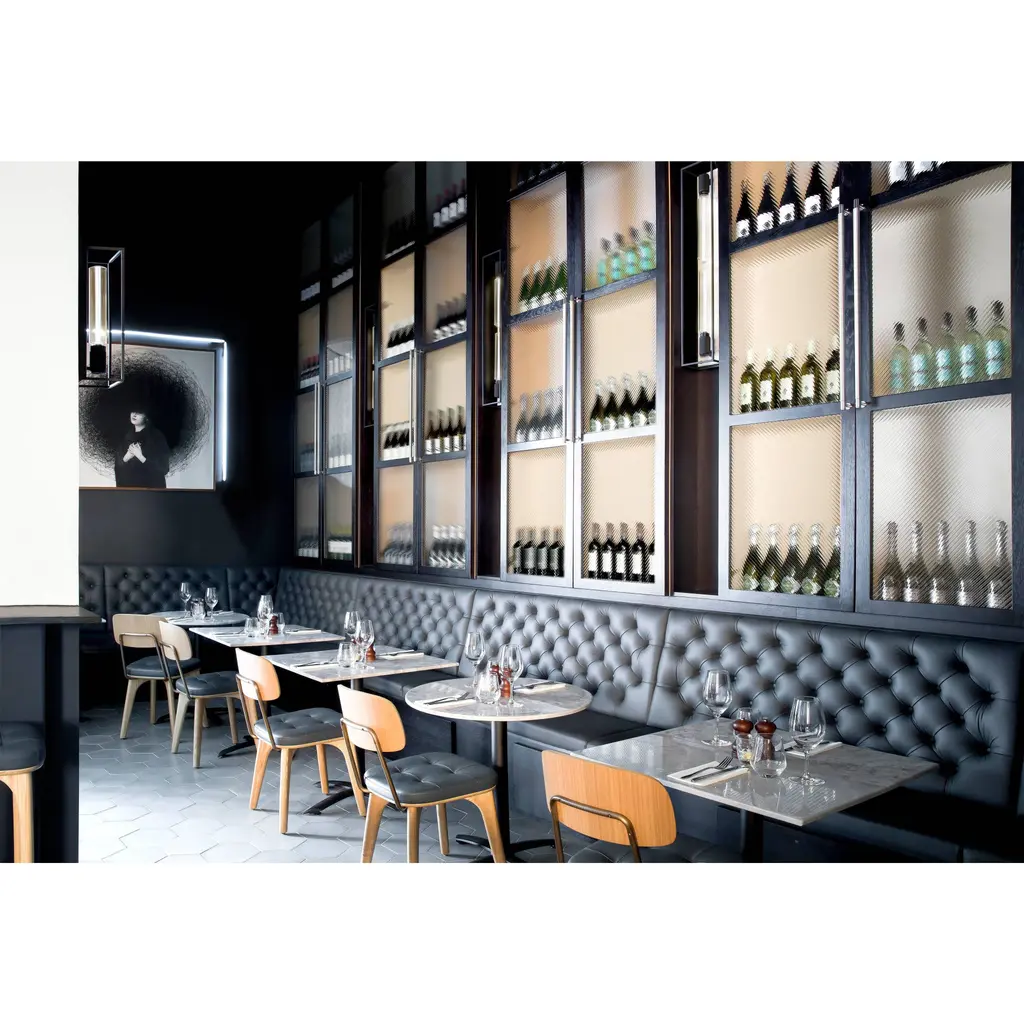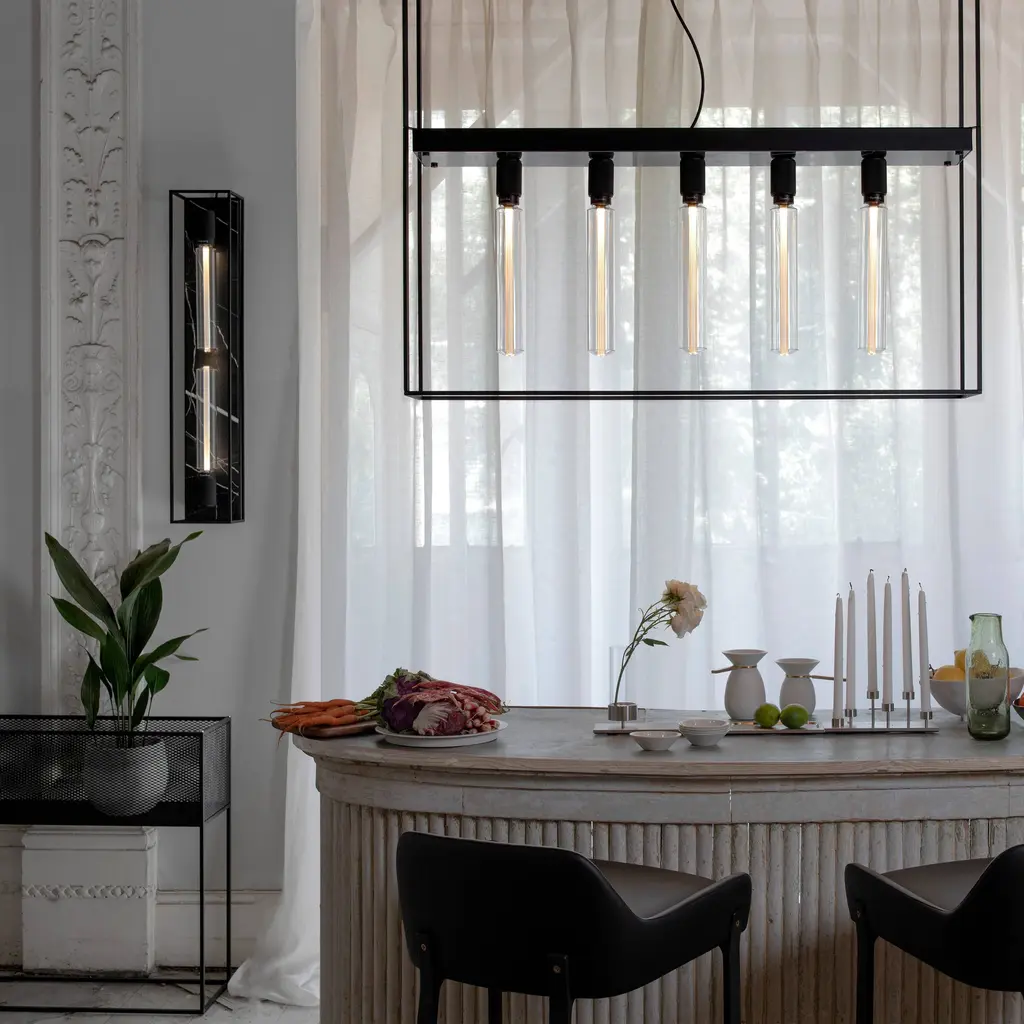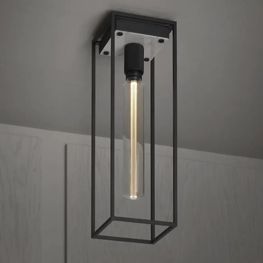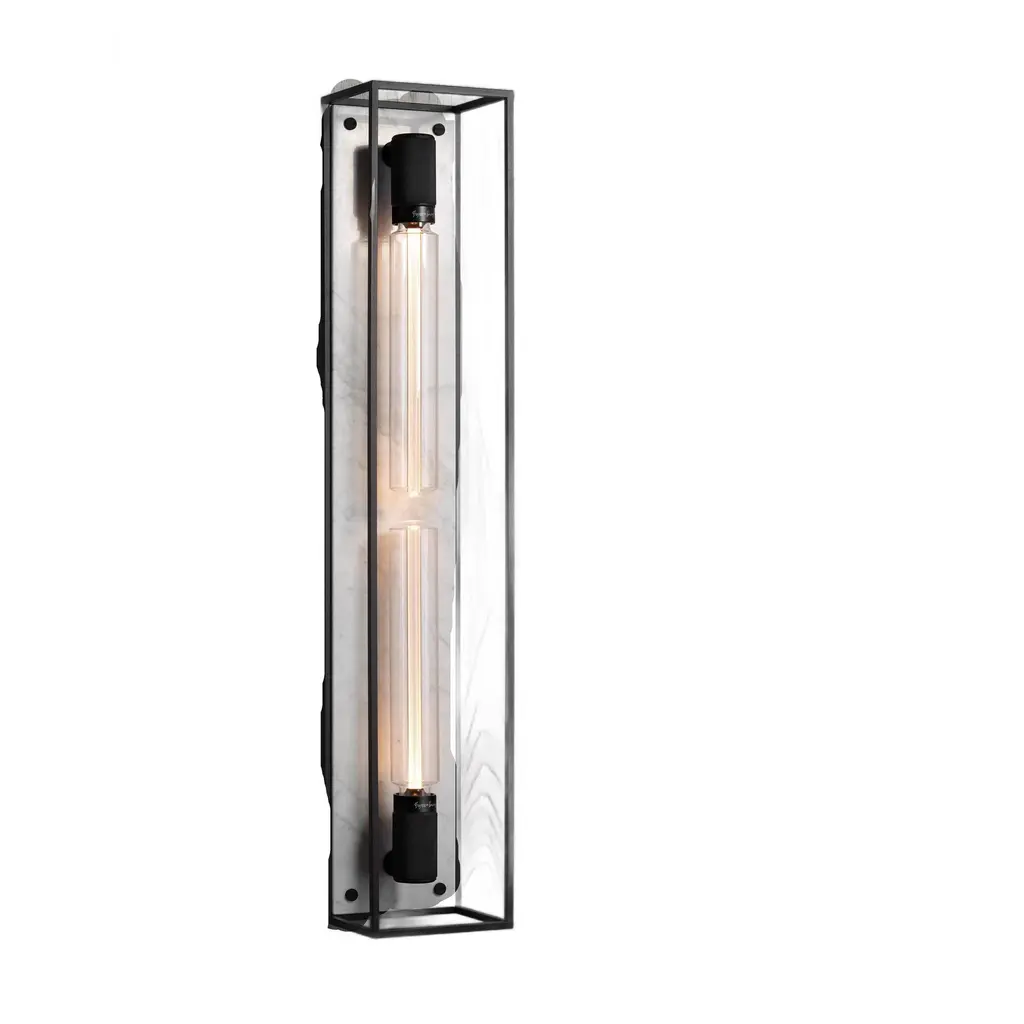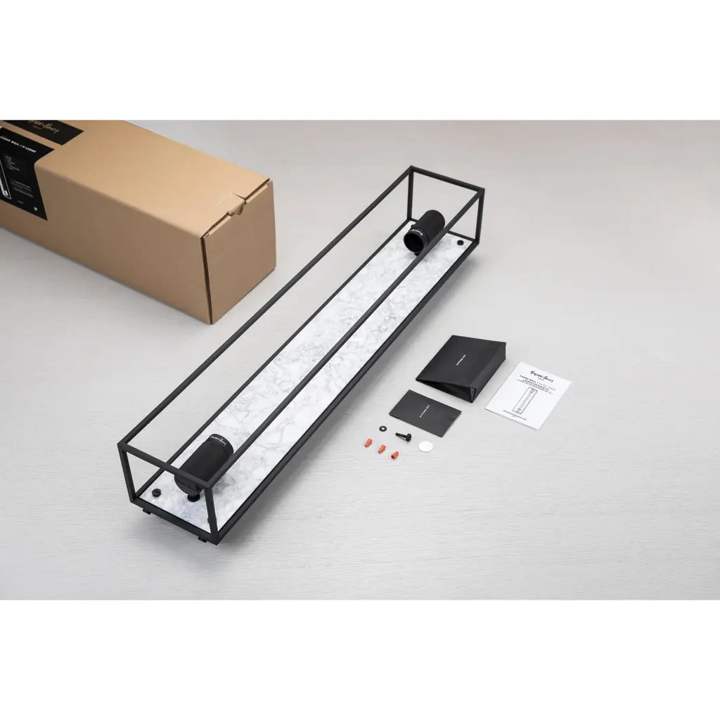 A wall light made from a matt black metal cage and comes with a polished white marble back panel.