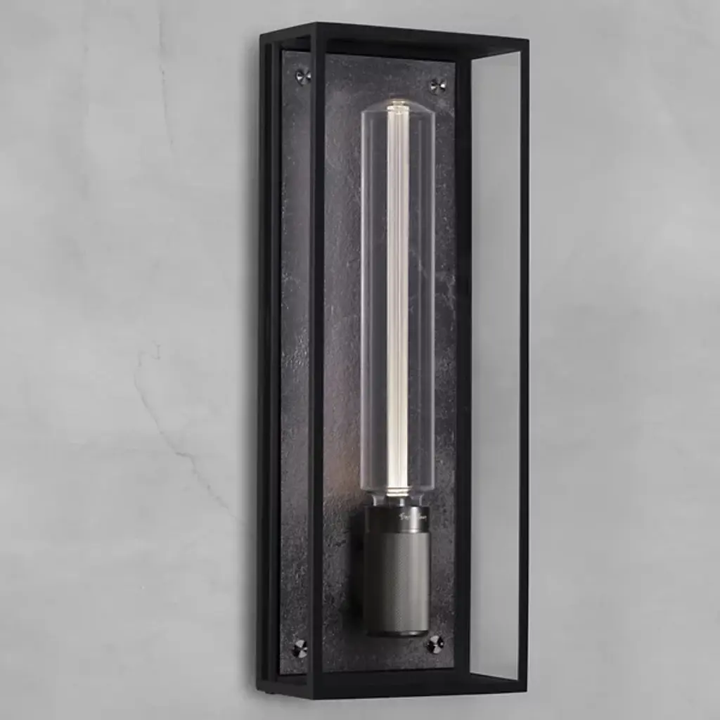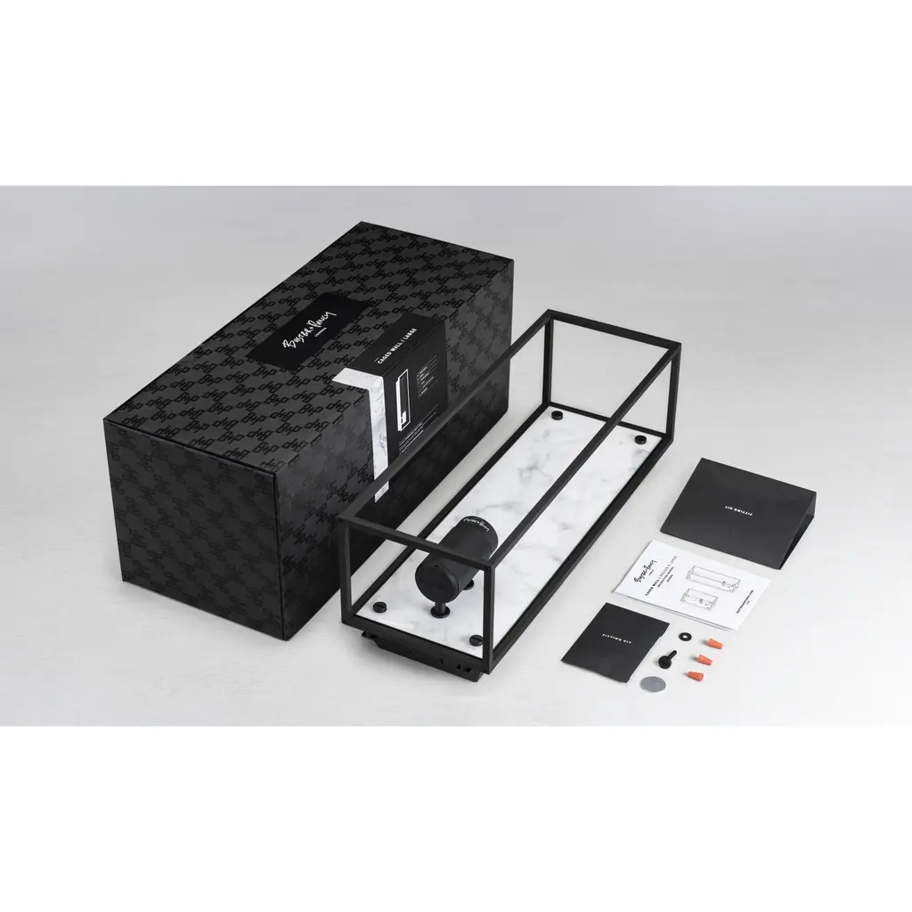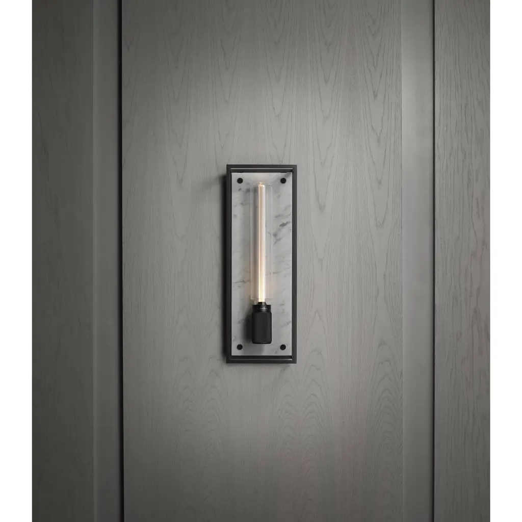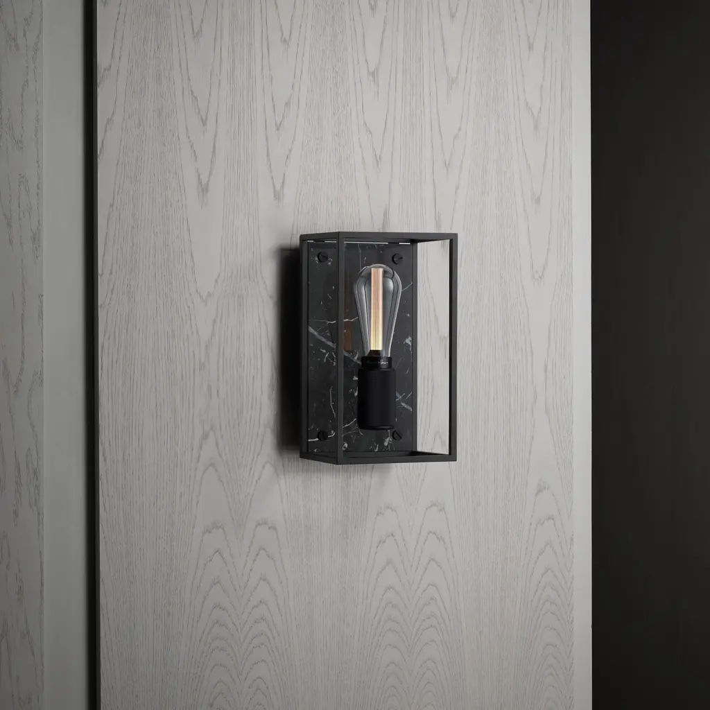 A wall light made from a matt black metal cage and comes with a polished white marble back panel.