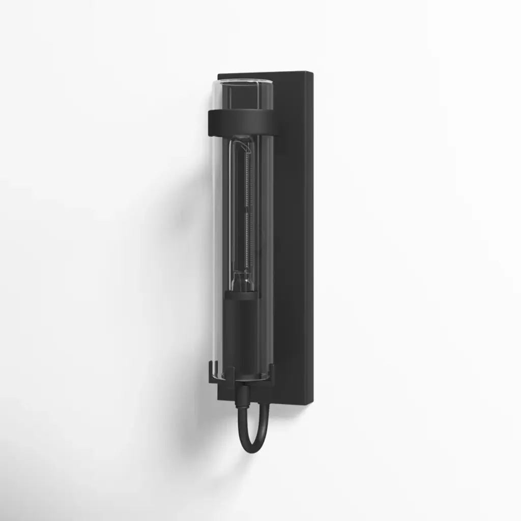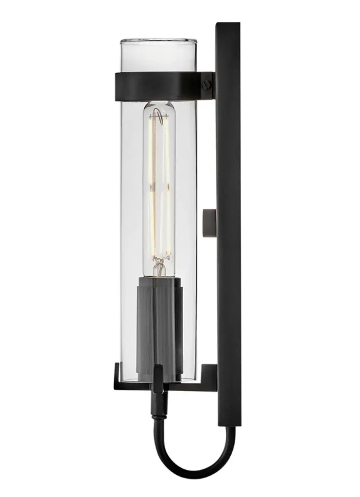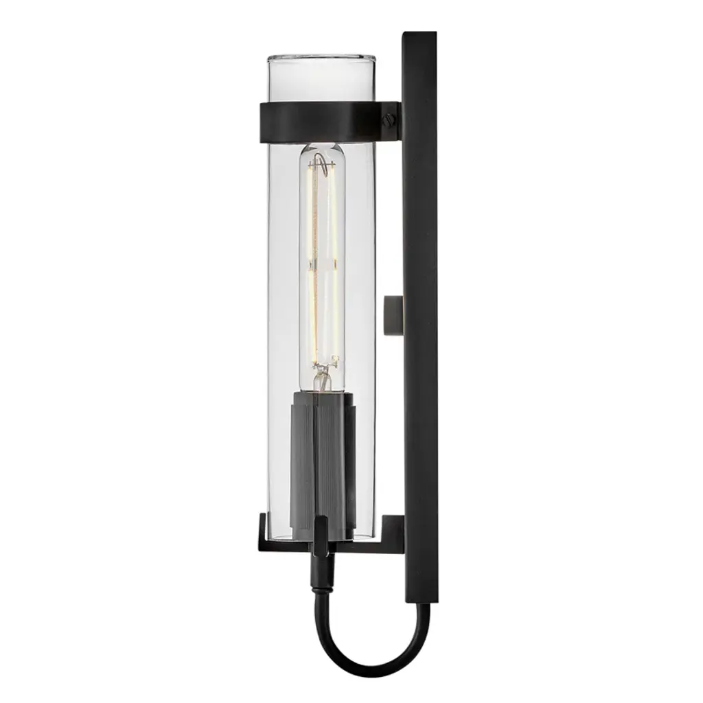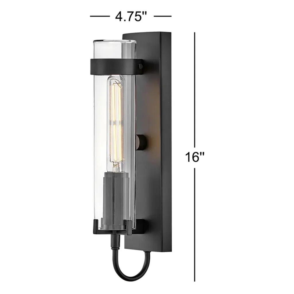 This Medium Outdoor Wall Sconce features an elongated, cylindrical Clear Glass shade that sits firmly inside heavy-cast metal prongs, encasing a T-Style LED bulb for a vintage, Industrial look. An additional ring at the top holds the glass in place. Decorative touches like the knurled, robust bulb socket and black metal tube, replicating a cord, give a traditional feel to this 16" tall wall lantern. Mounting hardware is hidden on the backplate to ensure a clean silhouette.