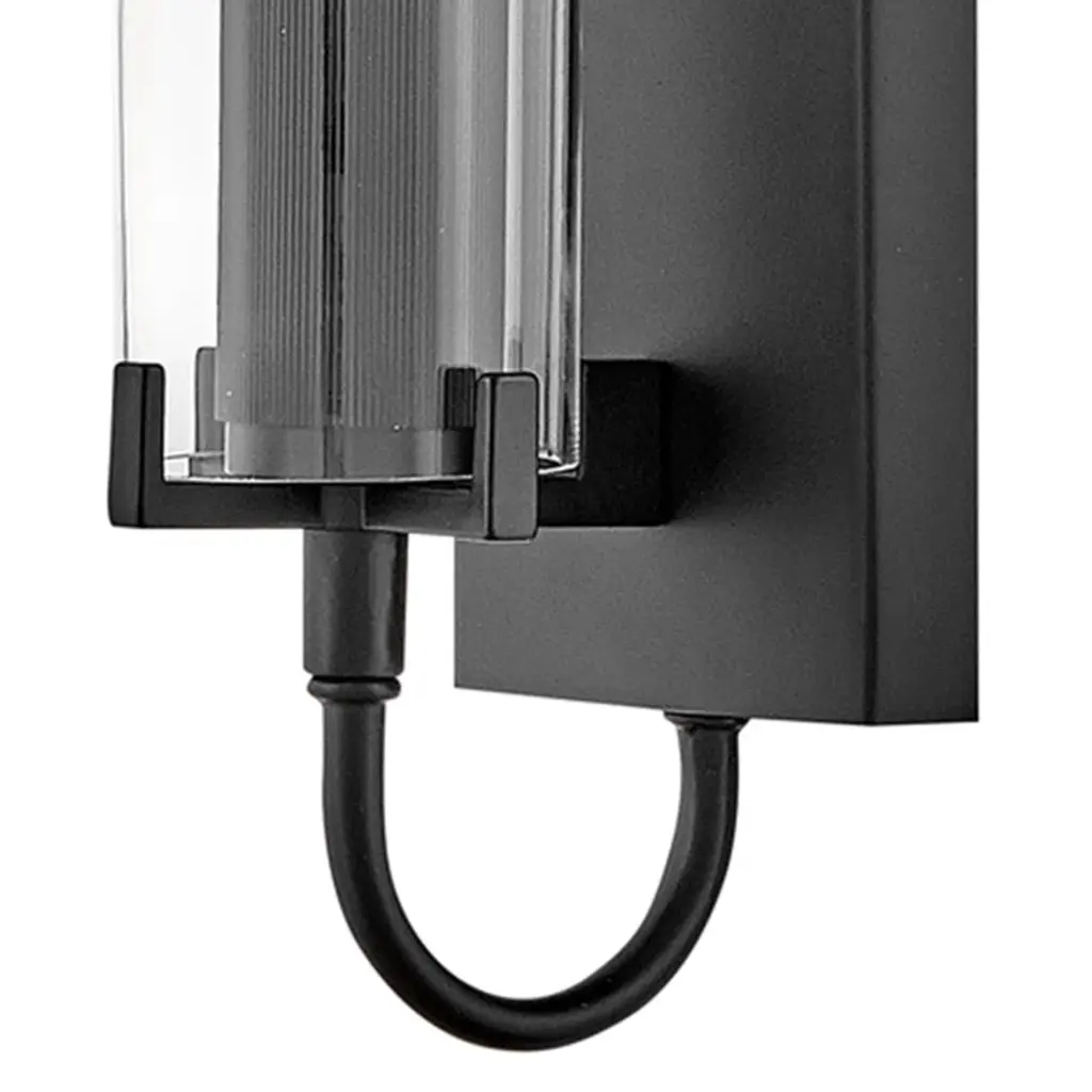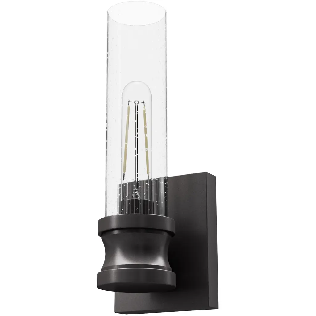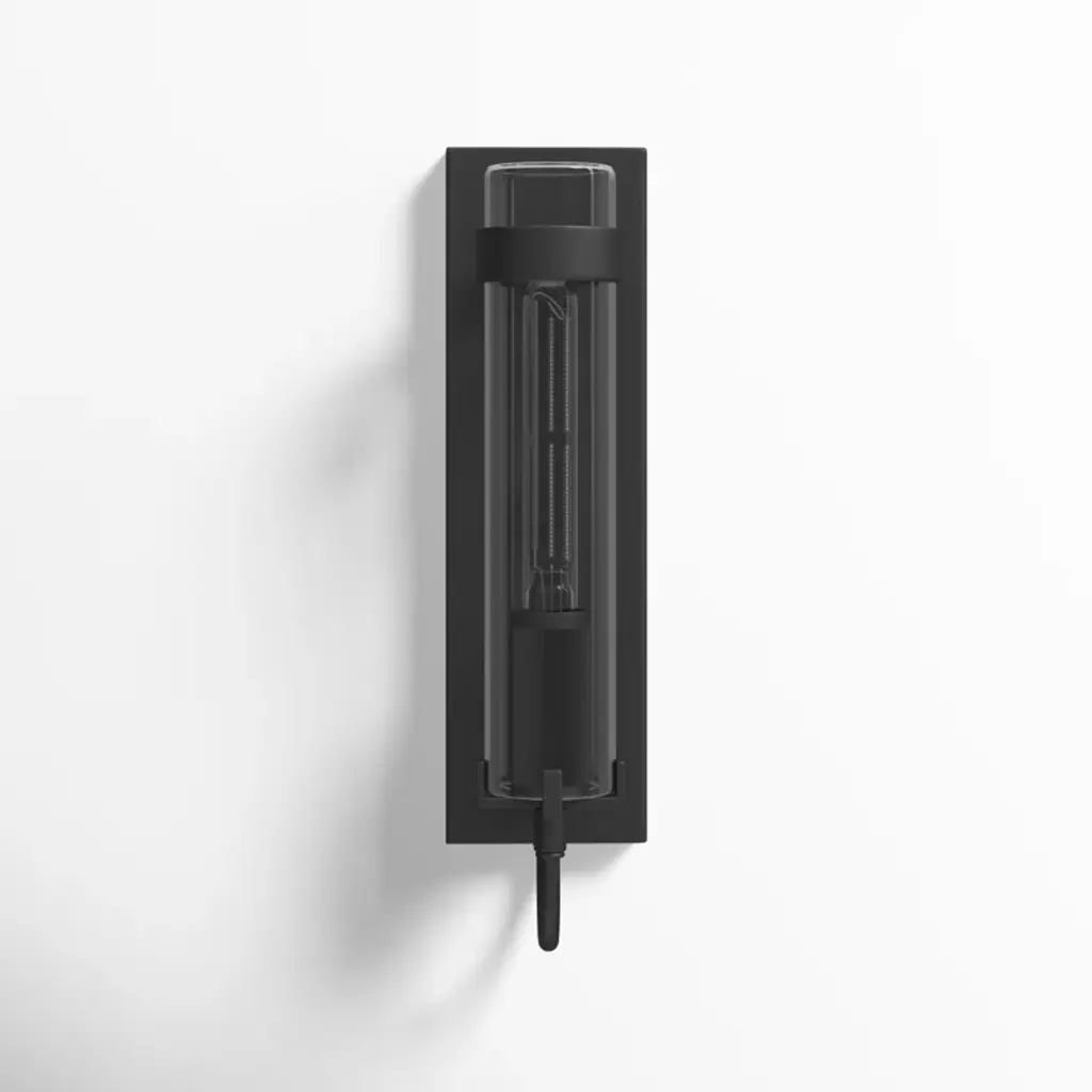 This Medium Outdoor Wall Sconce features an elongated, cylindrical Clear Glass shade that sits firmly inside heavy-cast metal prongs, encasing a T-Style LED bulb for a vintage, Industrial look. An additional ring at the top holds the glass in place. Decorative touches like the knurled, robust bulb socket and black metal tube, replicating a cord, give a traditional feel to this 16" tall wall lantern. Mounting hardware is hidden on the backplate to ensure a clean silhouette.