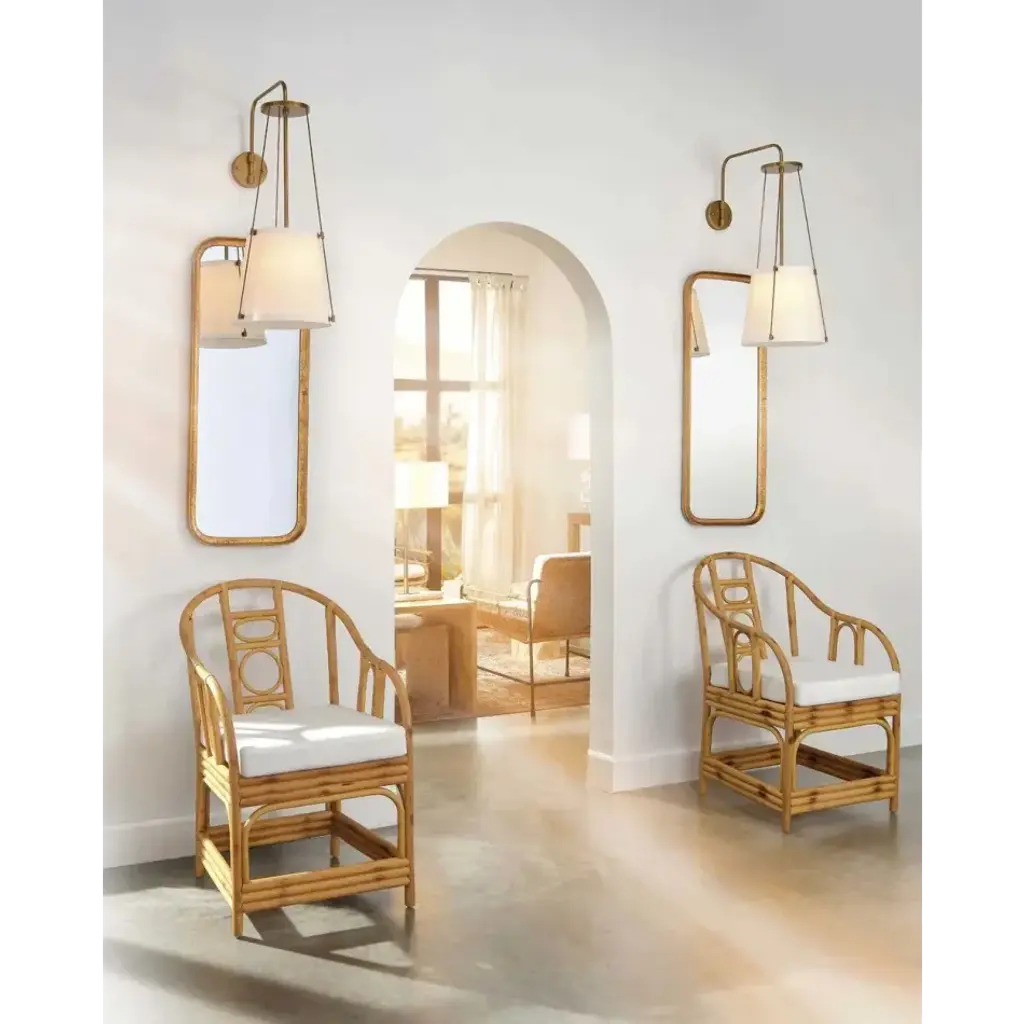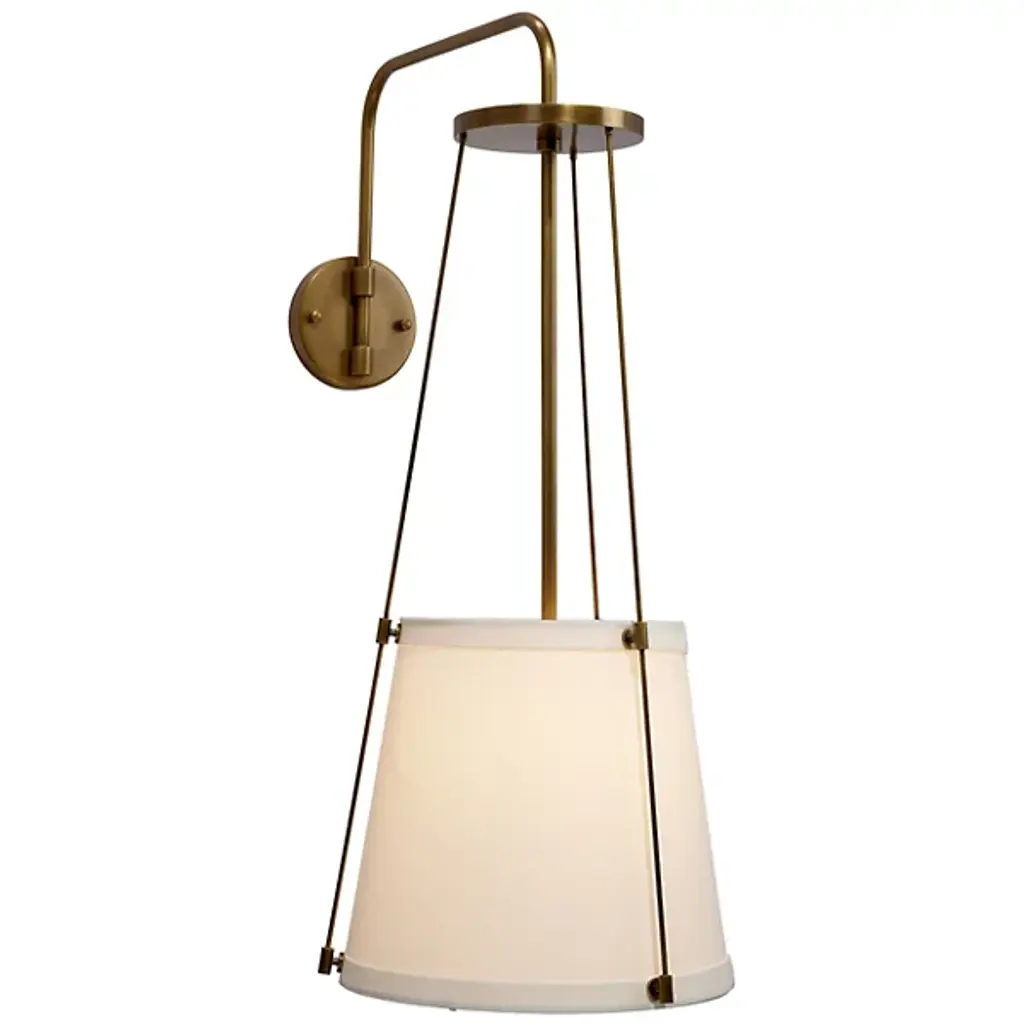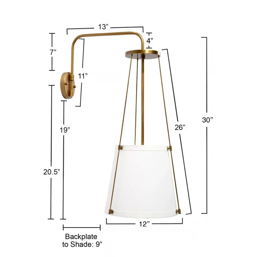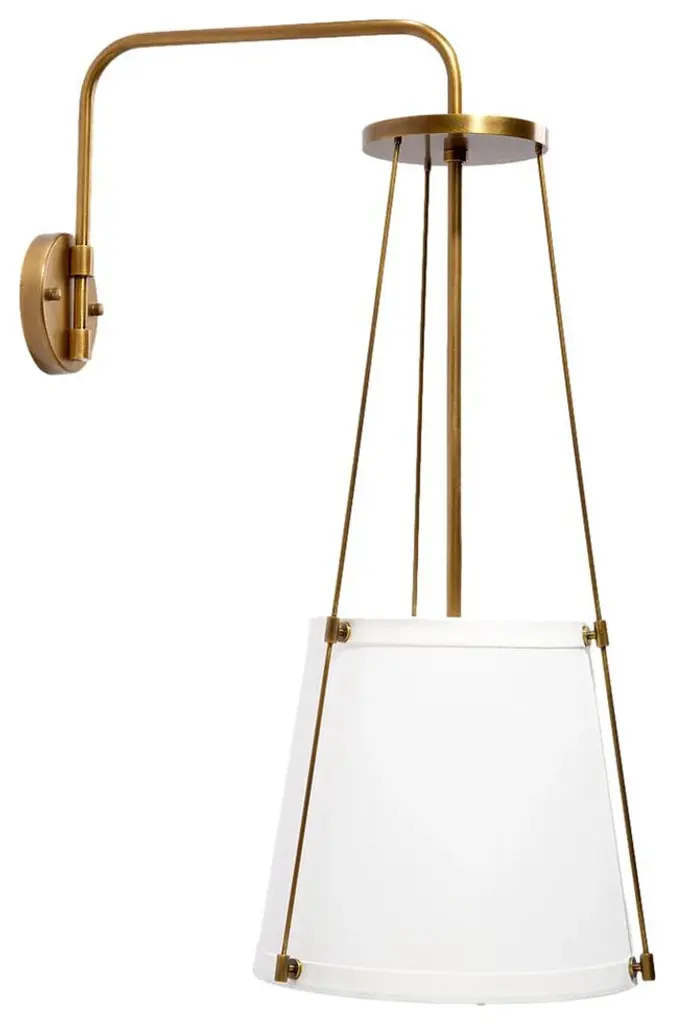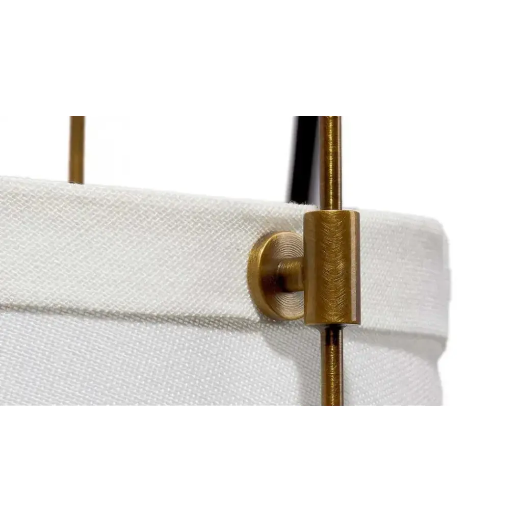 The sconce is suspended from a delicate metal framework with a modern metallic finish. Effortlessly appealing, it features an off-white drum shade in linen to softly diffuse its glow. Designer tip: display in pairs to flank a mirror, window, or doorway!