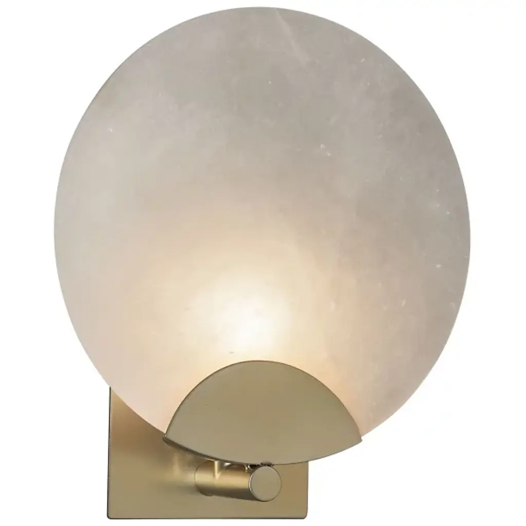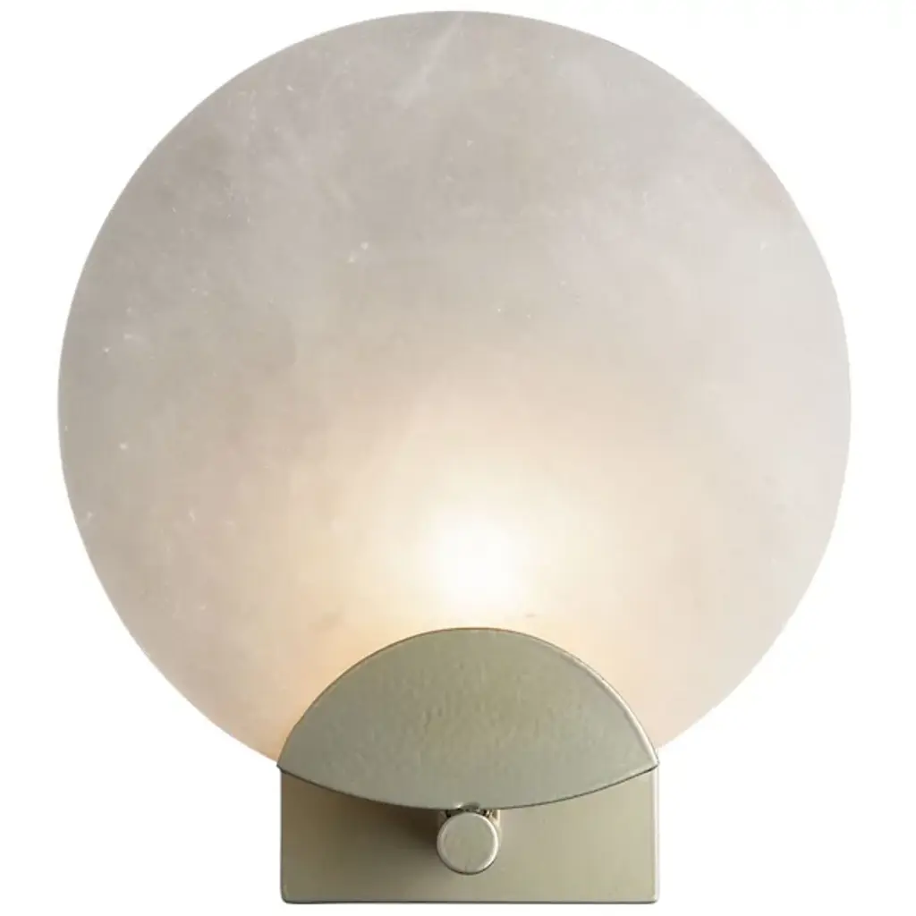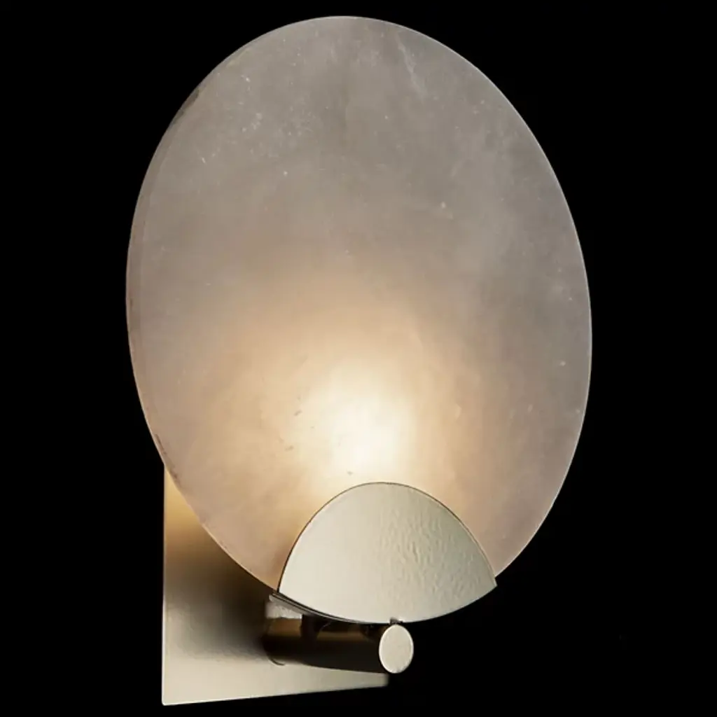 A timeless design crafted with time-honored techniques and materials. The Callisto Wall Sconce by Hubbardton Forge features a large, smooth disc of genuine alabaster, held within a minimal metal holder. Naturally translucent, the alabaster transforms the light produced by the bulb behind it into a soft wash of ambience. When the sconce is illuminated, the light also shows off the stone’s unique markings, giving modern dining areas and living spaces a dramatic touch of natural elegance. Designed by Ori Goldberg.