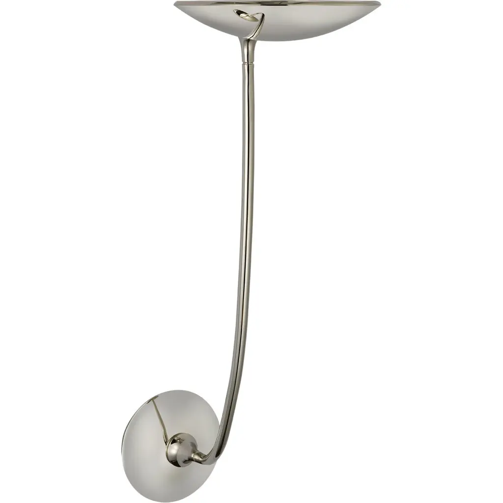 The Calvino LED Tail Wall Sconce by Visual Comfort Signature, formerly known as Visual Comfort, brings a minimal, modern twist to the classic torchiere style fixture. Anchored by a sleek, round wall plate, a tall stem is supported by a simple arm and balances a circular glass disk at its top that cradles an energy-efficient light source. The clean, pared-down composition of this wall sconce is dressed up with a beautiful and bold mix of finishes, offering spaces a tailored, handsome touch.