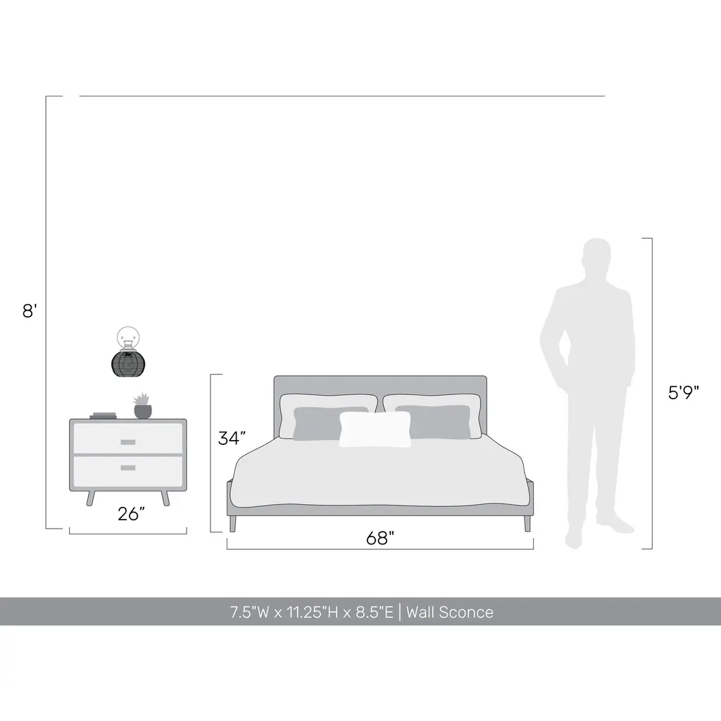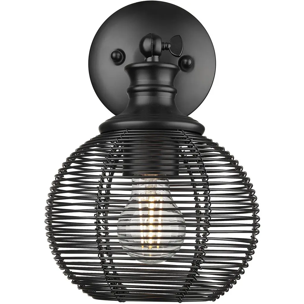 Bring industrial elegance into your home with the Golden Lighting Calypso 1-light Wall Sconce. Featuring a metal shade and a matte black frame, it creates a welcoming atmosphere.The metal shade boasts a classic matte black finish, with a non-reflective sheen that absorbs light, enhancing the warm glow of the exposed bulb. Its smooth surface adds a sophisticated touch to any room.The matte black finish is timeless and versatile, offering a perfect foundational element for cohesive design aesthetics.Ideal for enhancing hallways, stairways, and bathroomsthis sconce is Damp Location Rated, making it suitable for covered spaces with occasional moisture. It requires one E26 Medium base bulb (not included) with a maximum wattage of 60.Overall dimensions are 7.5"W x 11.25"H x 8.5"D, providing effective illumination while complementing various decor styles. Transform your space with quality lighting that exudes style and sophistication.